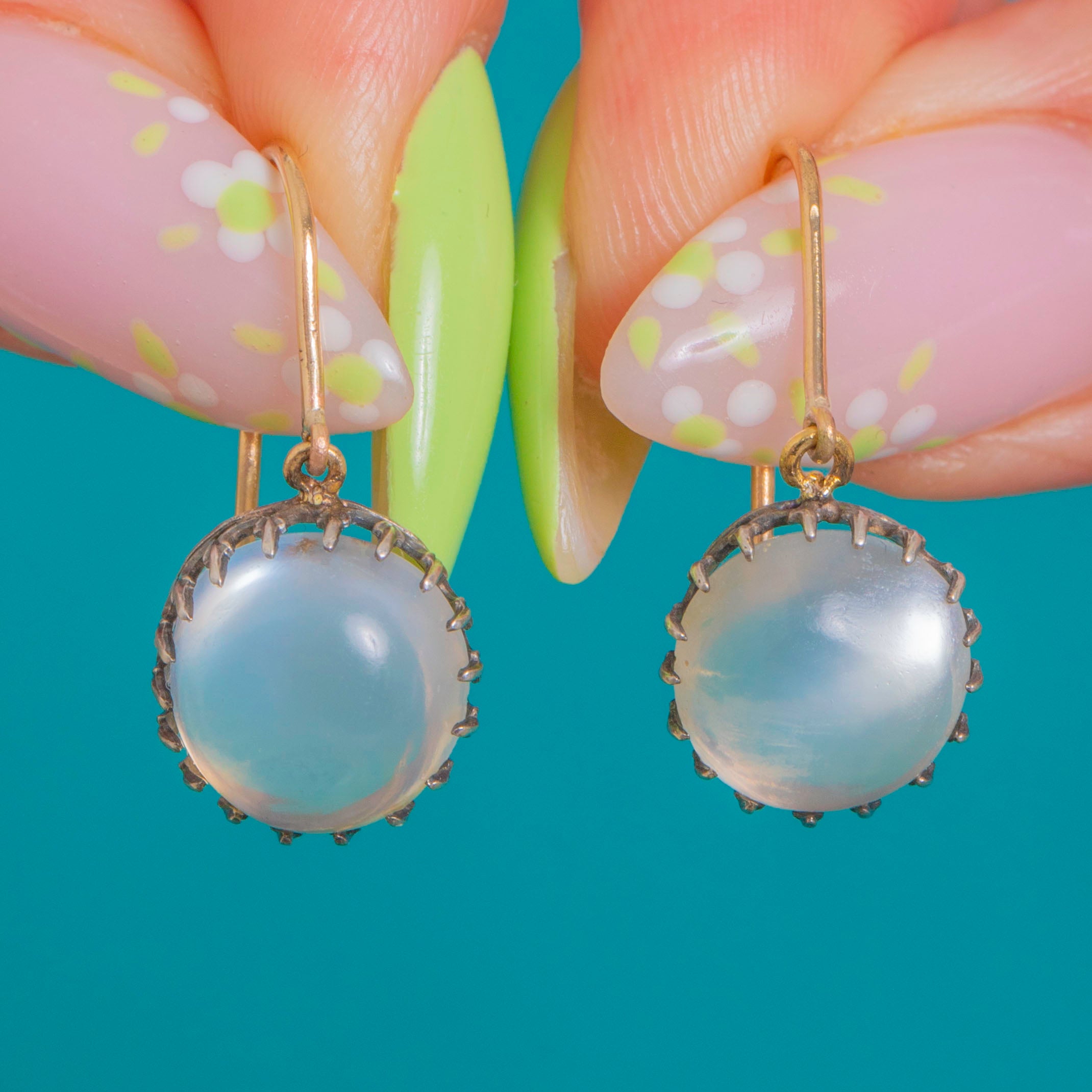 EXCELLENT: Moonstones are bright with only minor surface wear visible under magnification, free from chips or cracks. The serrated collet settings are secure with no missing claws, showing a pleasing light patina to the Silver and gentle age-related wear to the 9ct Gold hooks. Well cared for overall with no obvious signs of repair.