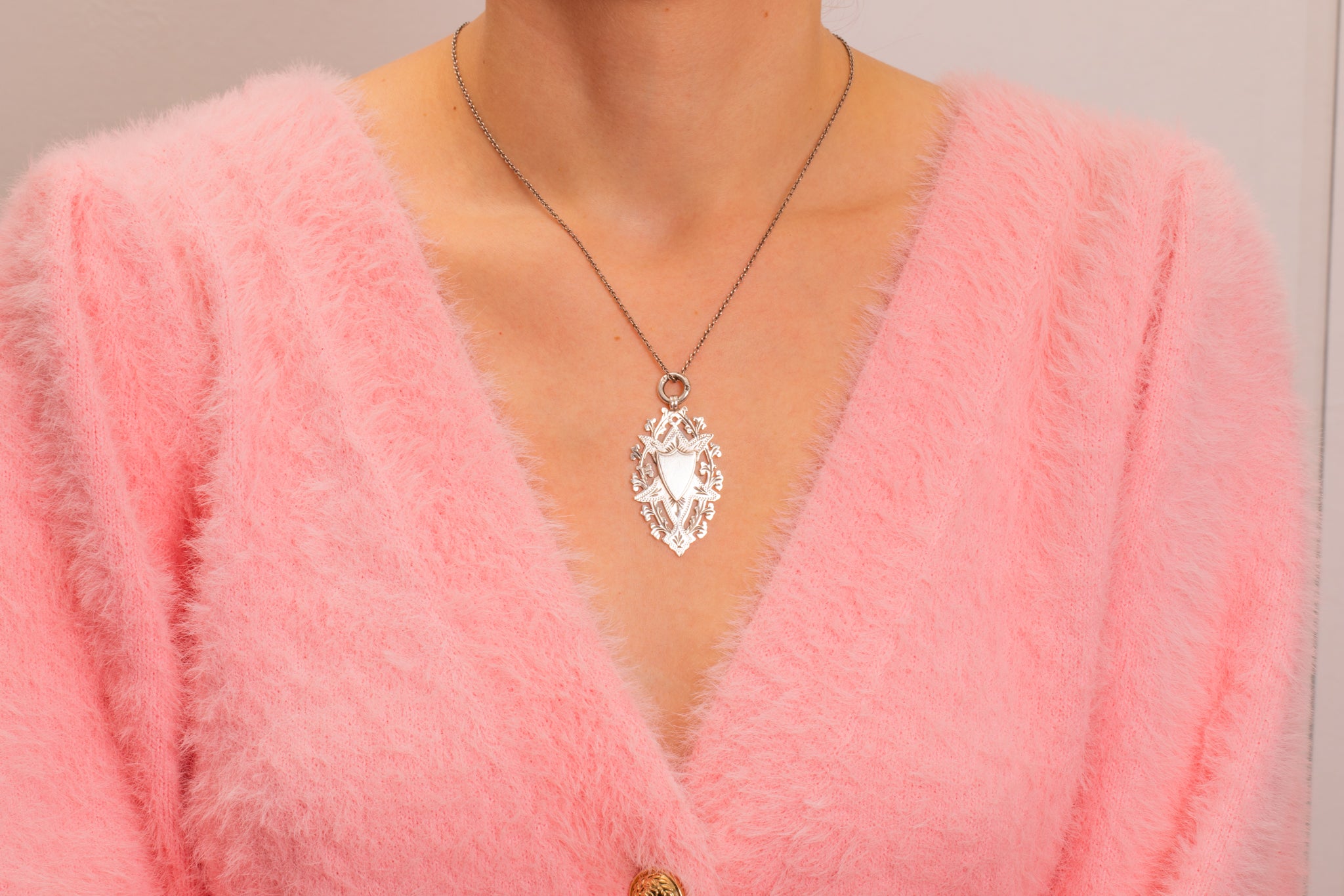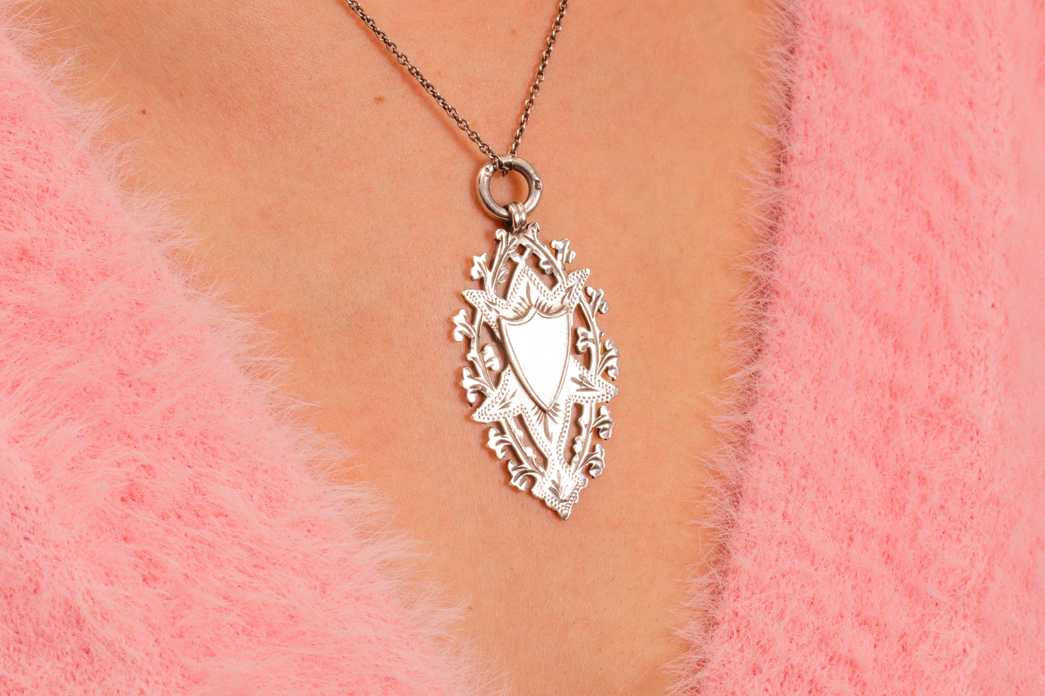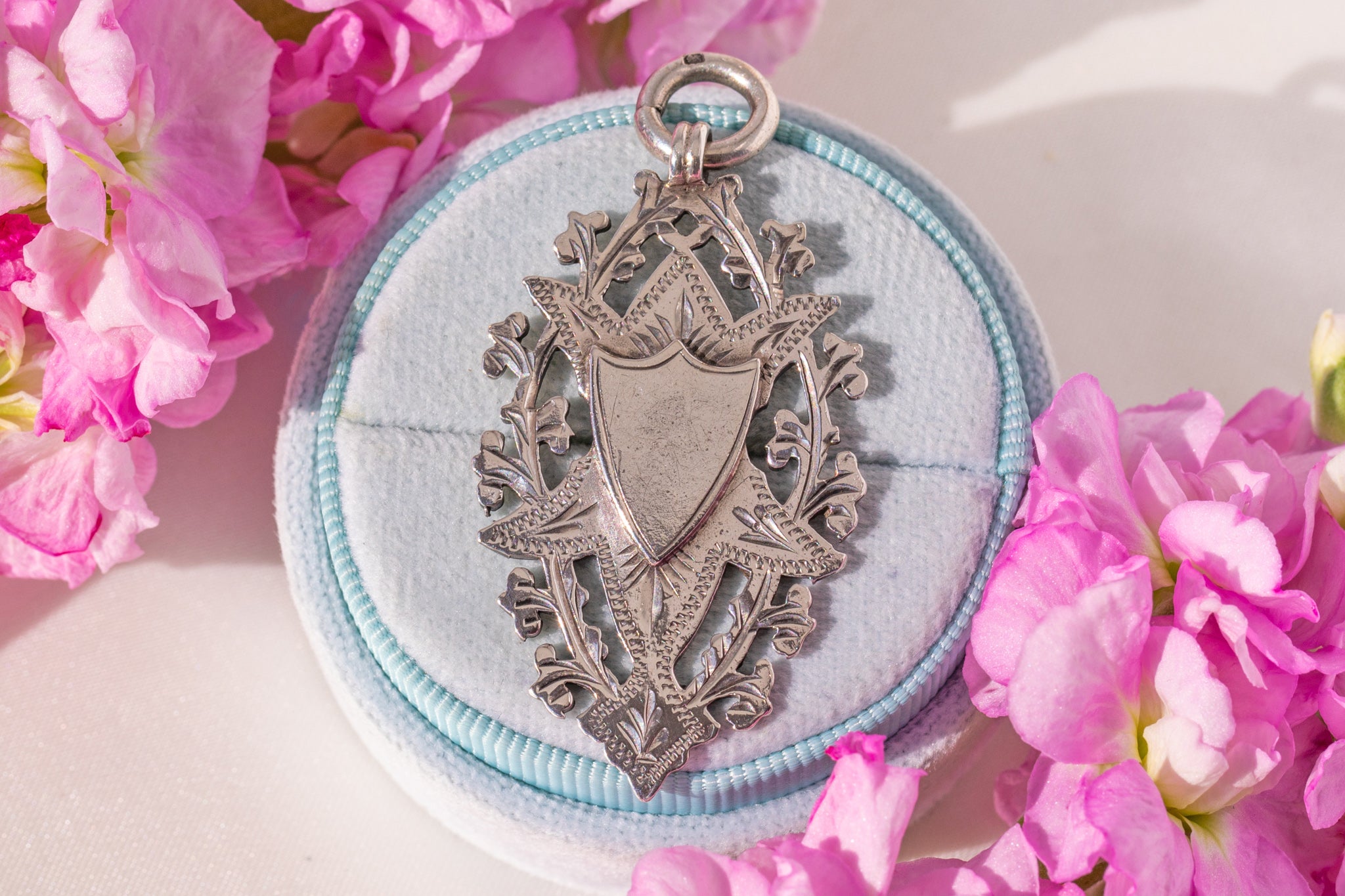 The perfect statement piece, this Edwardian Silver shield fob pendant will connect you with your inner warrior. With its smooth back, this antique medallion will sit comfortably against your décolletage, as her ornate engravings and vine detailing glimmer beneath the light.