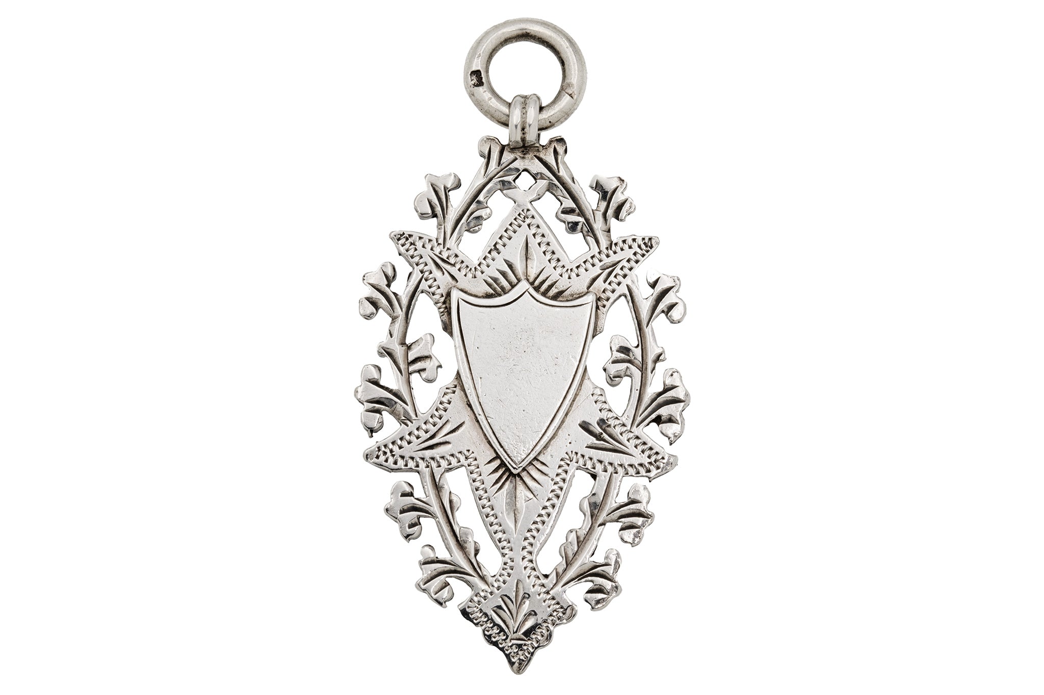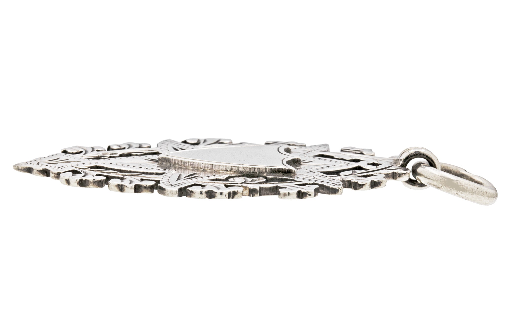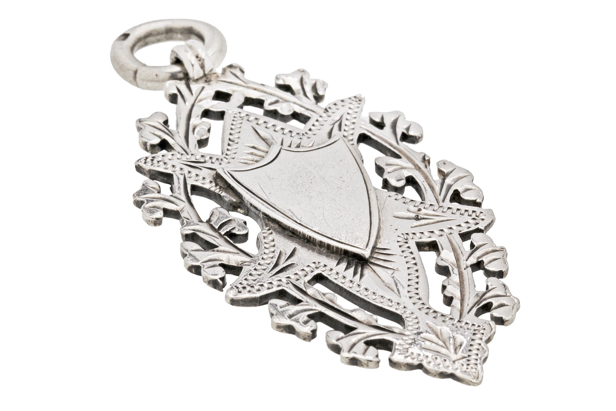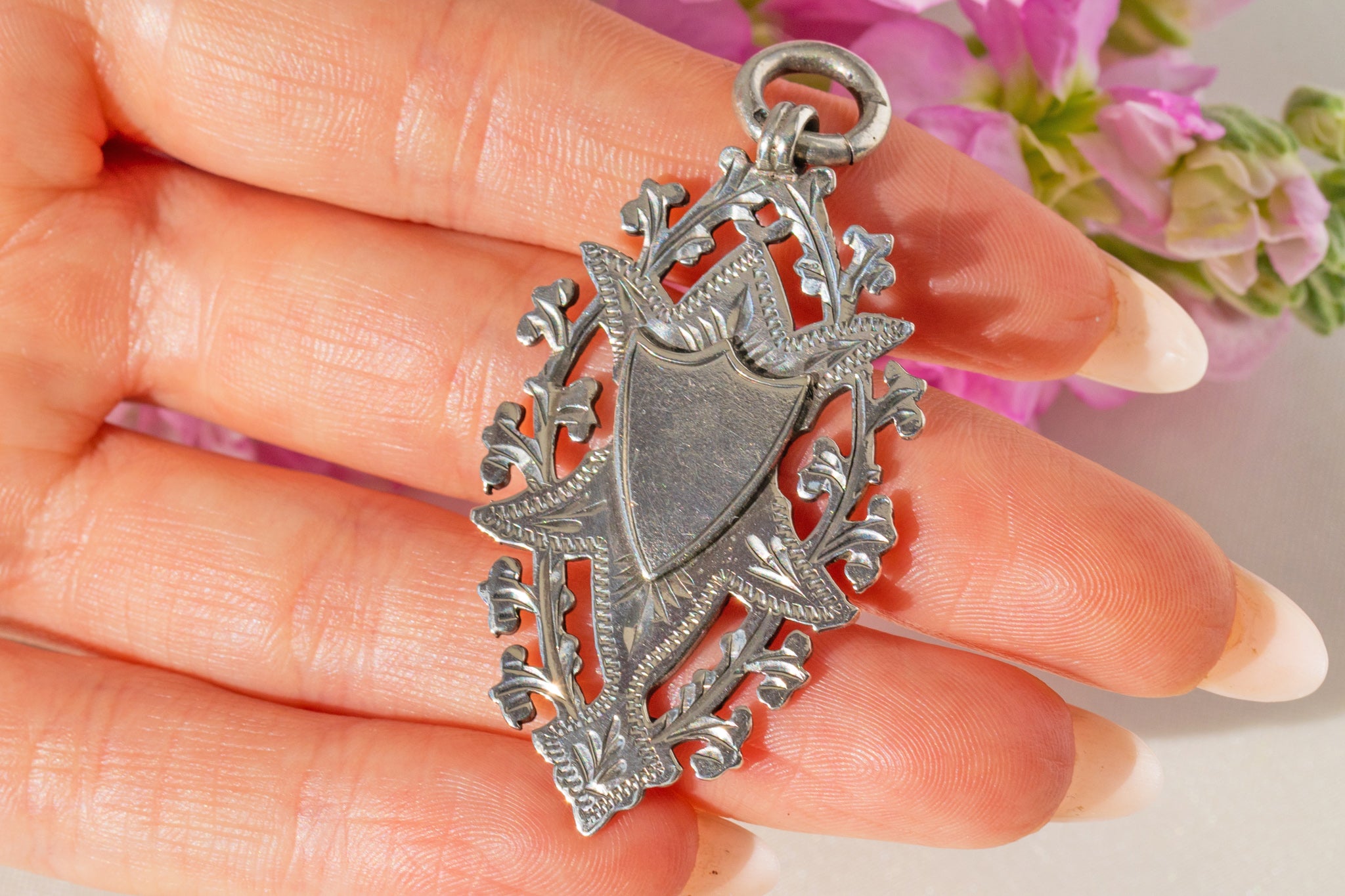 VERY GOOD: This Edwardian Silver shield fob pendant has kept incredibly well after all of these years. Fully hallmarked to 1902, the hallmarks are still just as crisp as they were 121 years ago. There is some light surface wear commensurate with age, but this is nothing untoward and rather adds to the antique charm of this distinguished piece. There is a clear shield cartouché on the front of the medal, inviting an inscription of your choice, and the thick antique jump ring is very robust. What a wonderful and historic fob medal.