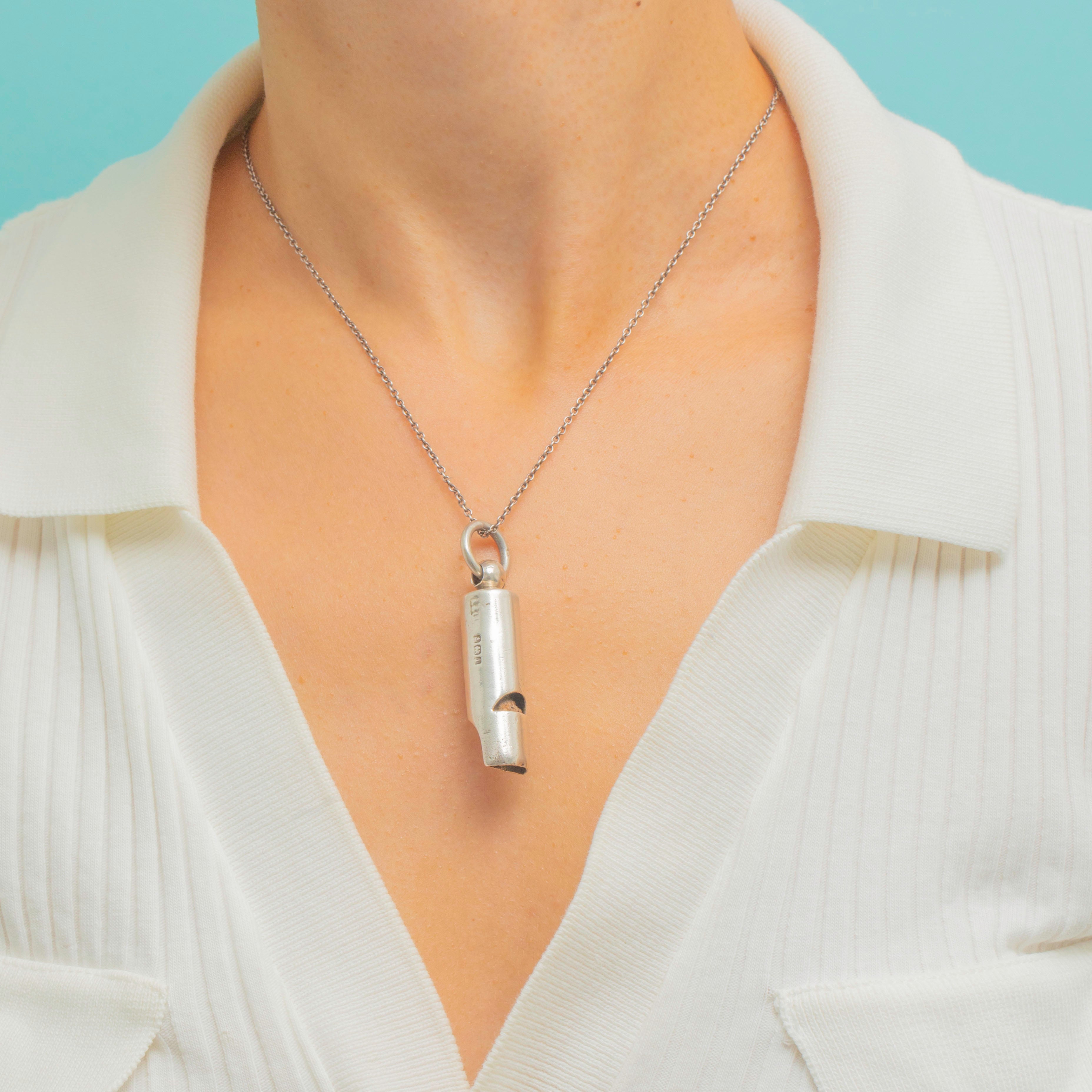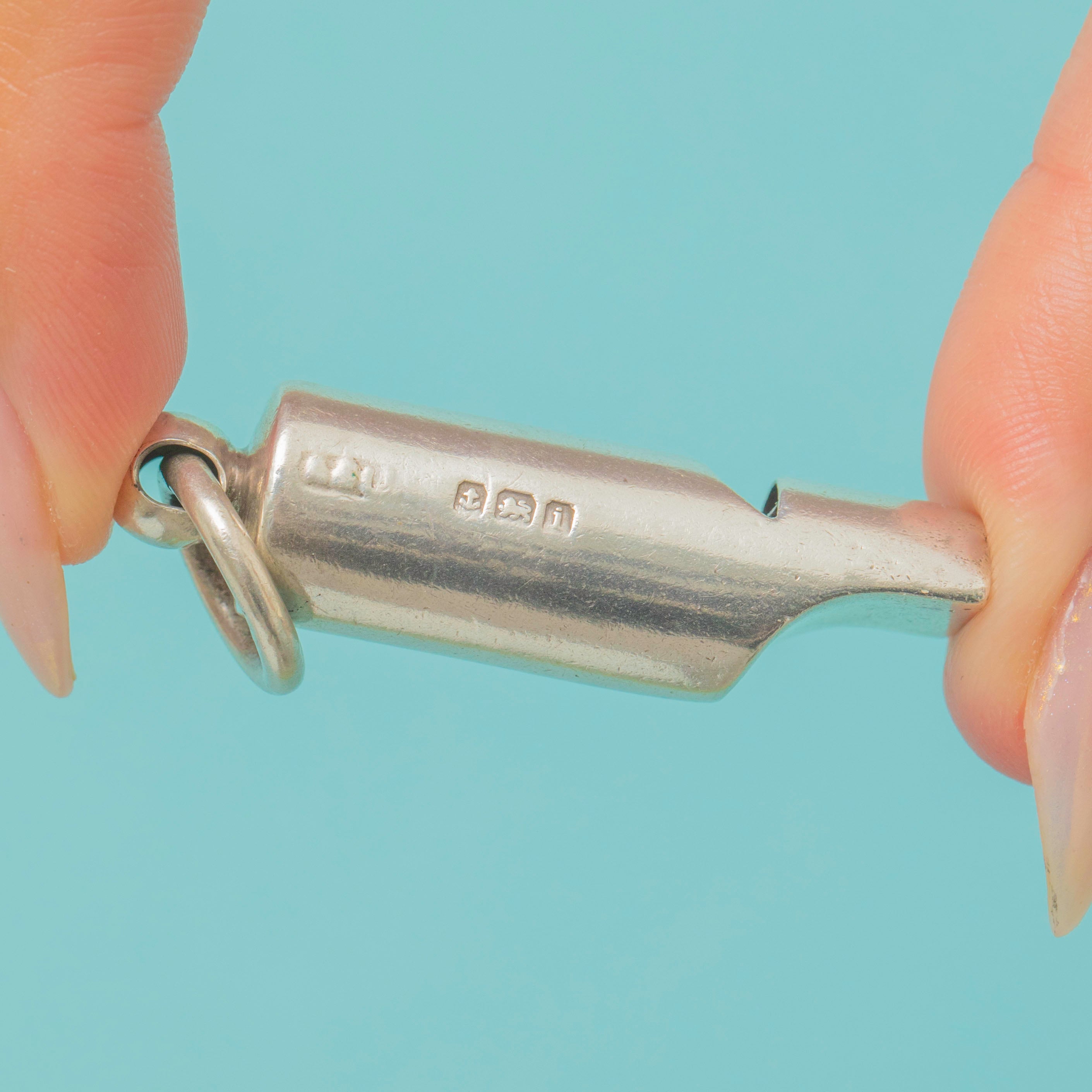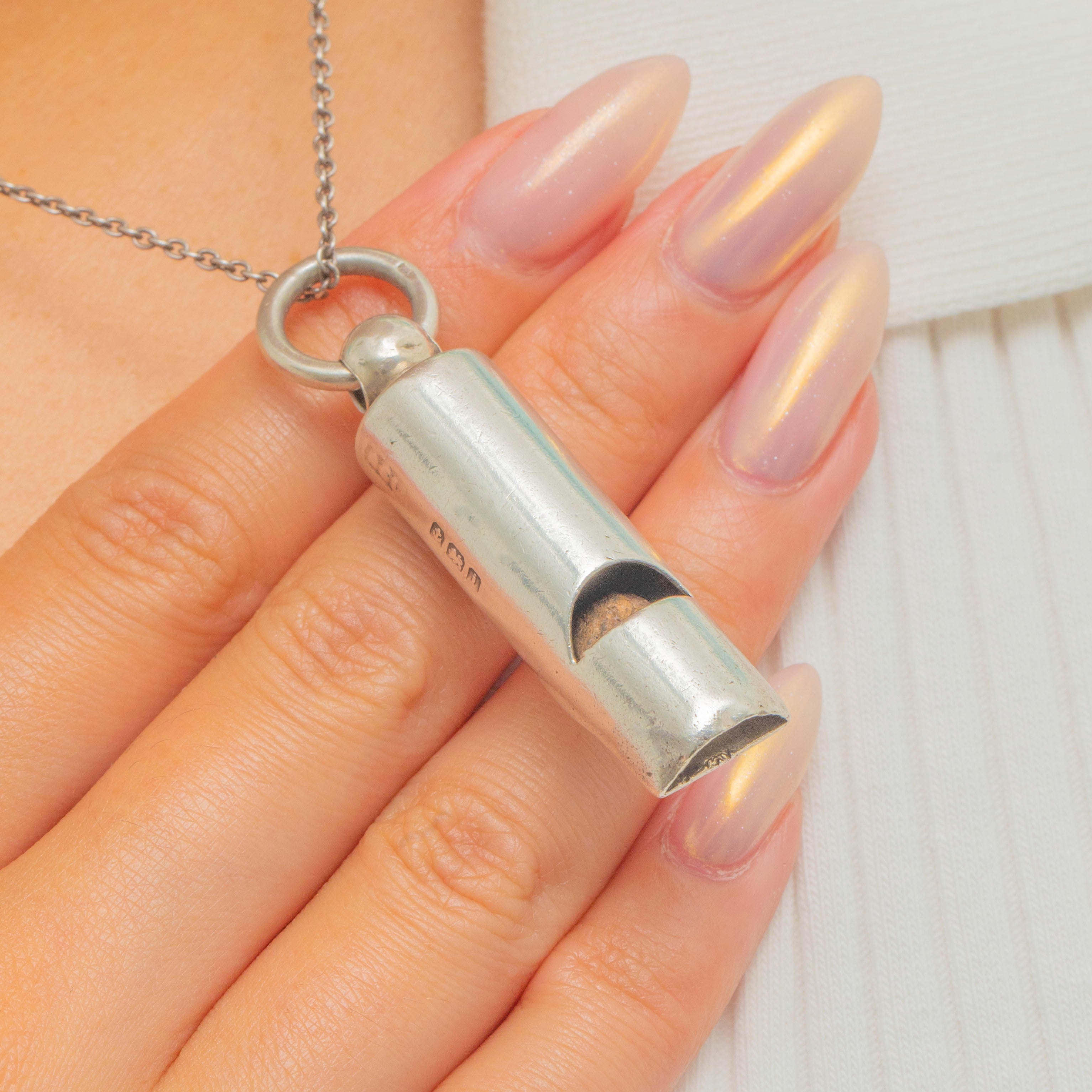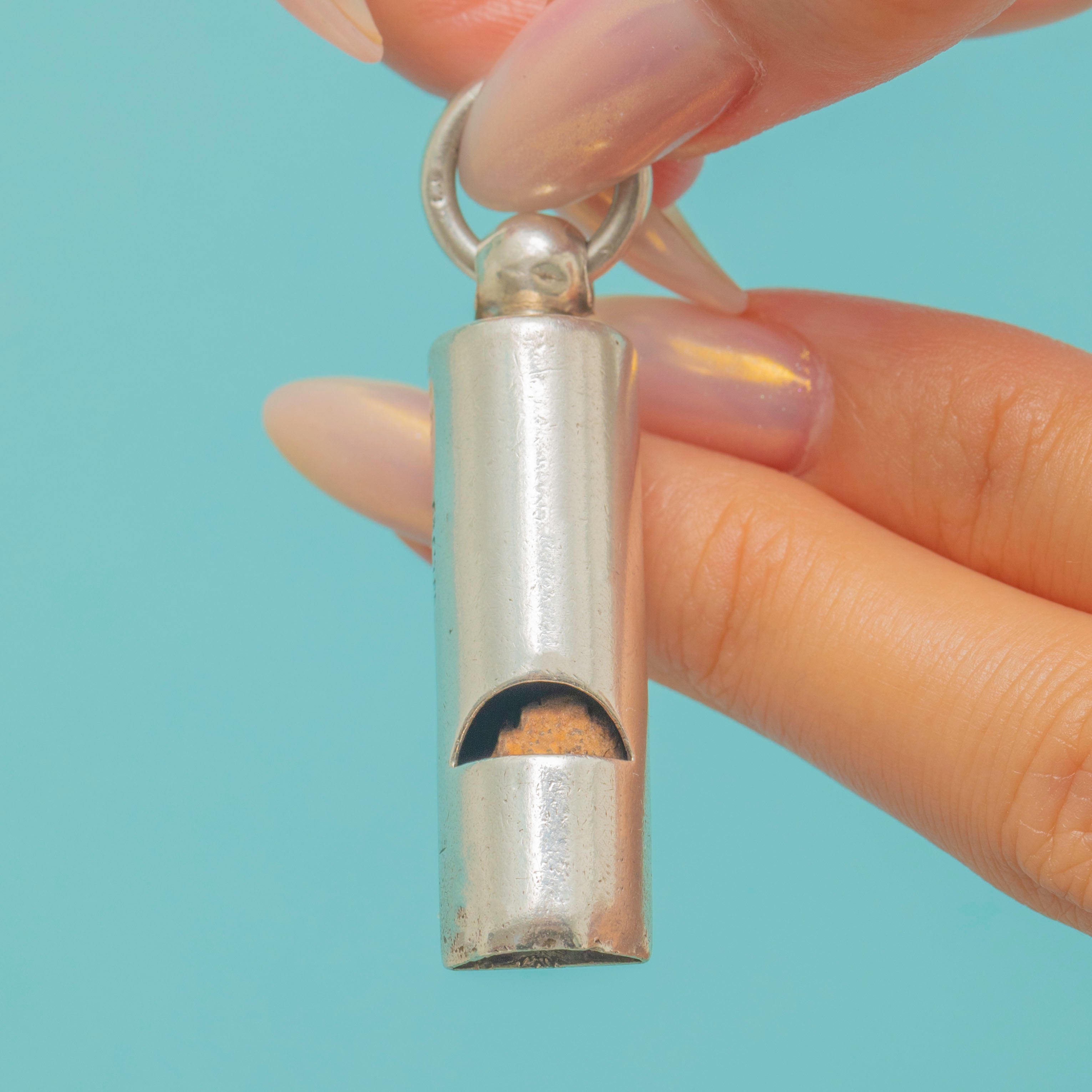 A wonderful piece of Edwardian novelty jewellery, this Sterling Silver whistle pendant is both playful and practical. Fully hallmarked and crafted with the classic cylindrical design, it has a satisfying weight and makes a clear, sharp sound when blown.