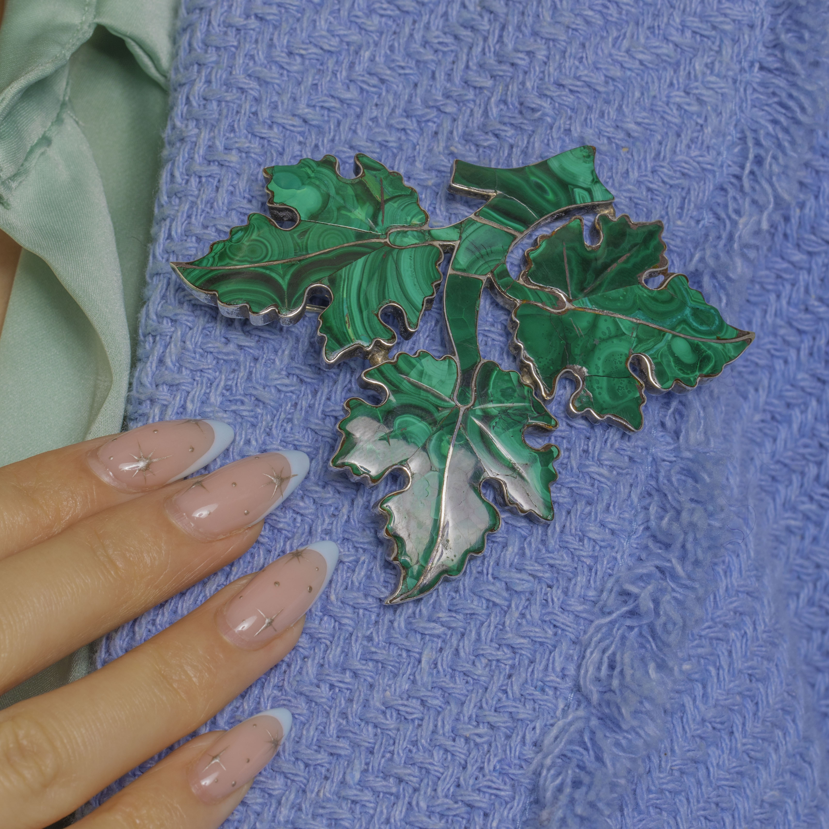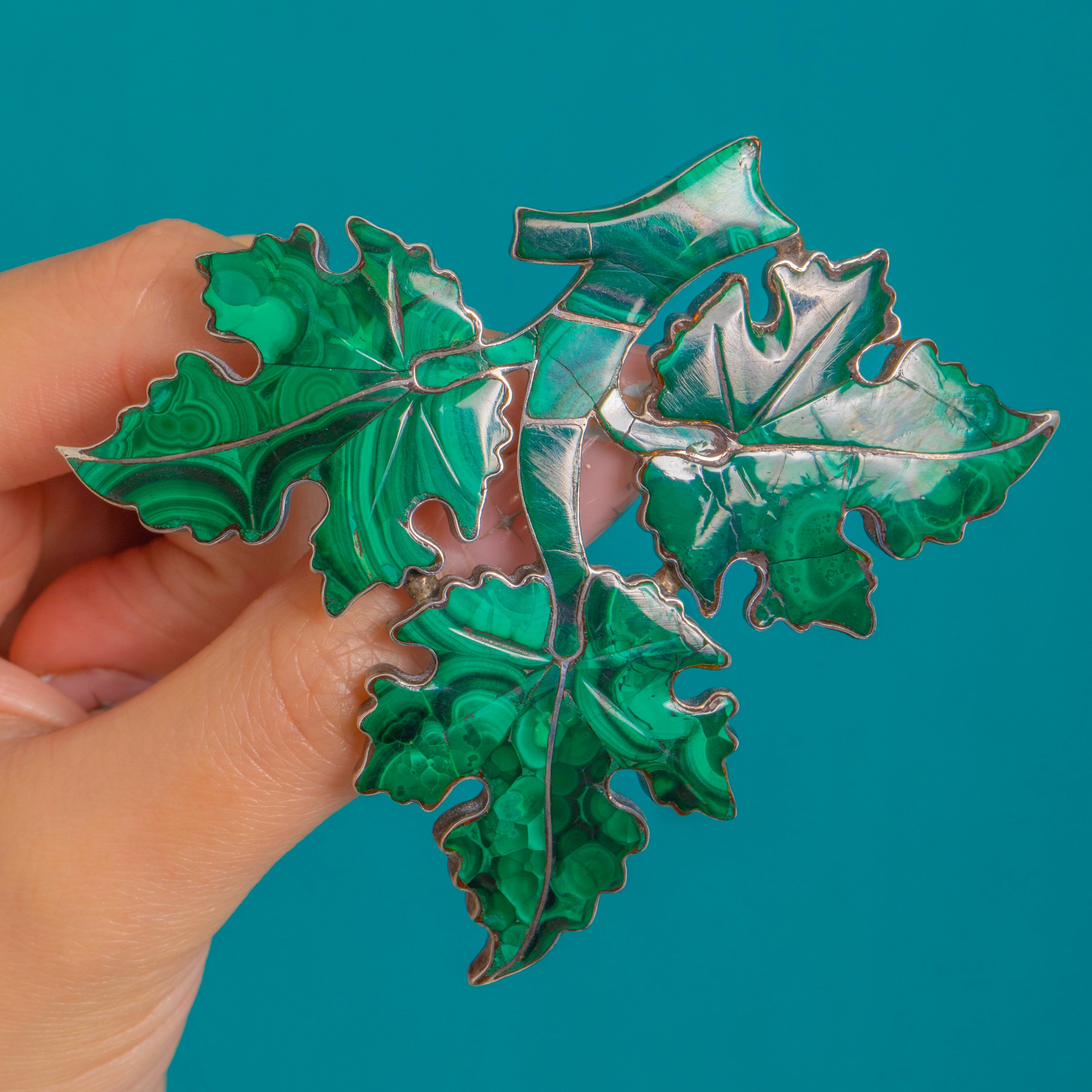 Extraordinary in every sense, this large Victorian Malachite brooch is a lush study of the natural world. Overlapping lobed leaves sweep across the plaque, each section inset with polished Malachite exhibiting beautiful banding in rich, velvety greens, all framed by cool Silver for crisp definition.