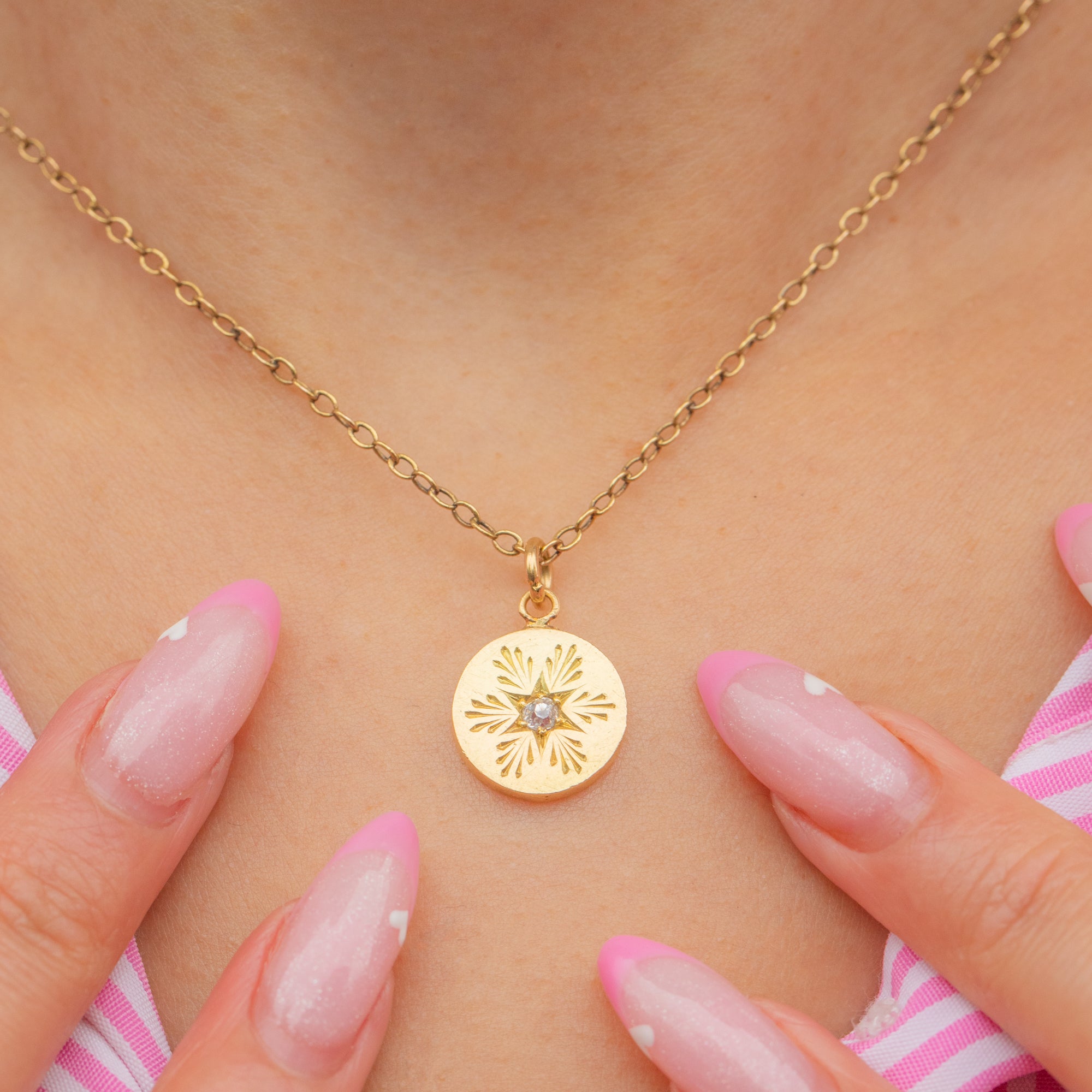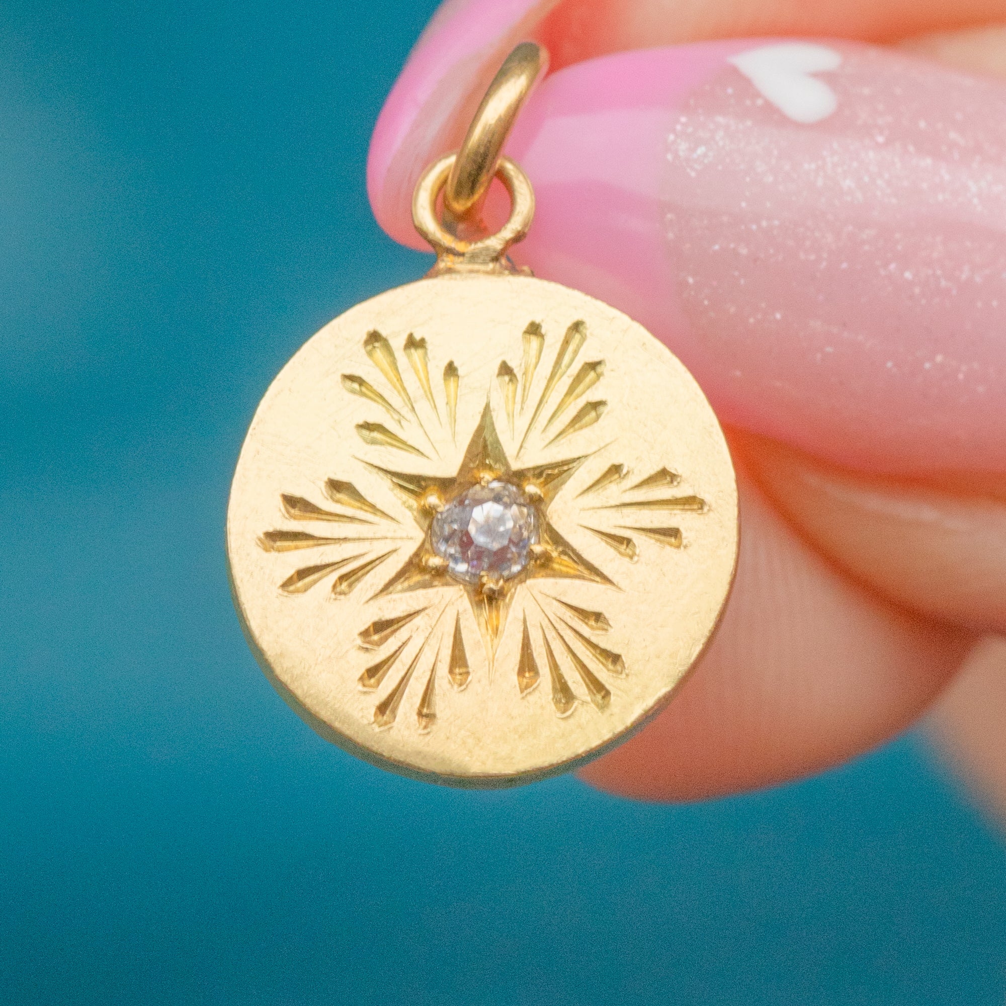 This enchanting Victorian pendant glows with festive warmth, crafted in rich 18ct Gold and centred by a sparkling Old Mine Cut Diamond. The radiant hand-engraved starburst design catches the light beautifully, embodying the sentimentality and fine craftsmanship of the 19th century.
