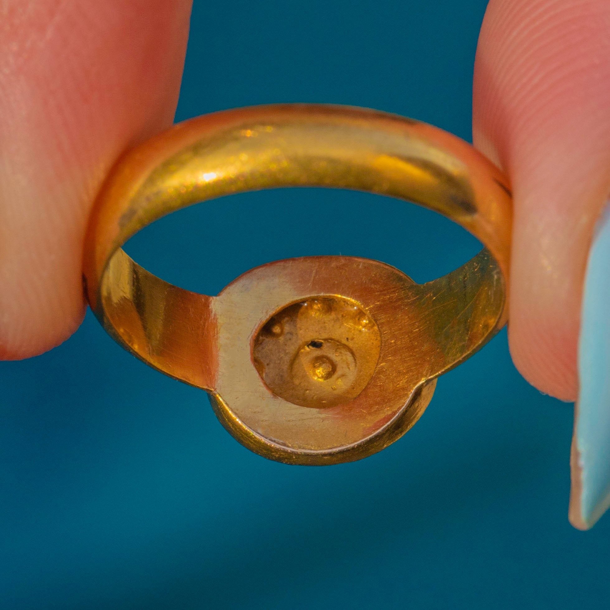 Fine 18ct Gold Carved Agate Forget-Me-Not Flower, Black Enamel, Natural Pearl Mourning Ring