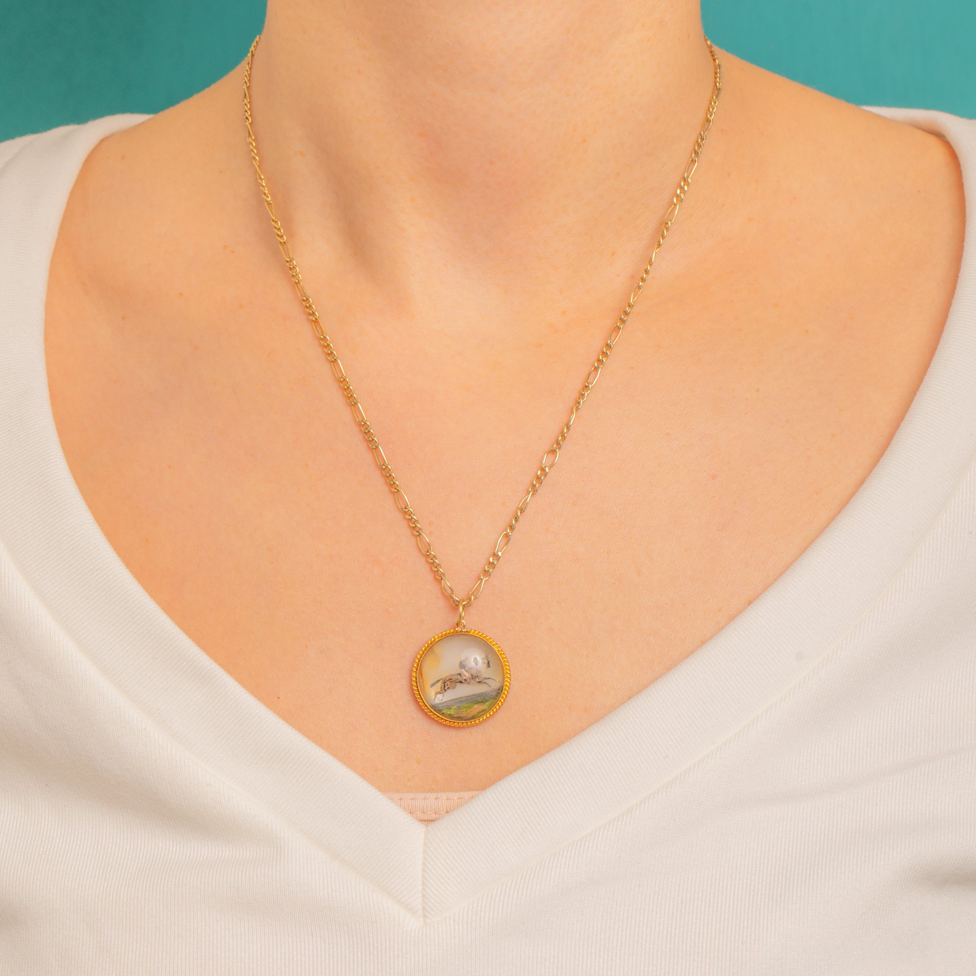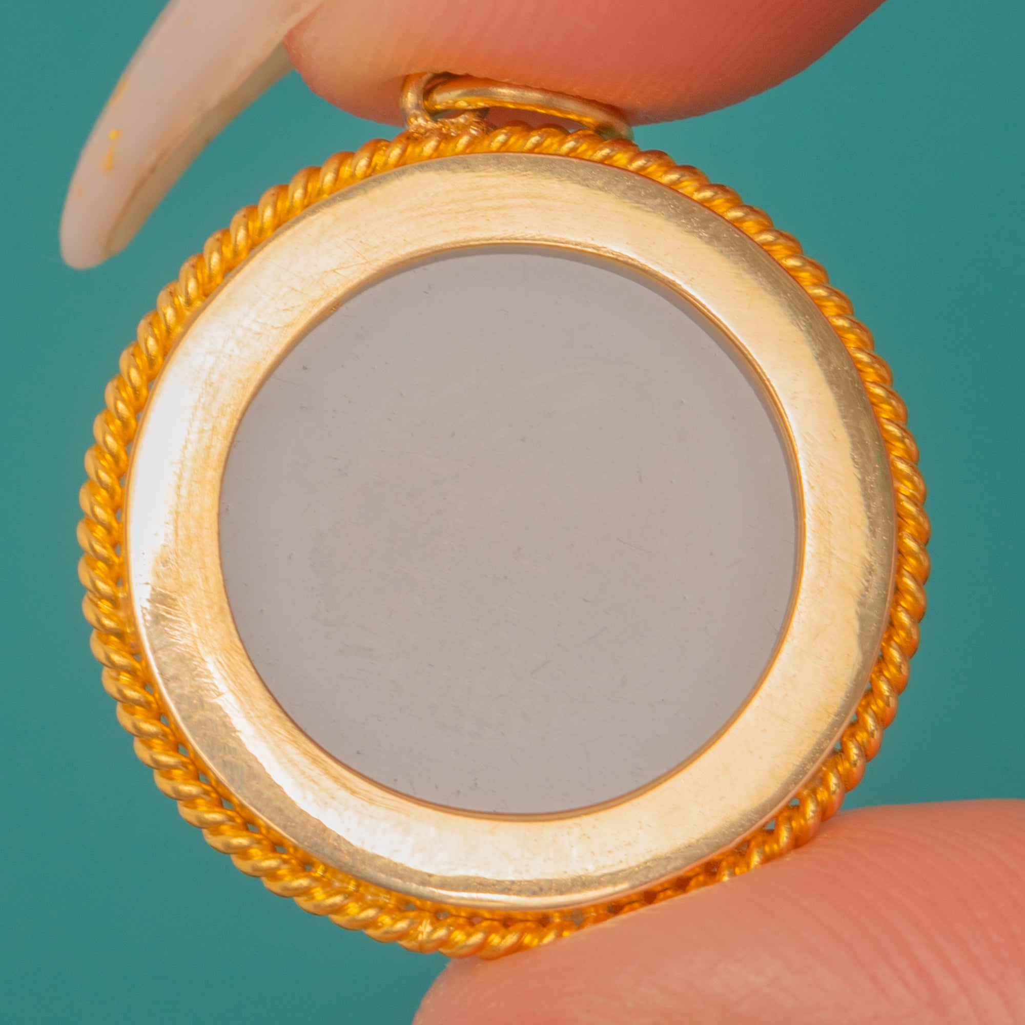 EXCELLENT: The reverse painted Essex Crystal is crisp with only light surface marks under magnification; the Mother of Pearl backing is intact with minimal, age-related speckling. The 18ct Gold rope bezel and soldered bail are secure and well preserved, with a neat area of solder visible at the hasp. Overall, the pendant has been well cared for with gentle wear commensurate with age.