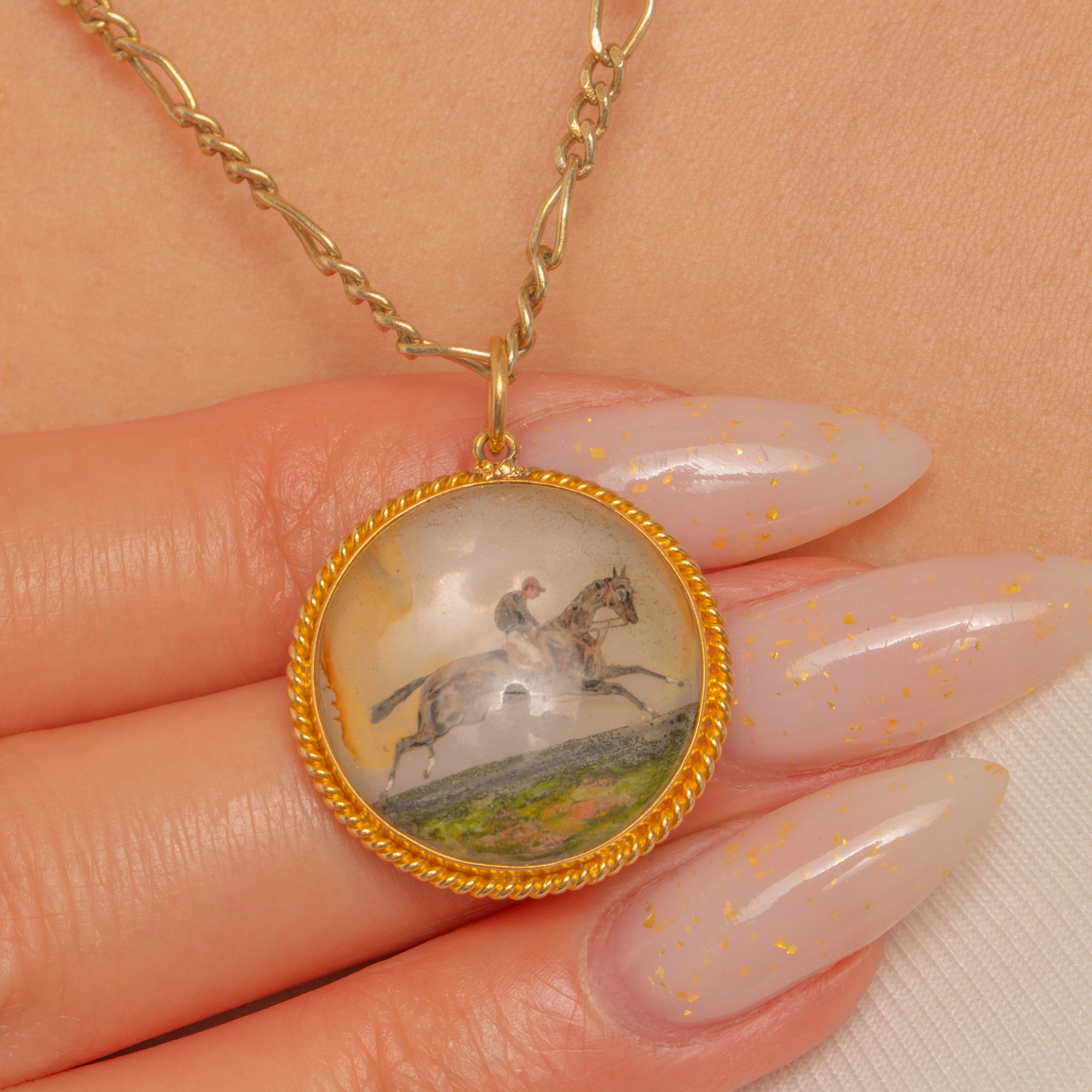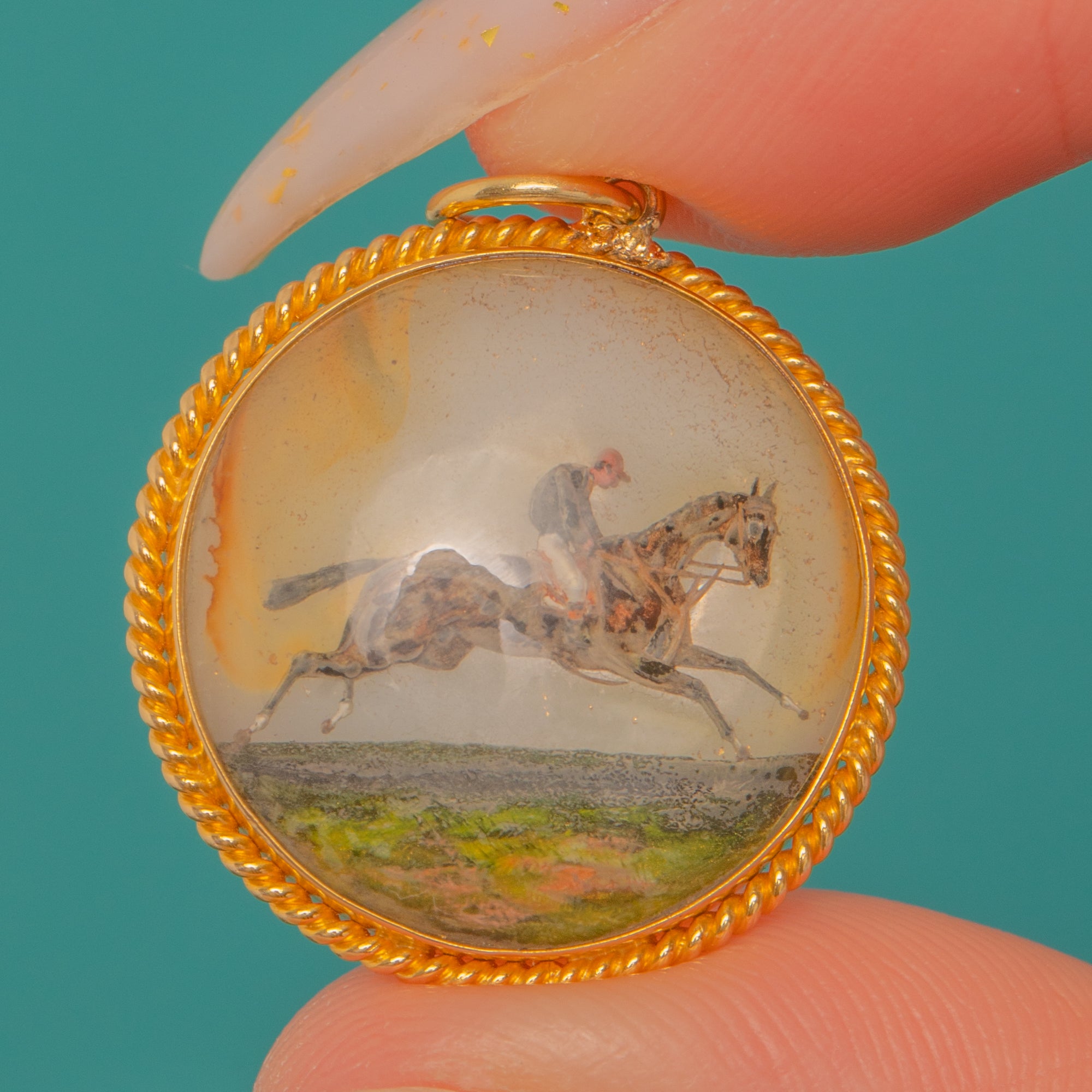 A charming Victorian equestrian Essex Crystal pendant, finely reverse painted to depict a jockey mid-gallop. The miniature comes alive beneath the domed crystal, its depth enhanced by a luminous Mother of Pearl backing that adds a soft iridescence and a sense of motion to the scene.