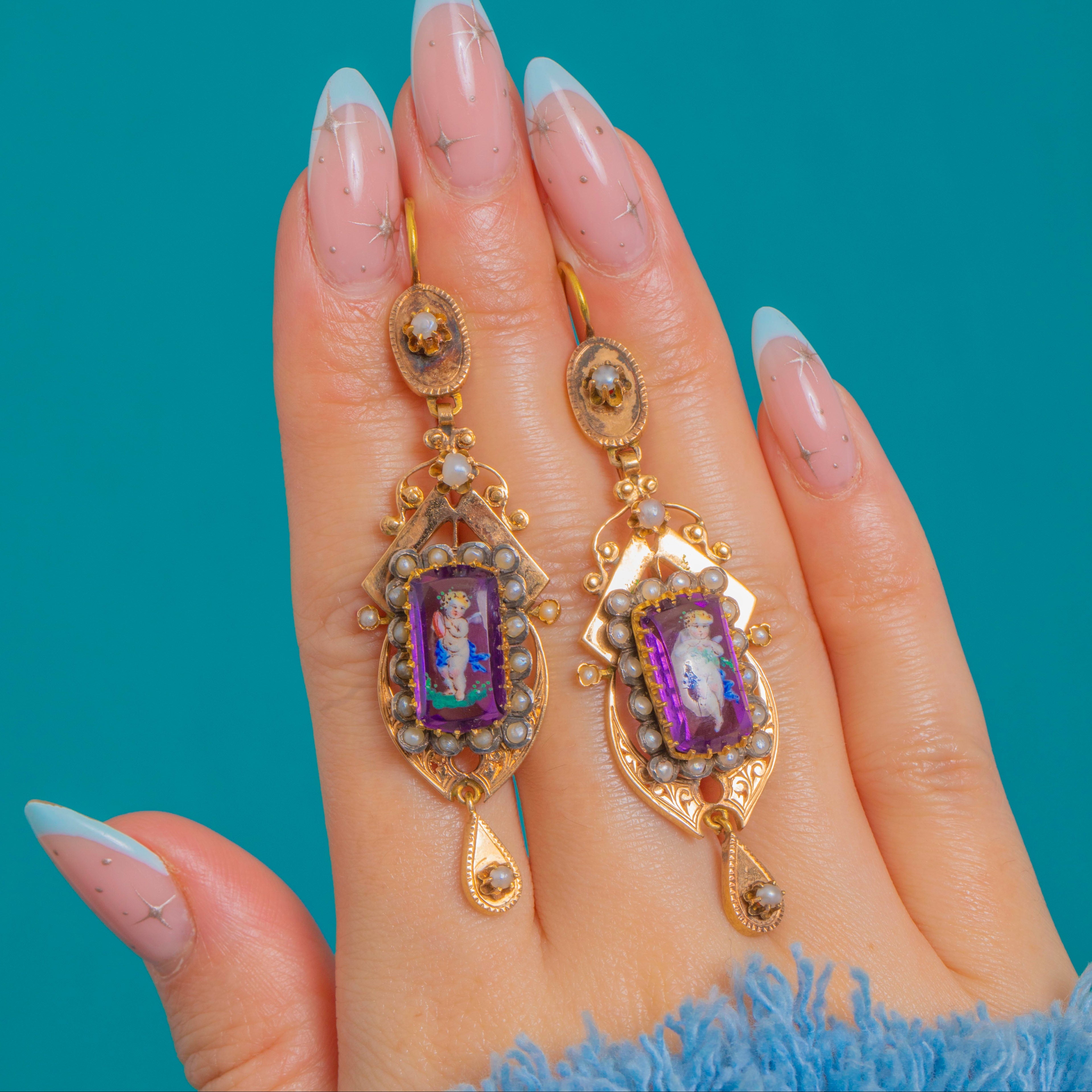 Sumptuous and romantic, these French Victorian 18ct Gold earrings showcase exquisitely painted cherub miniatures on a vivid purple glass ground. The elongated, articulated silhouette is richly adorned with applied bead-and-wire detail in the Etruscan Revival taste, delivering graceful movement and an opulent, shoulder-grazing presence.
