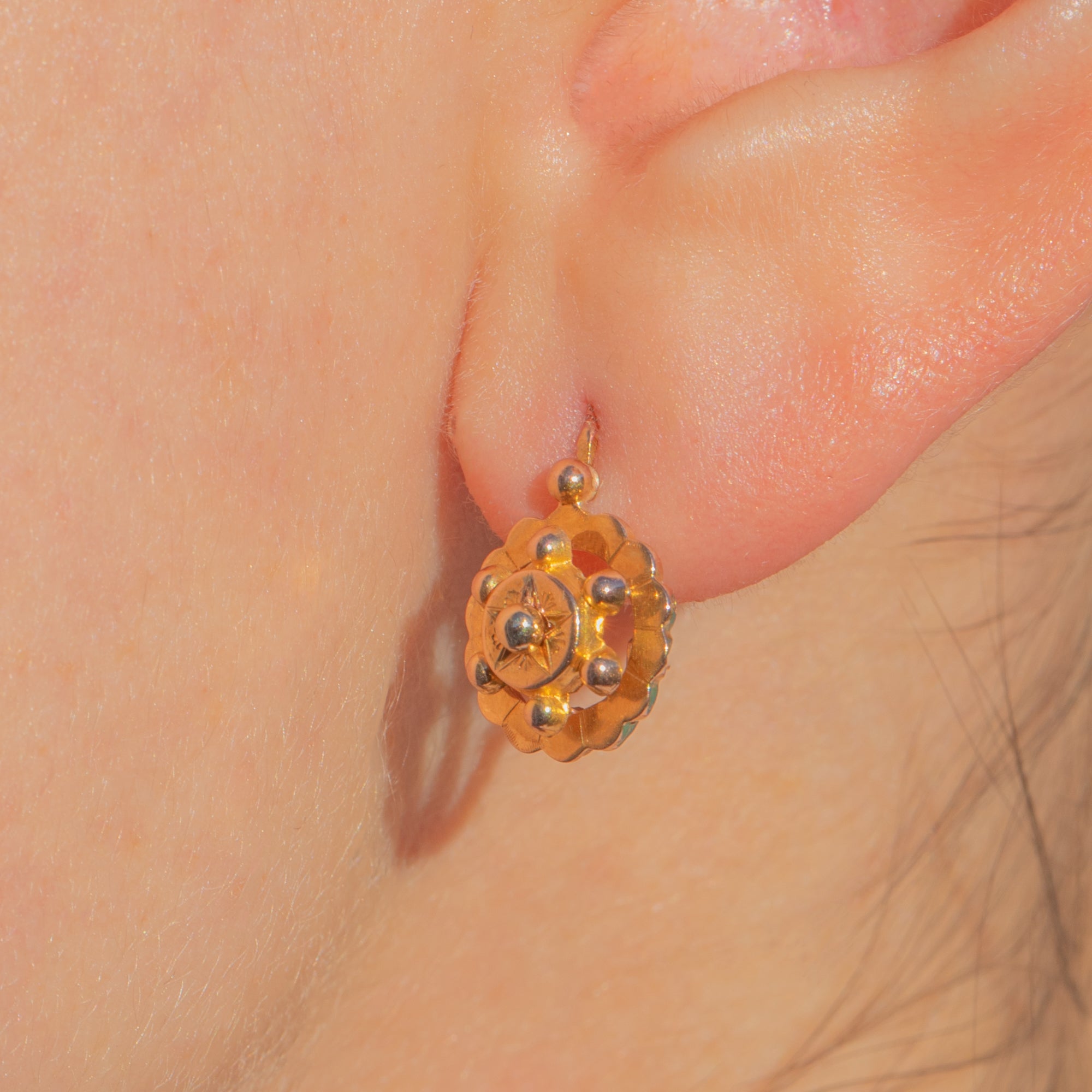 EXCELLENT: The earrings are in excellent condition, with minimal wear to the Gold and crisp detail throughout the beadwork and engraved sections. The lever-back fittings close securely and sit neatly when worn. Overall, a beautifully preserved antique pair, ready to wear.