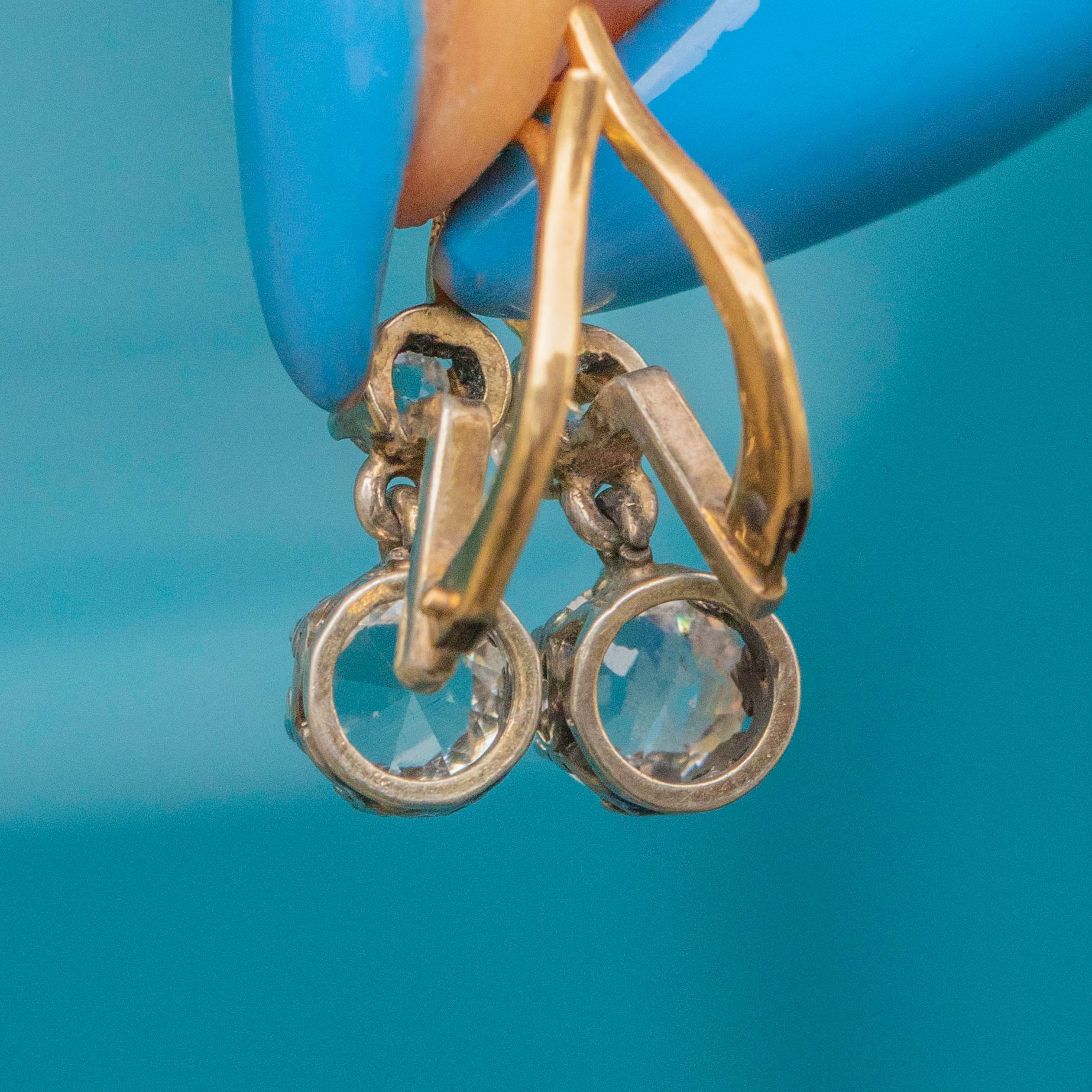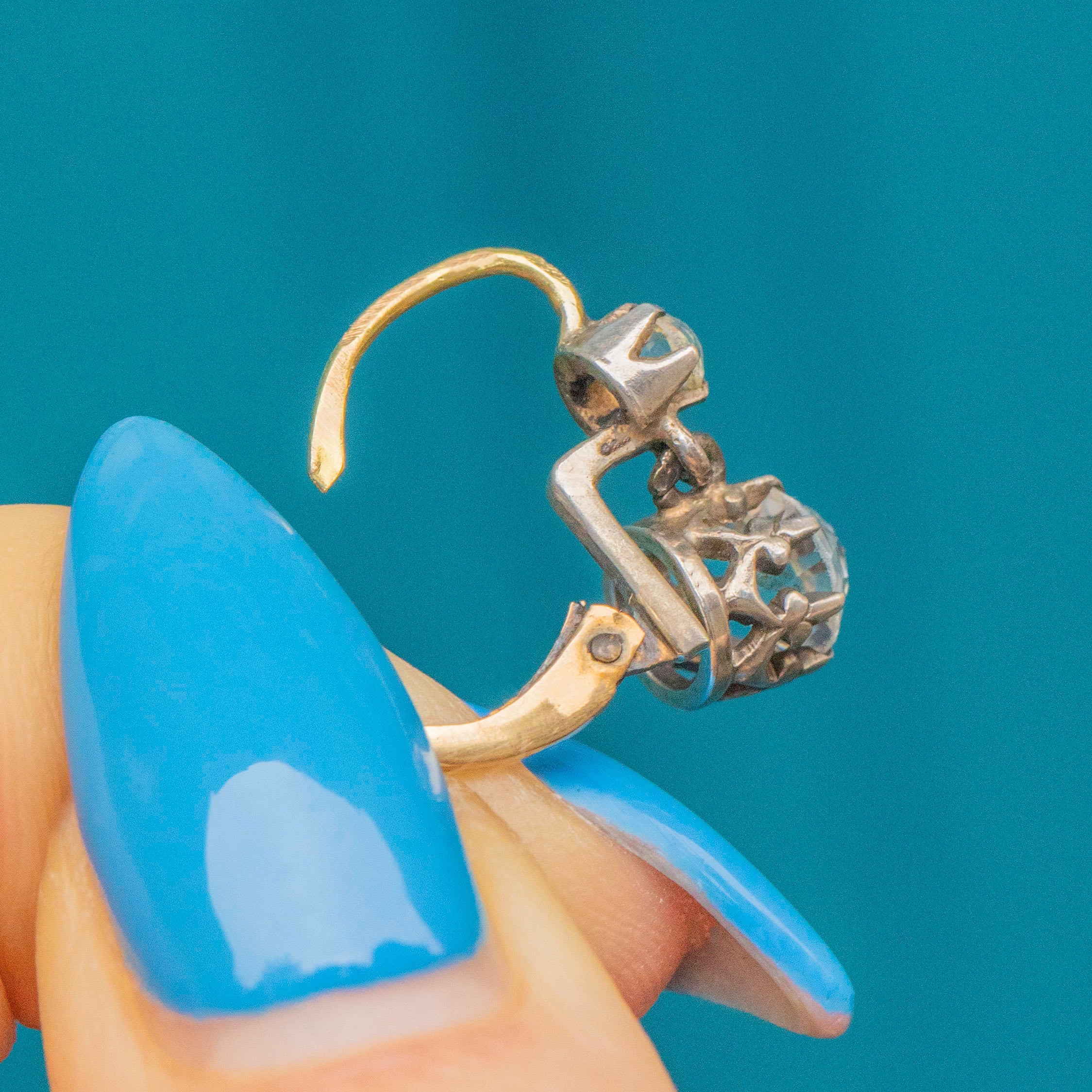 EXCELLENT. These French 18ct Gold Paste Dormeuse earrings are fabulous. The Paste gems are sparkly and securely set. The lever backs are in perfect working order, allowing you to wear these earrings confidently.
