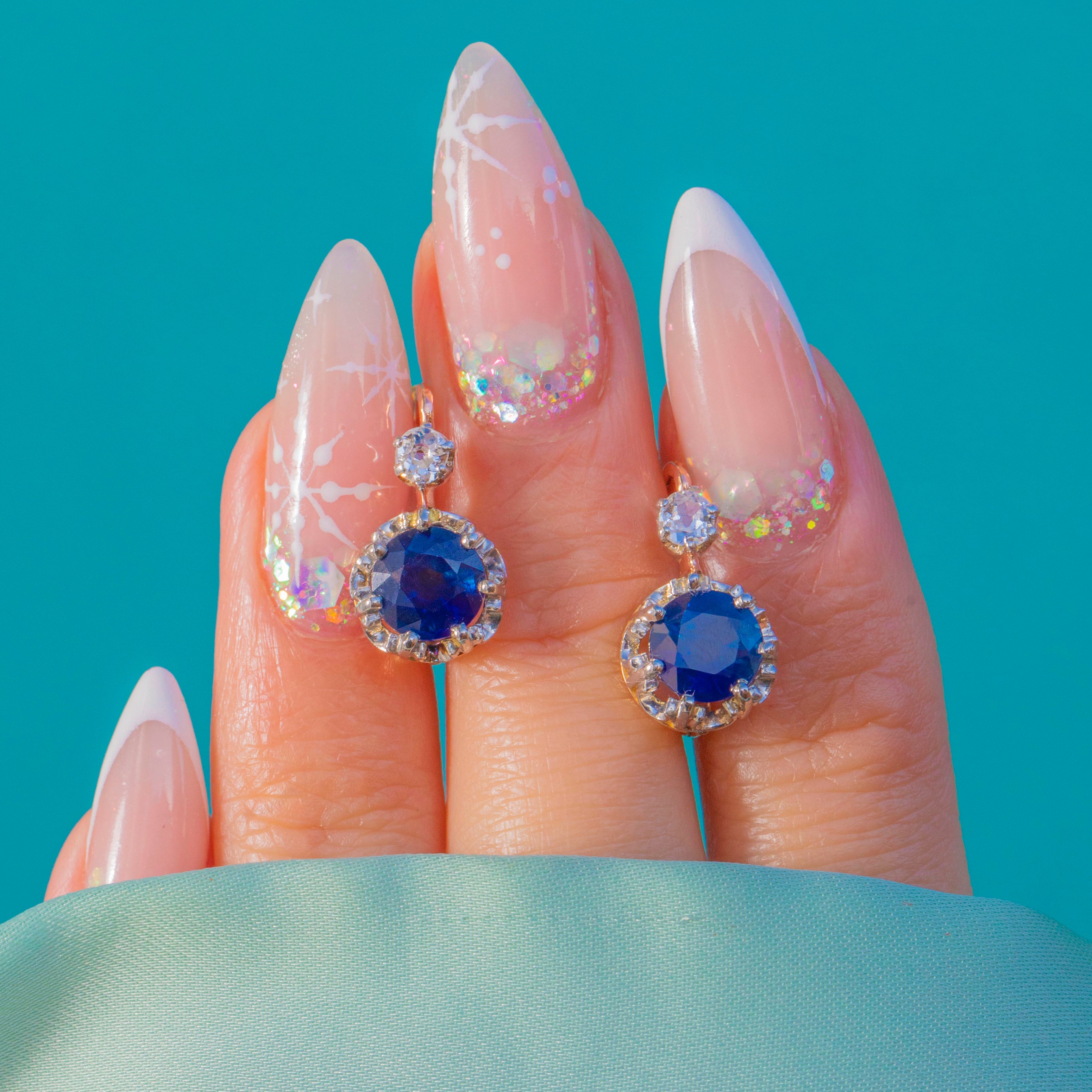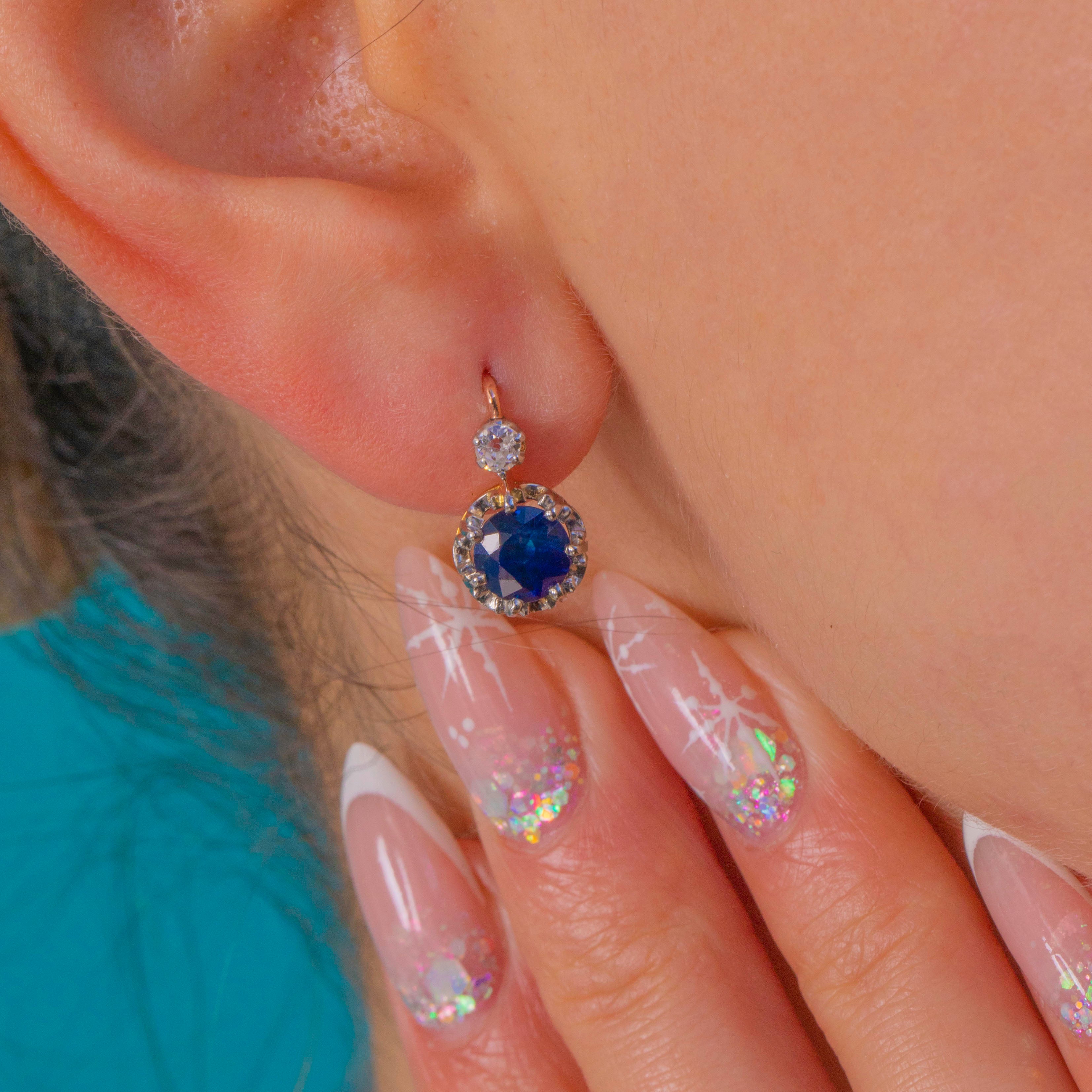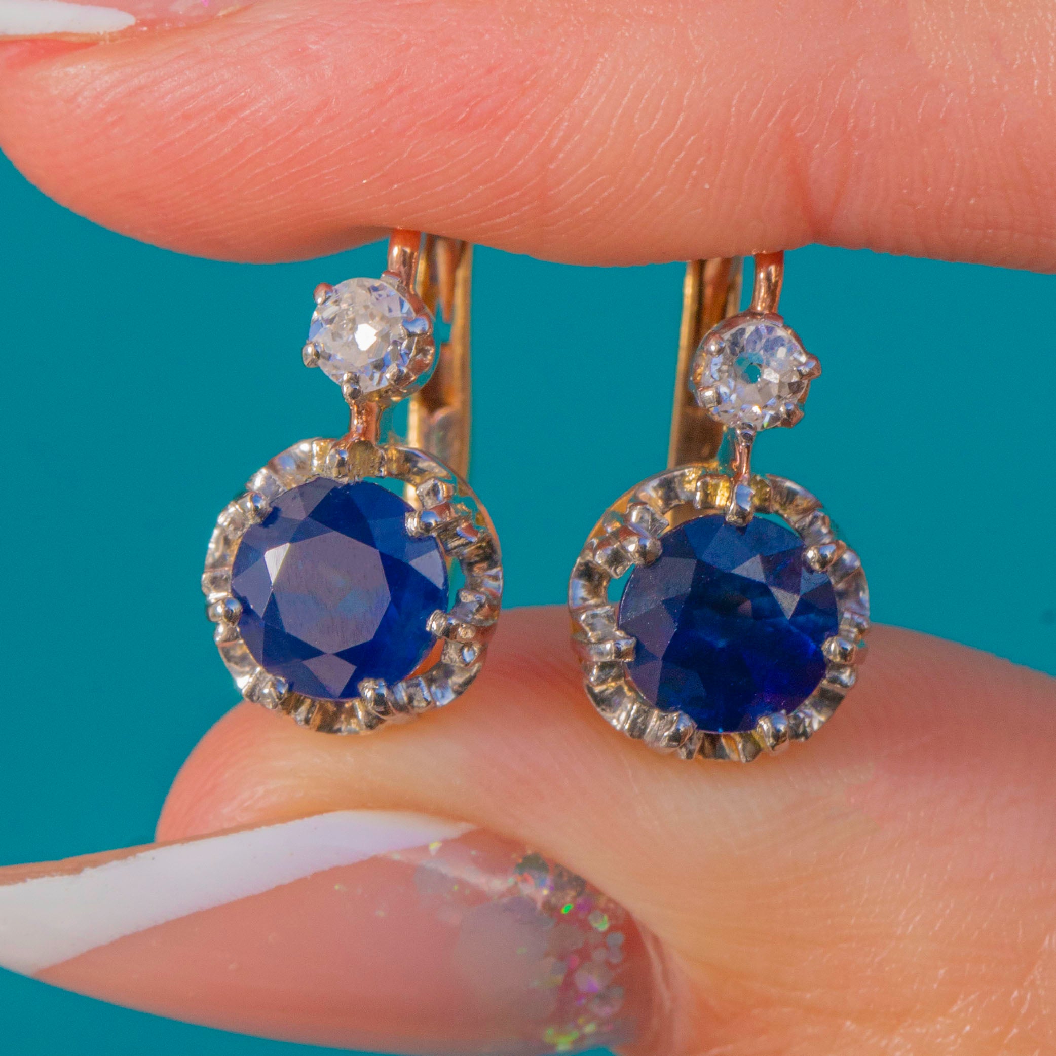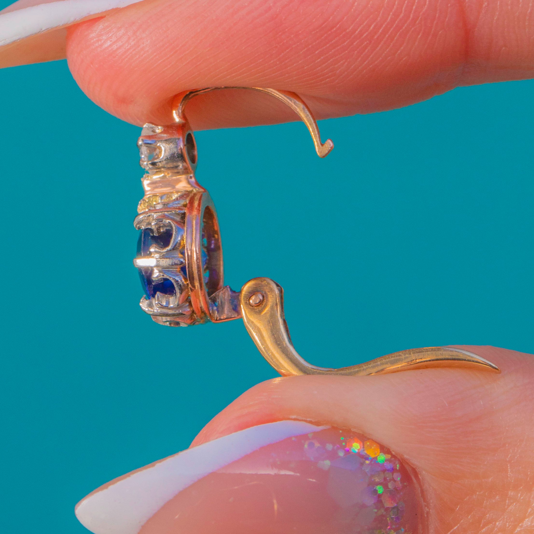 These French Victorian dormeuse earrings marry effortless elegance with timeless craftsmanship. Each luminous Royal Blue Sapphire sits in a white-topped Platinum coronet with delicately scalloped edges and a pierced gallery, giving that classic halo sparkle and refined movement. Above, a single old mine cut Diamond surmount adds a bright, antique glint, all set against warm 18ct Gold with chic two-tone contrast.