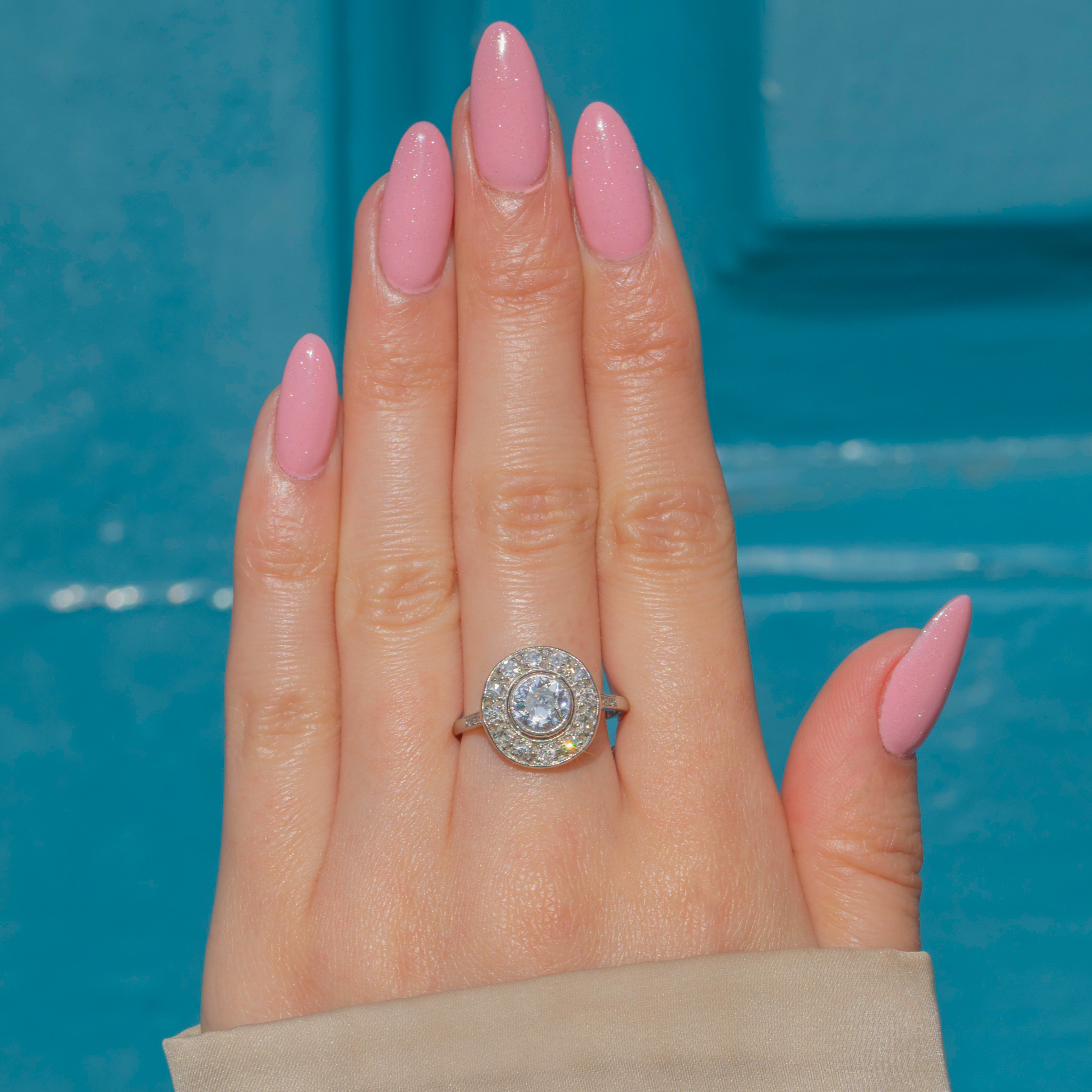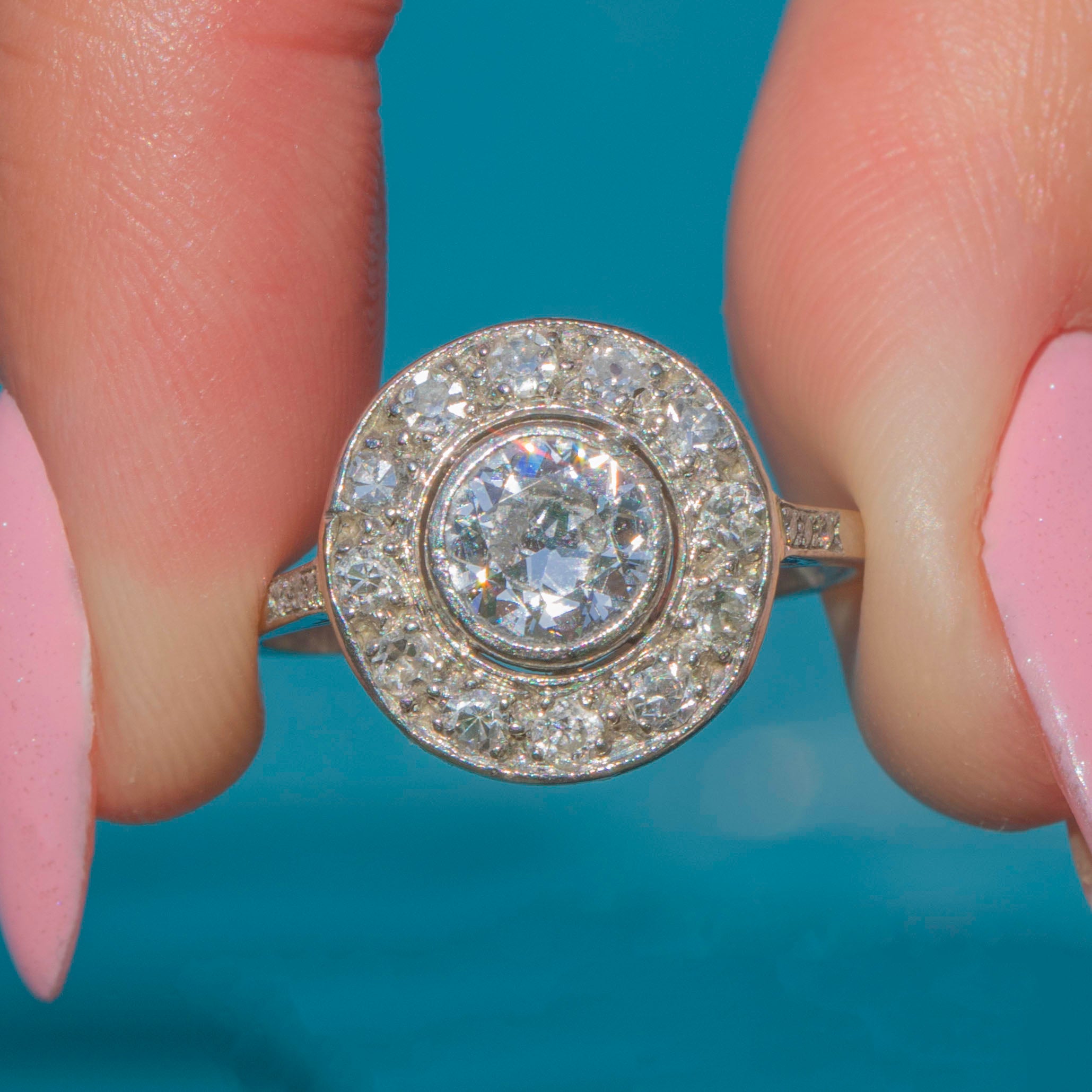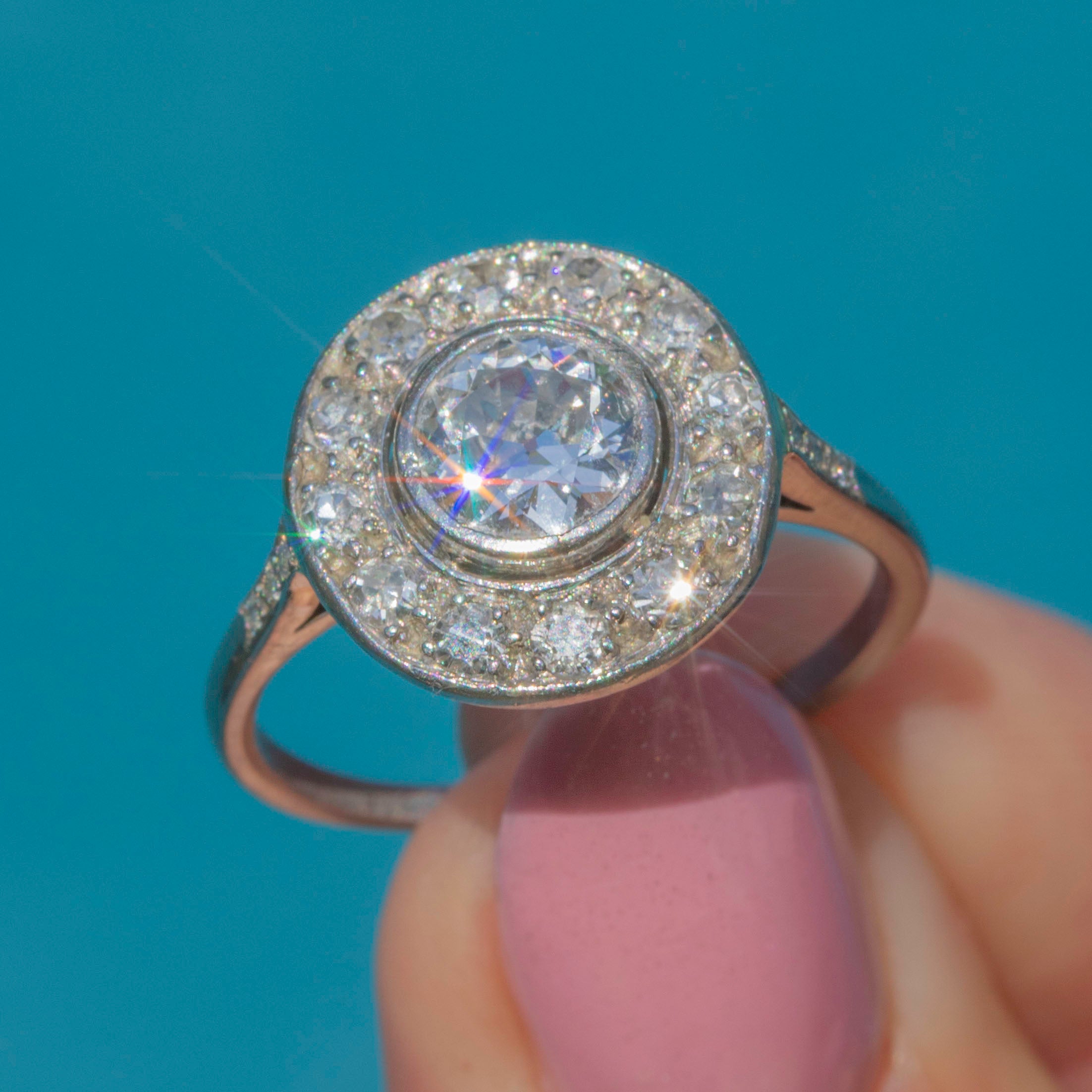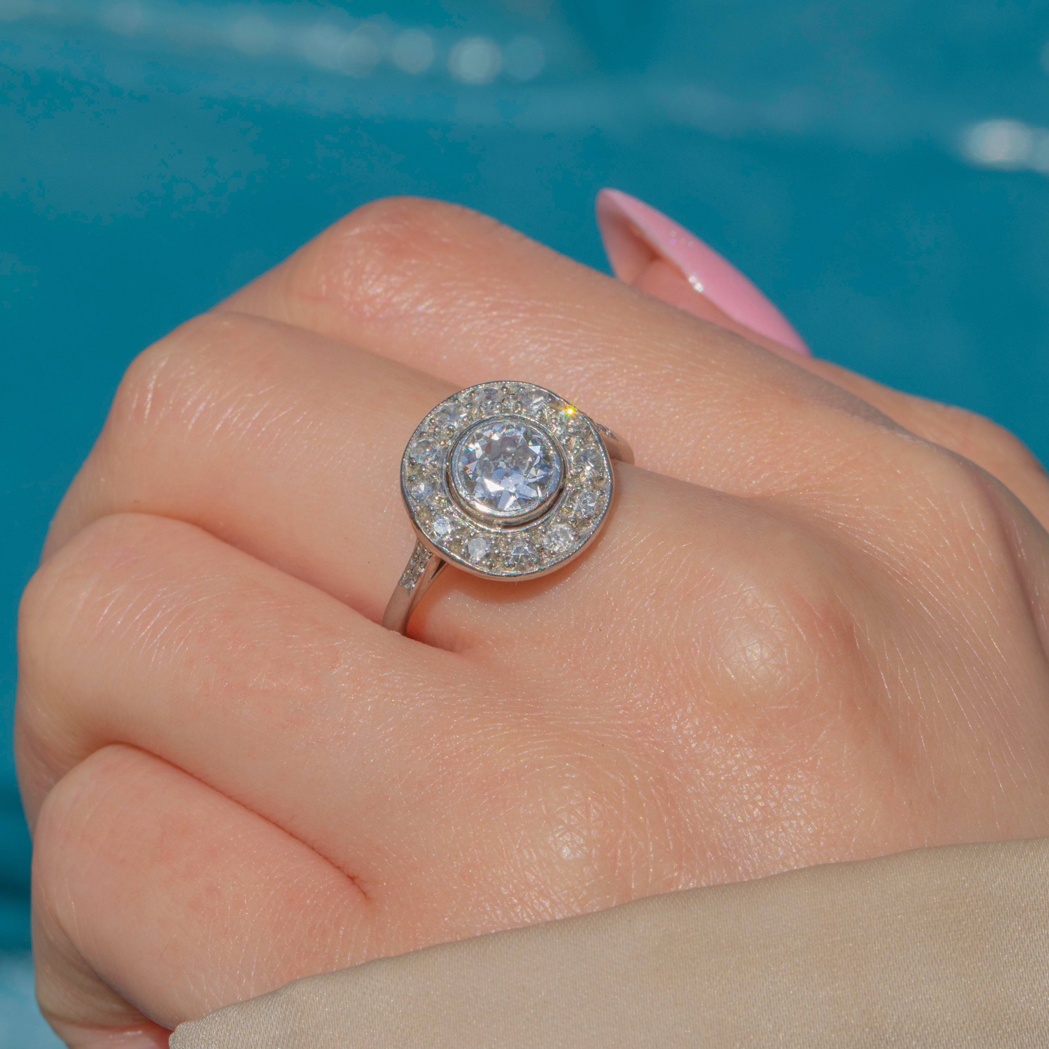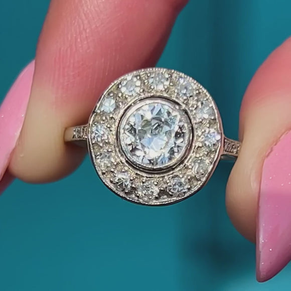 A combination of eighteen scintillating old-European cut and round brilliant Diamonds halo a large central 0.75ct F-G colour Old European Diamond, meticulously arranged into a quintessential Art Deco target design. Each Diamond is set within glossy Platinum, effortlessly complementing the natural twinkle of the gemstones and providing an elegant and glamorous finish.