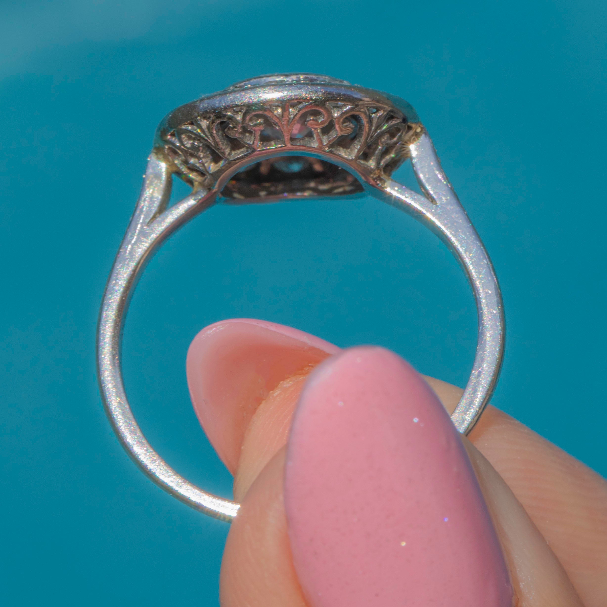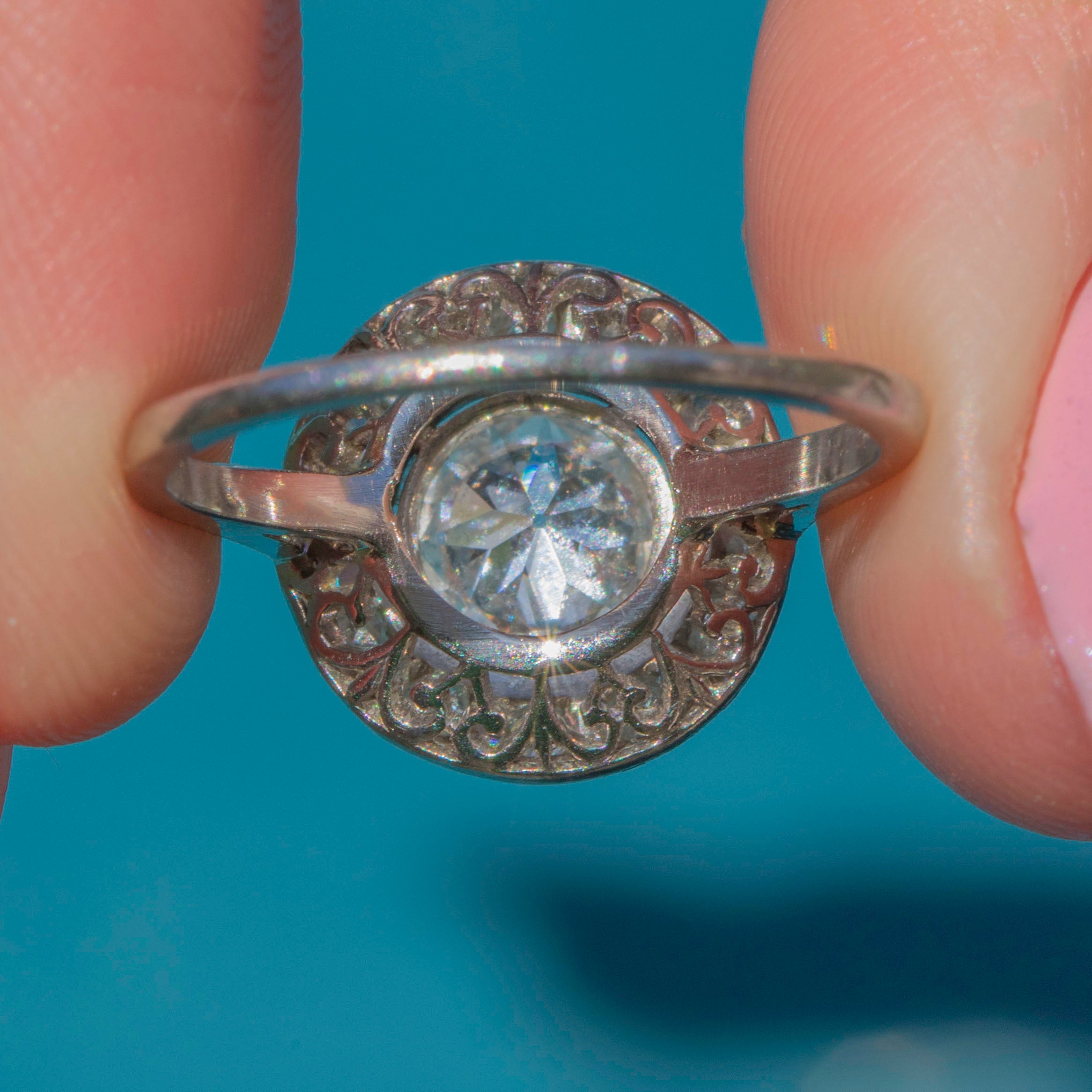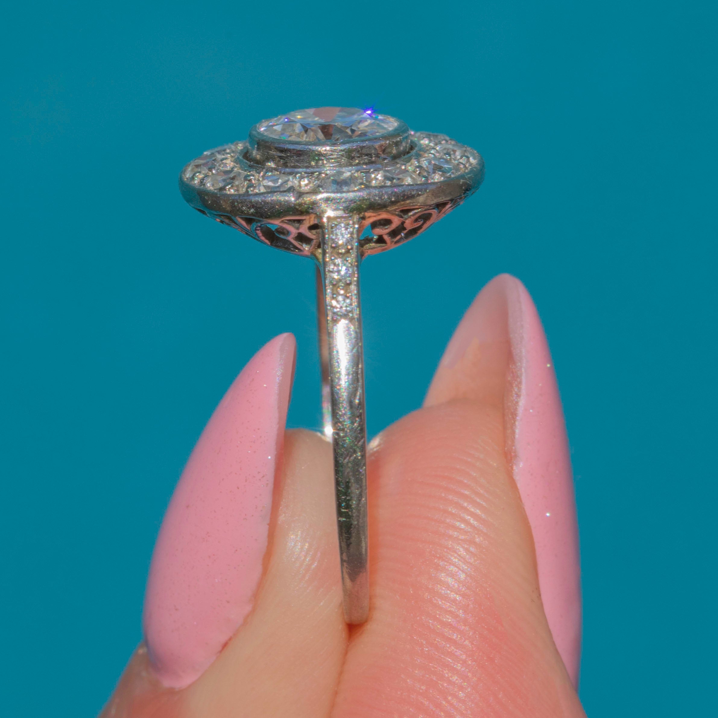 EXCELLENT: This French Art Deco Platinum Diamond target ring is in excellent condition. Each of her Diamonds is radiant and secure within their settings, with no chips or abrasions. With a secure band and little else to note, she is a truly special piece! The centre stone has some faint feather inclusions present, visible under a loupe with 10x magnification, but these are not visible to the naked eye. There are no dark spot inclusions in this wonderful antique Diamond- to the eye it is very bright white clear and sparkling! The diamond halo, an impressive 0.25ct overall, is also well matched with G to H coloured diamonds, due to their size and being assessed within the setting, it is not possible to assess the clarity. We can't get enough of this piece!