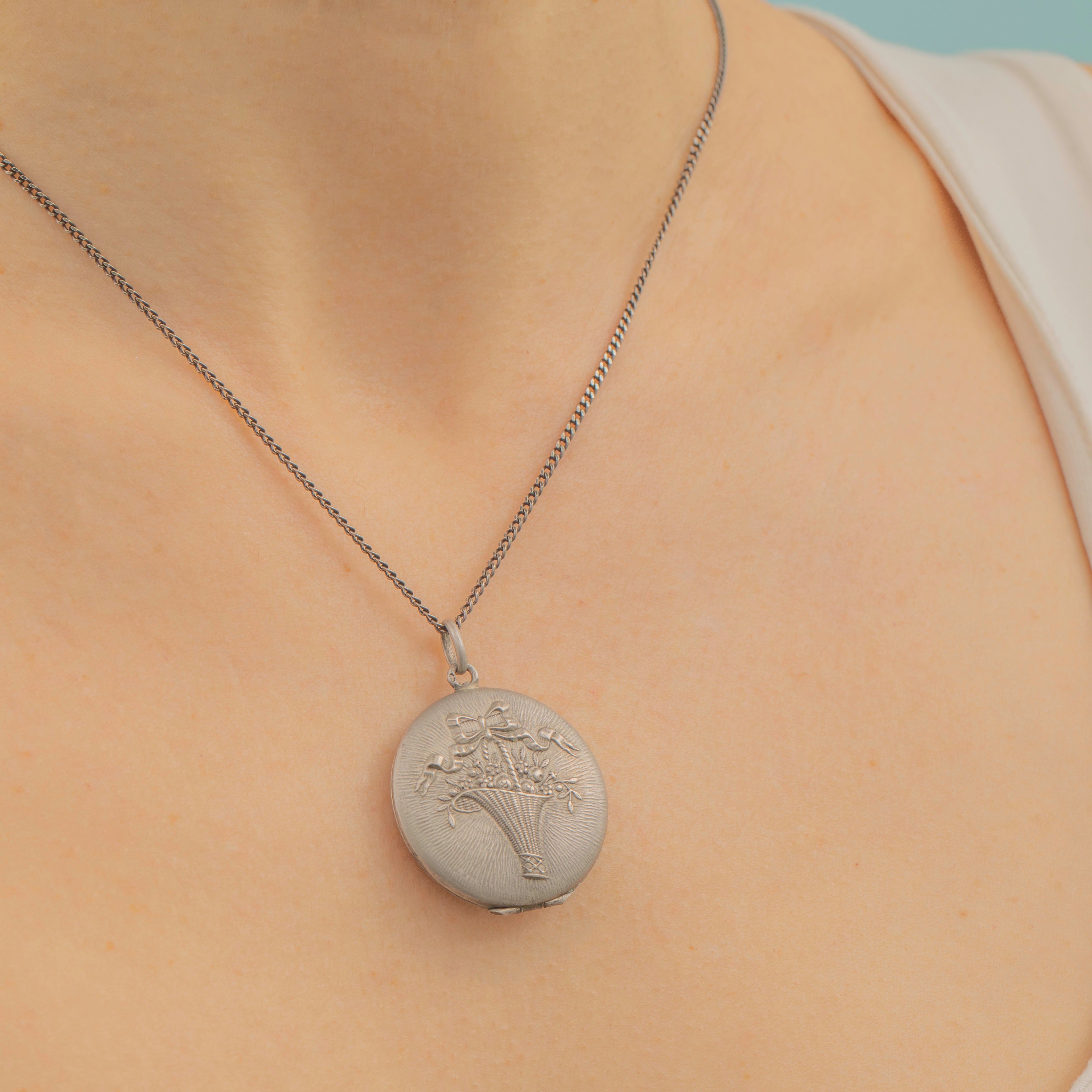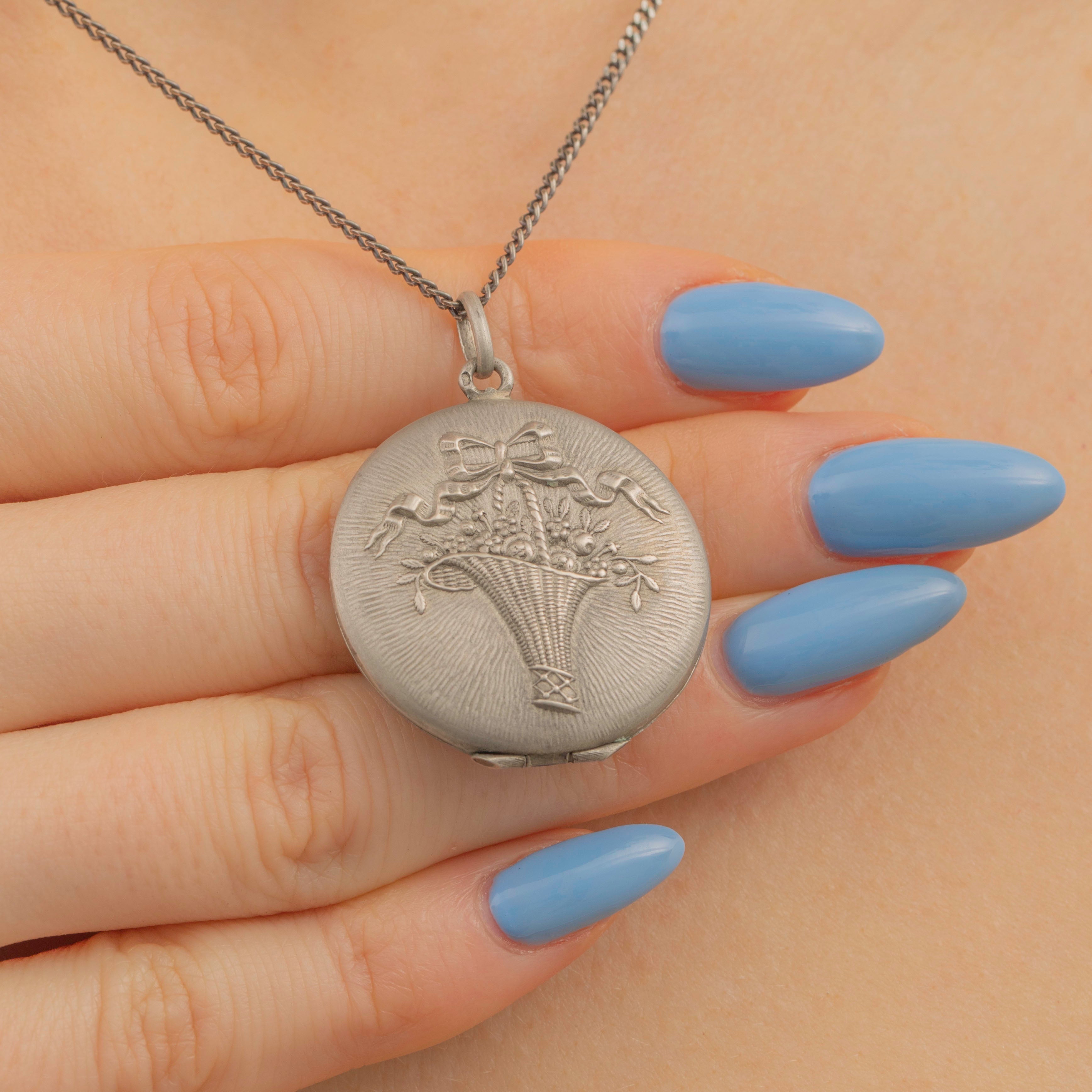 Epitomising the whimsical and ethereal aesthetic of the Art Nouveau era, this striking repoussé locket features an abundant basket of flowers with a perfectly tied ribbon on top! With space for two photographs to be added inside, this antique locket would make a lovely sentimental gift choice or wonderful treat for yourself.