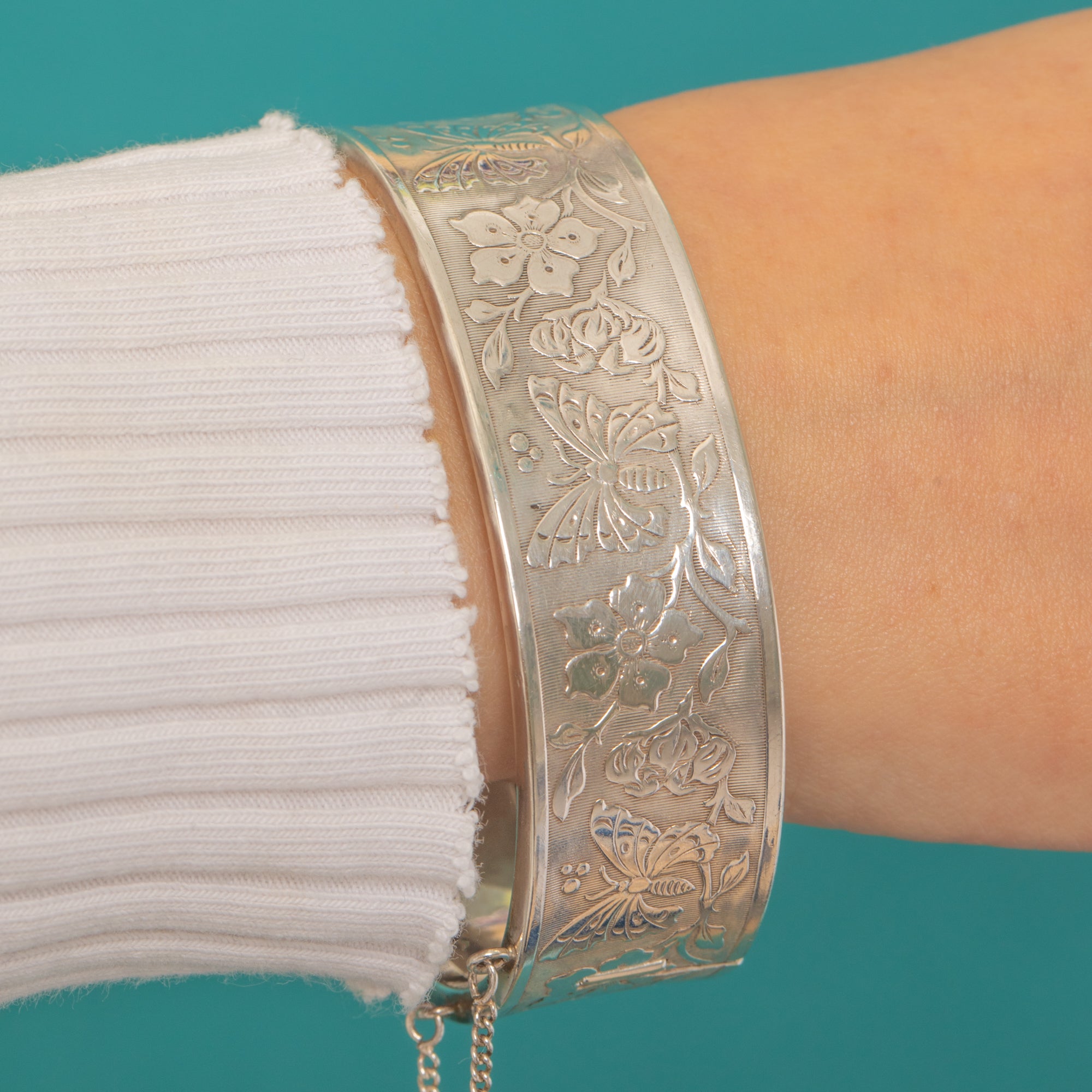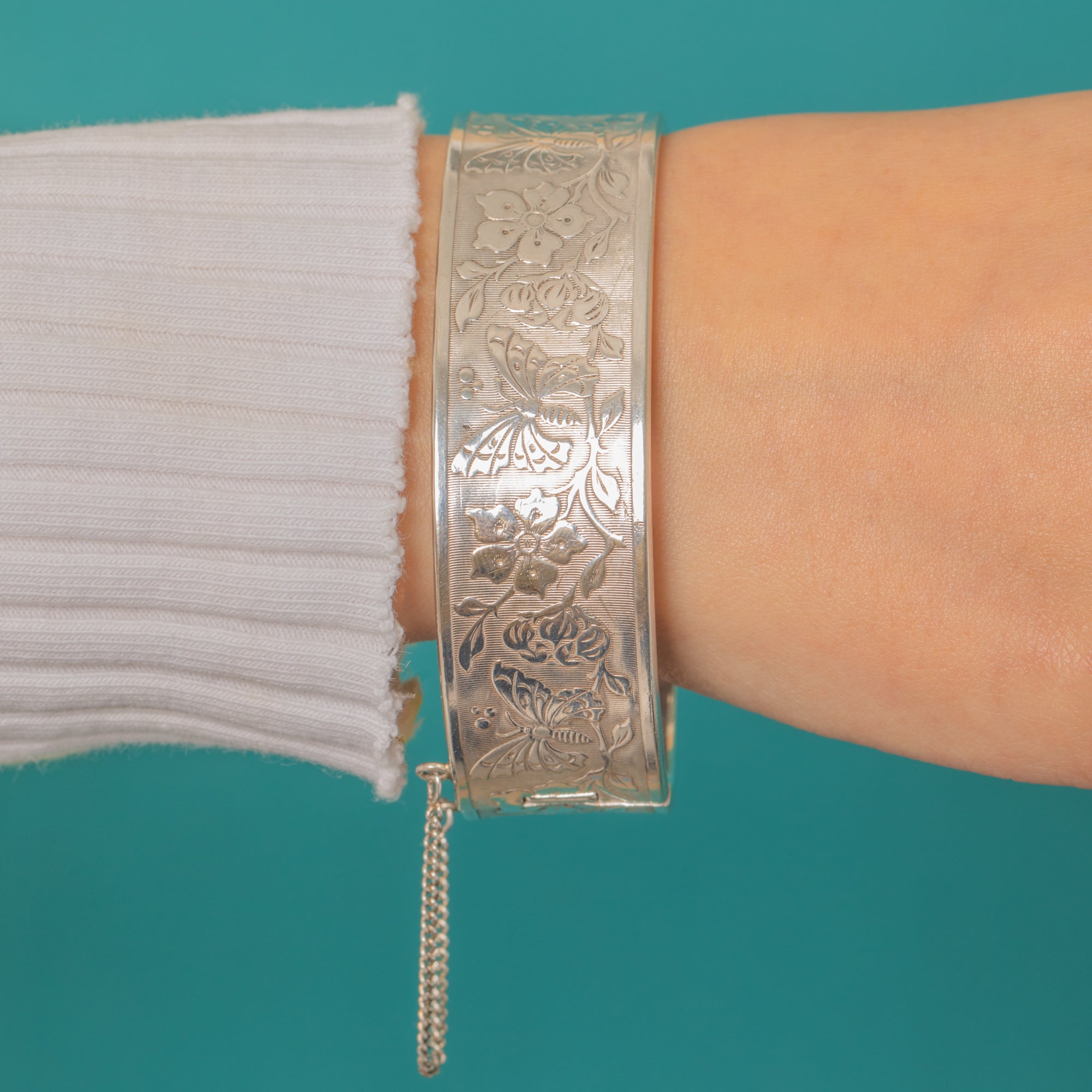 A wide, vintage Silver cuff bangle alive with bright-cut sparkle, this hinged cuff is intricately engraved with butterflies and flowing floral sprays over a fine linear ground. Raised border rims frame the design beautifully, giving a bold yet refined presence that feels timeless and nature-inspired.