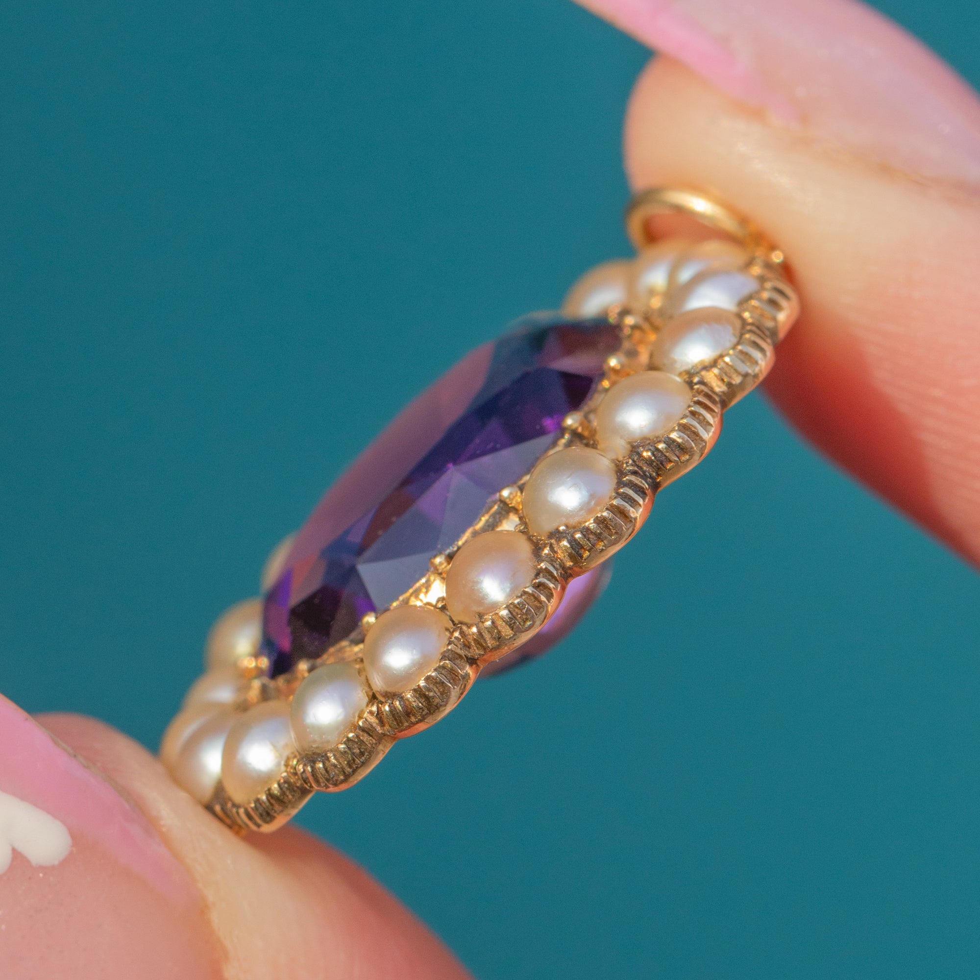 This enchanting Georgian charm is crafted in rich 15ct Gold and set with a glowing natural Amethyst framed by creamy Pearls. The 2.90ct Amethyst displays a soft violet hue and beautiful clarity with only minute natural inclusions, characteristic of antique hand-cut stones.