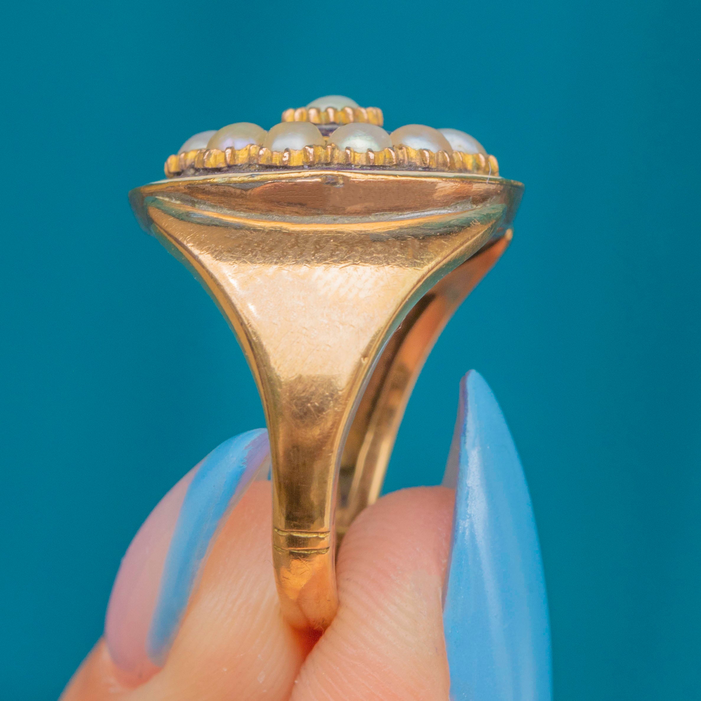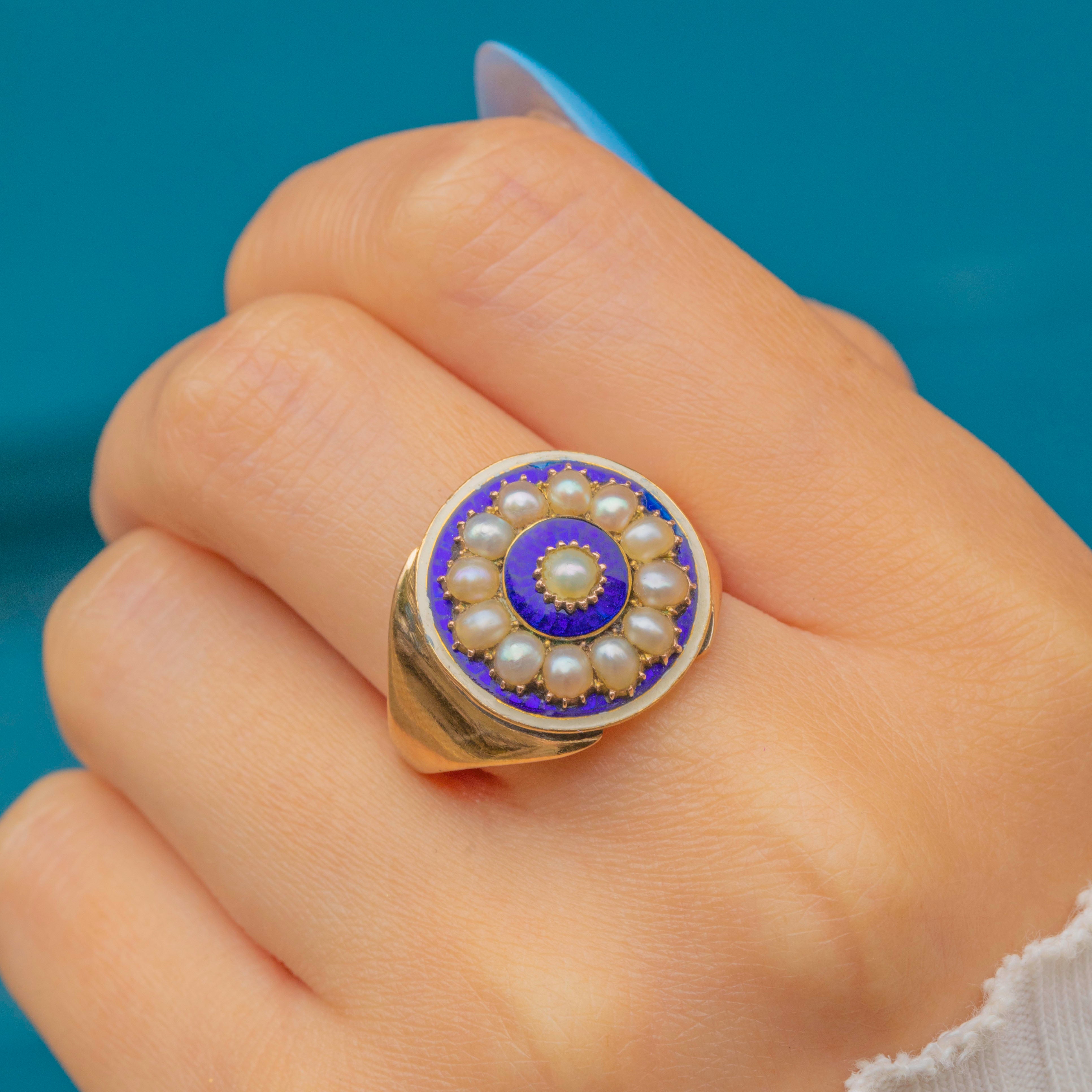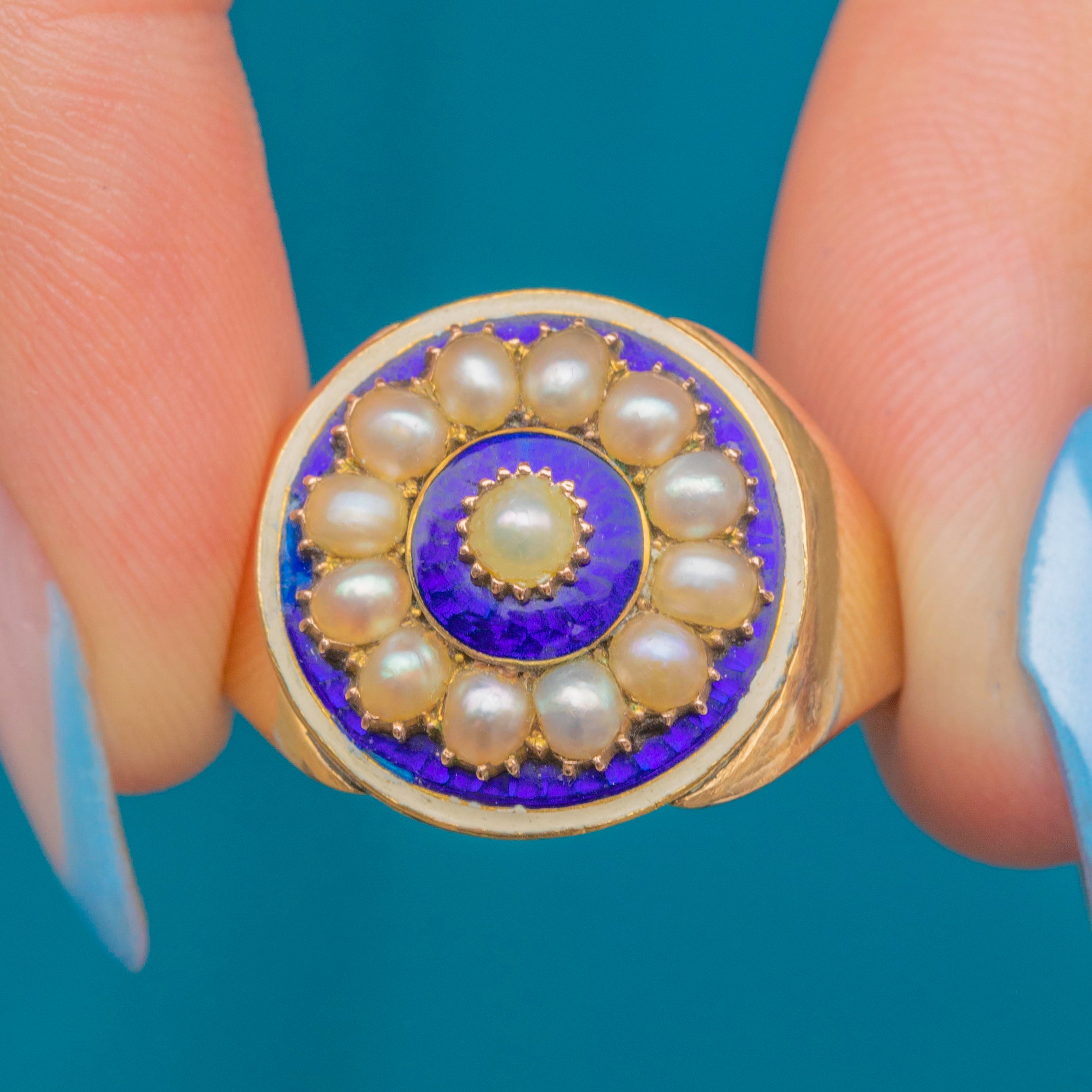 A halo of lustrous Pearls, each displayed within classic Georgian piecrust settings, is backed by a saturated royal blue Enamel ring face. The chunky 15ct Gold ring band tapers gently around the finger, its smooth, glossy form providing comfortable wear and adding ample antique allure to your collection.