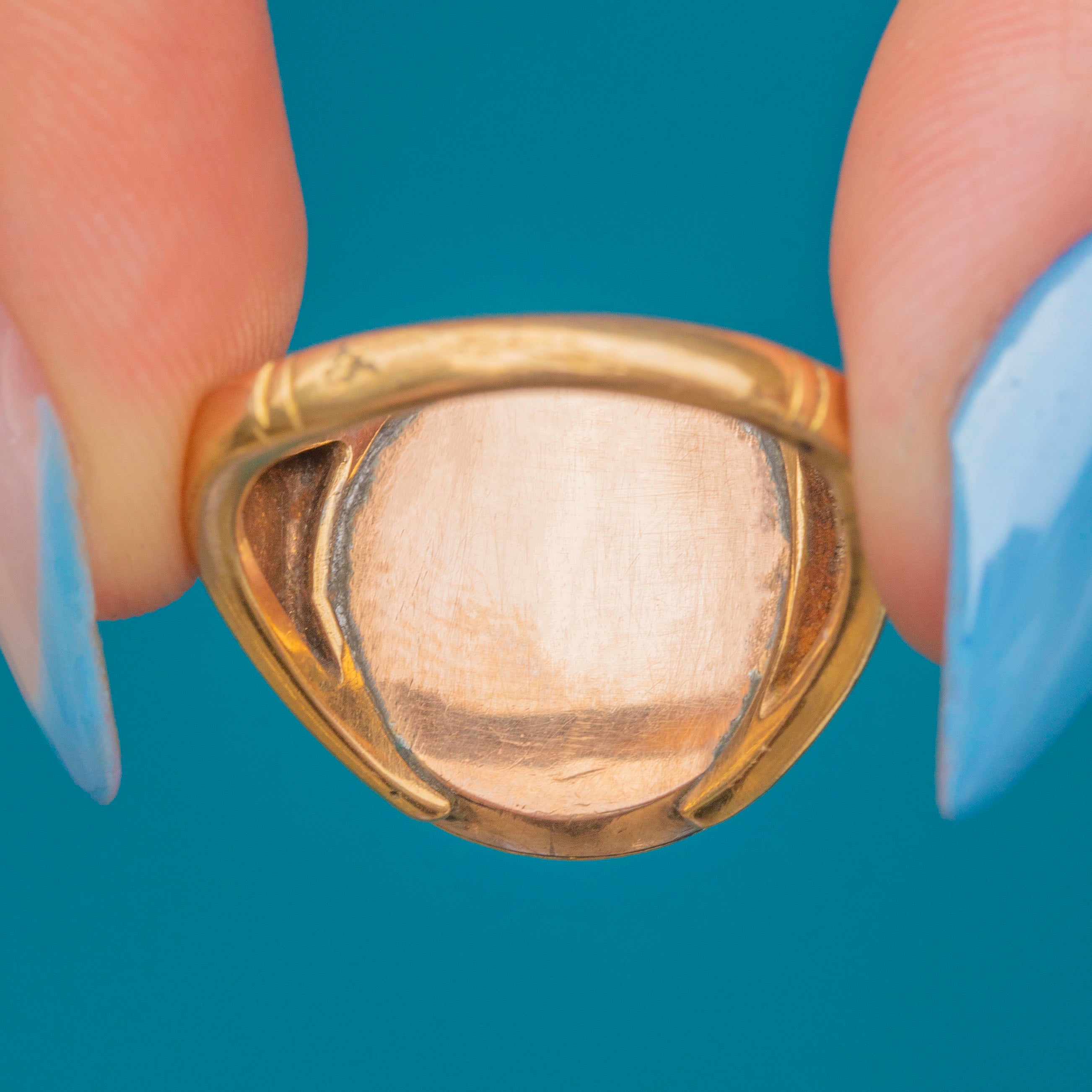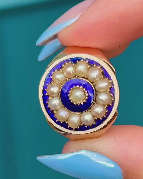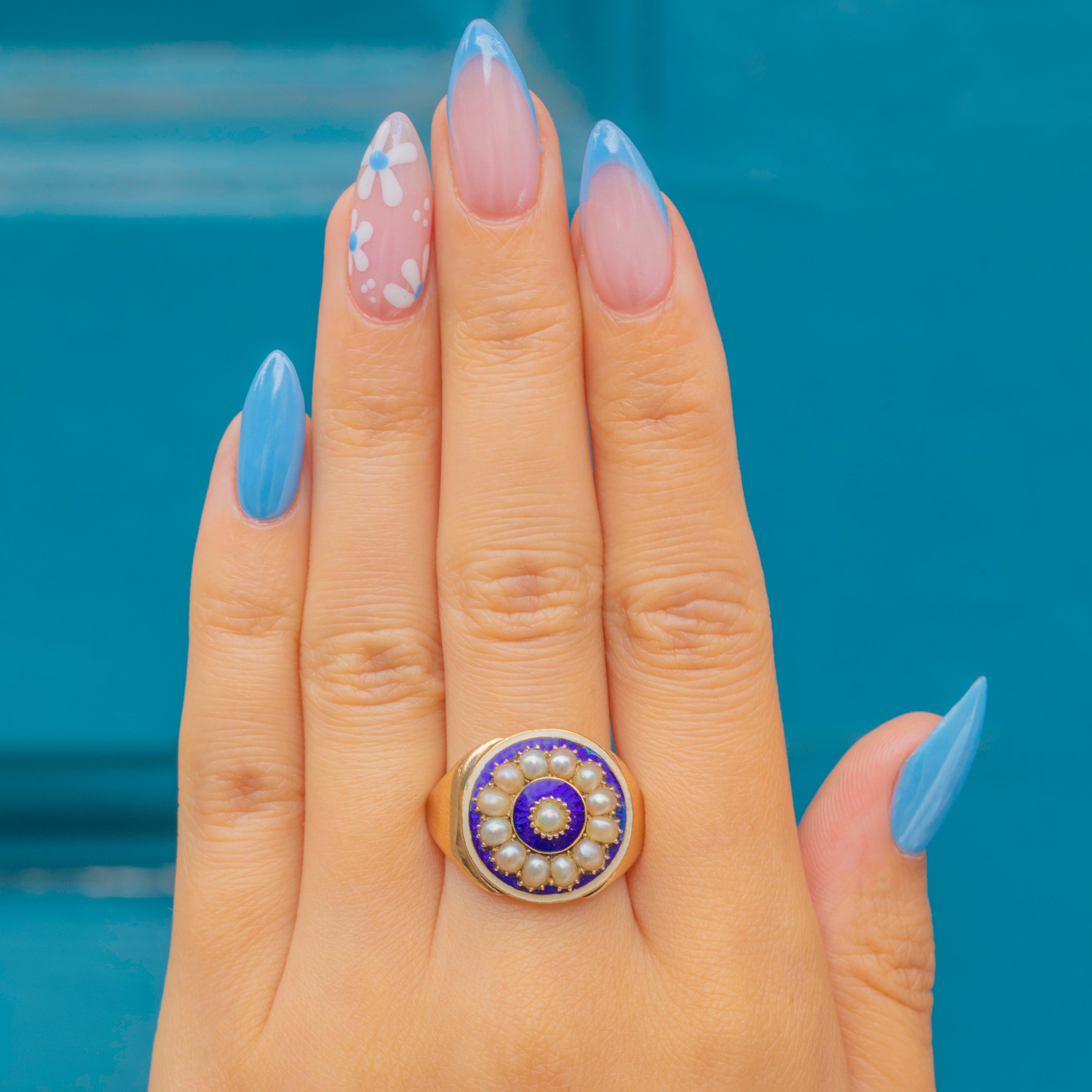 A halo of lustrous Pearls, each displayed within classic Georgian piecrust settings, is backed by a saturated royal blue Enamel ring face. The chunky 15ct Gold ring band tapers gently around the finger, its smooth, glossy form providing comfortable wear and adding ample antique allure to your collection.