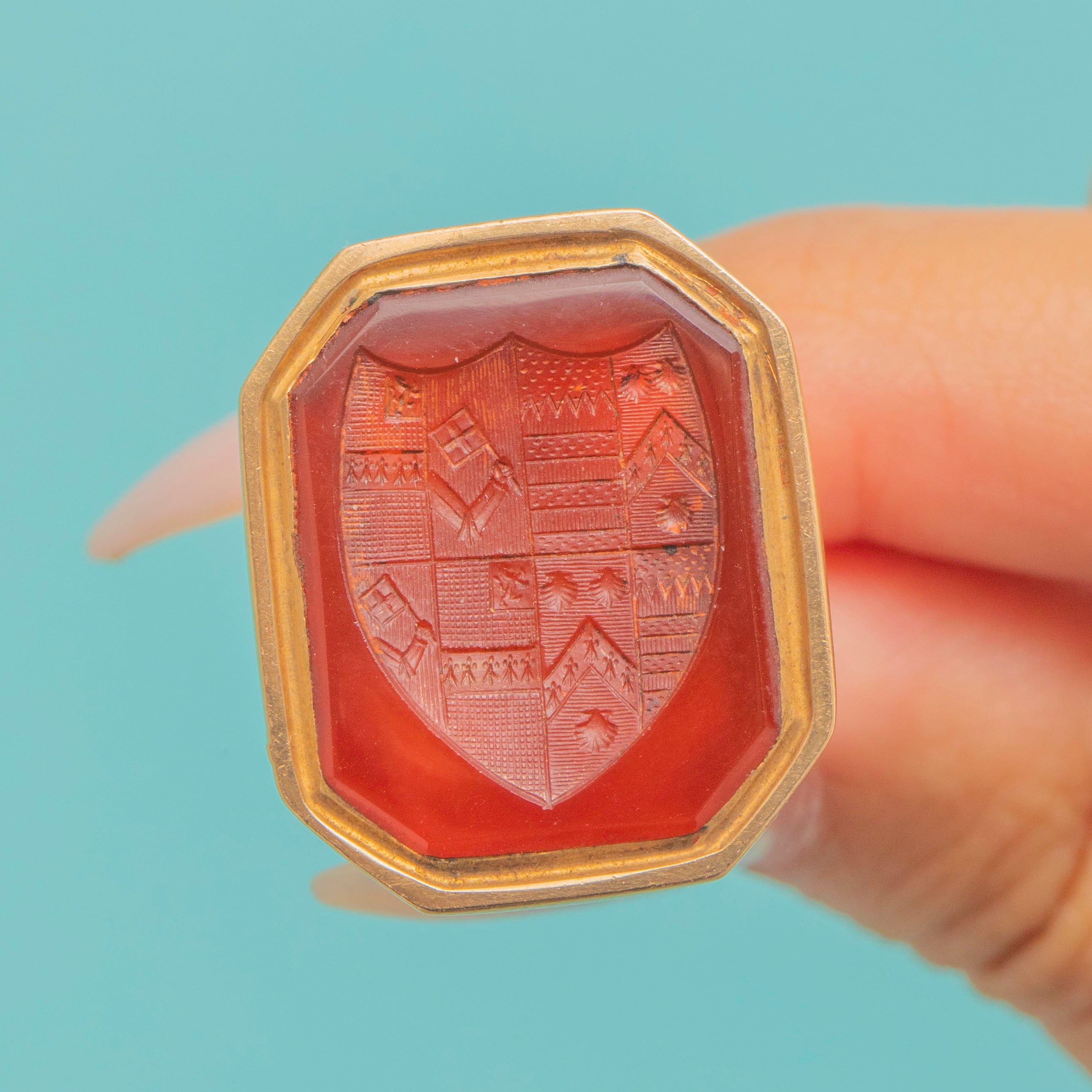 This example features a beautifully carved Carnelian panel, depicting a finely detailed British coat of arms. The deep orange-red hue of the Carnelian contrasts elegantly against its richly coloured 15ct Gold mount. Its substantial size and refined detailing make this piece a true collector’s jewel and an evocative symbol of Georgian style.