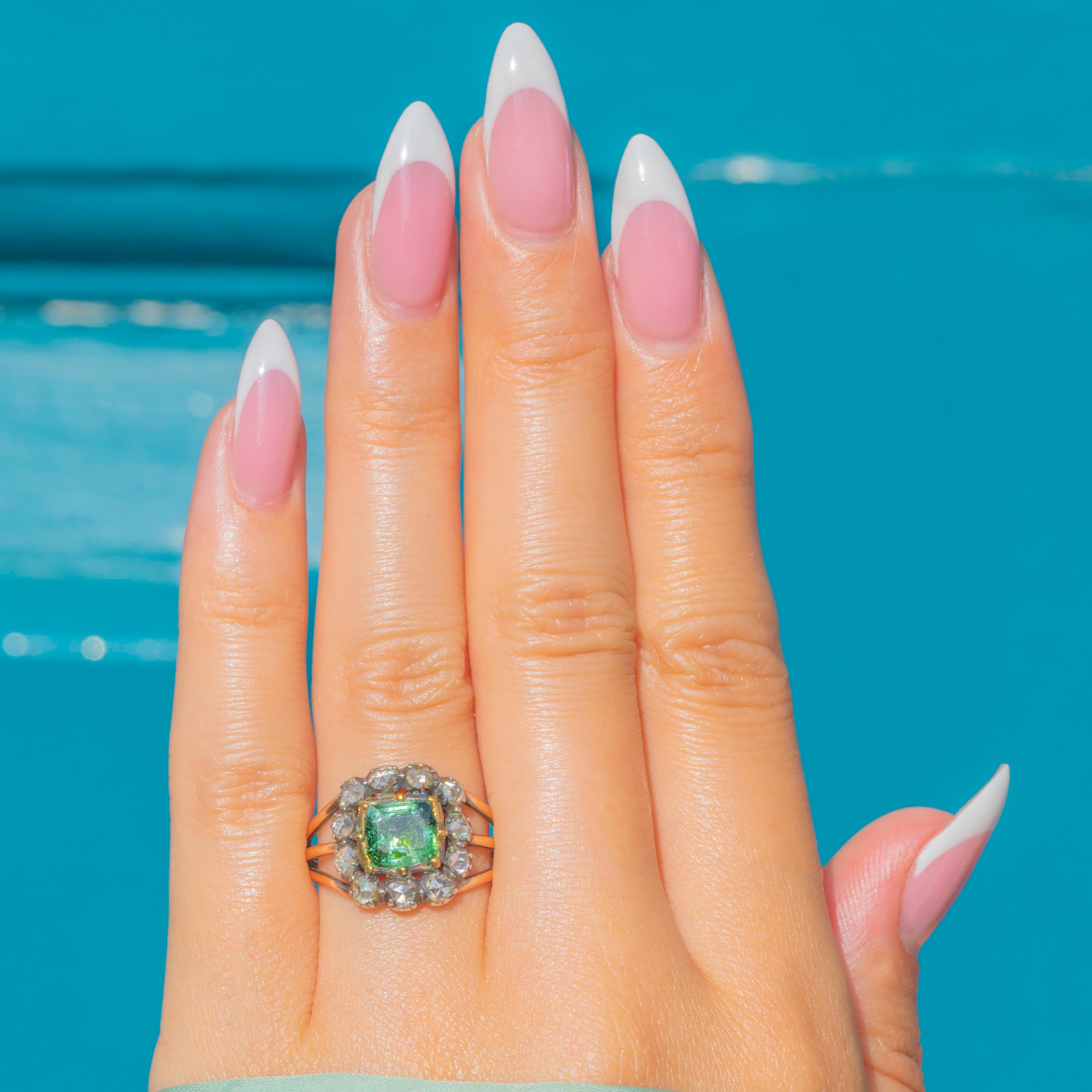 This Georgian ring captures classic elegance with a vibrant square Emerald set in Silver, flanked by sparkling Rose-Cut Diamonds. The 15ct Gold band provides a warm contrast to the cool Silver settings, highlighting the rich green of the Emerald.