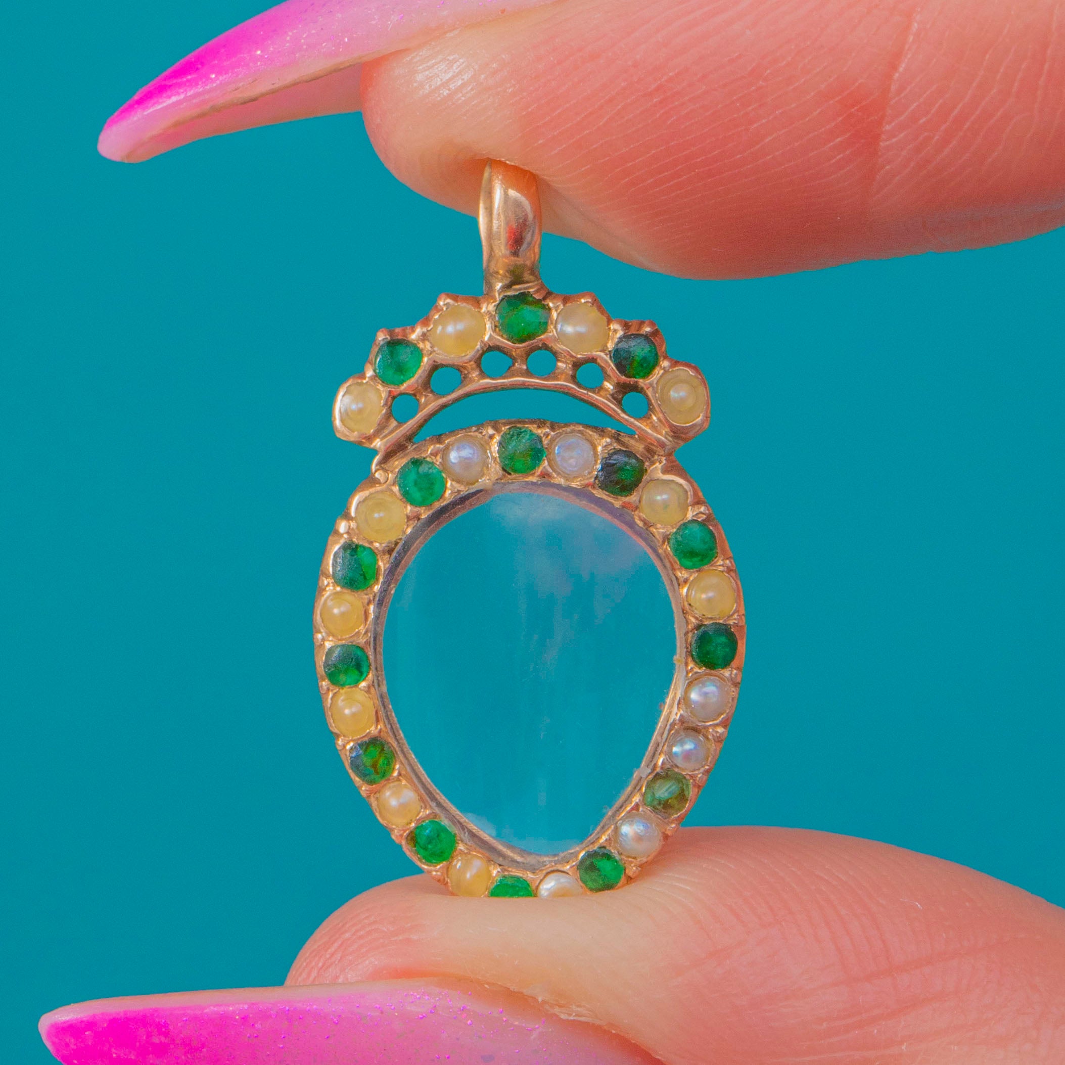 VERY GOOD: A rare find approximately 250 years old! The structure is beautifully intact. The locket back opens and closes shut tight with no damage. It even has the original glass! Some wear to the 15ct Gold and and the gems- commensurate with age. Two Pearls sit next to each other rather than alternating Emerald and Pearl- (this is not a replacement but has always been so due to the number of settings). Overall extremely well preserved for the period and a rare dainty design and gemstone combination.