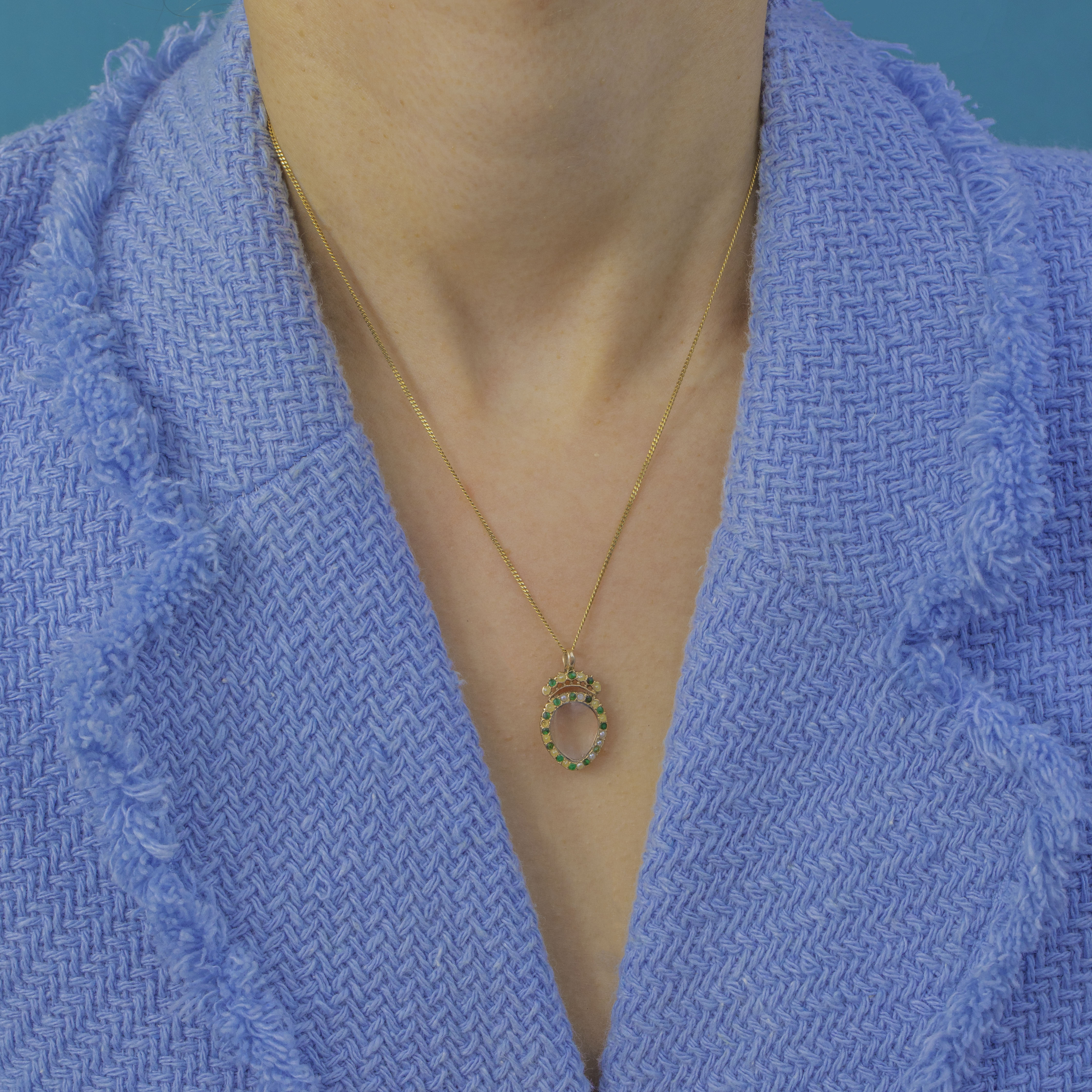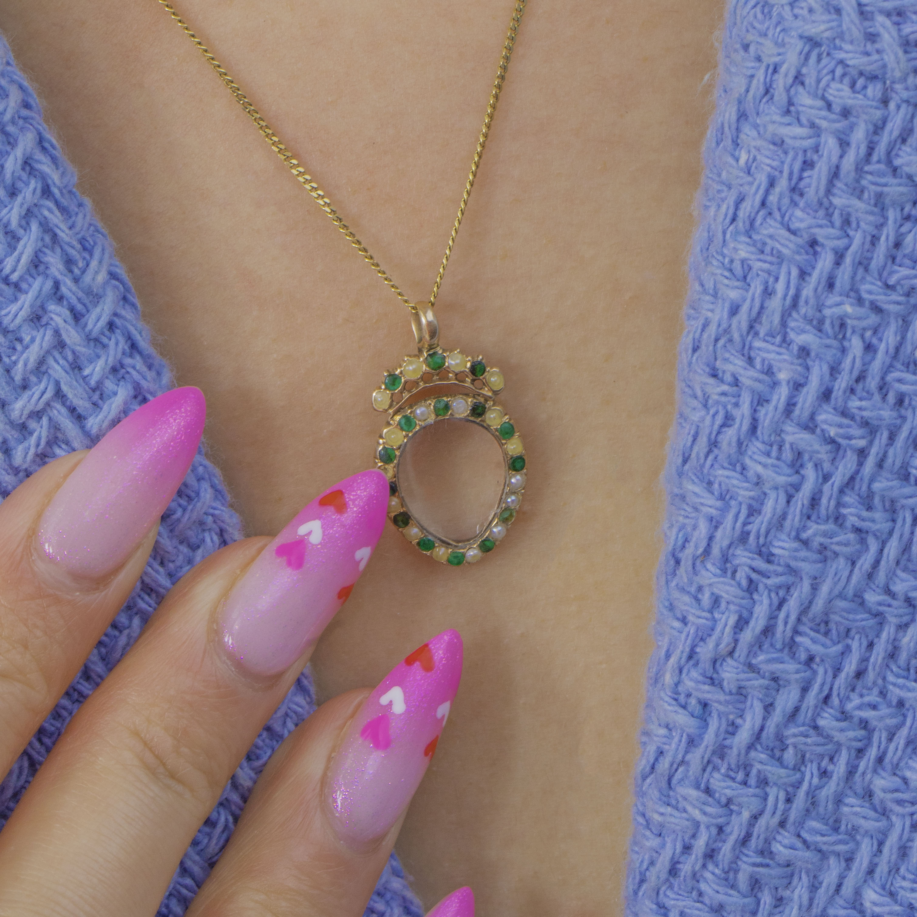 This sweet Georgian heart locket in glowing 15ct Gold, edged with a delicate border of Emeralds and Pearls. The petite but impactful gems trace the silhouette with charming period character, creating a soft, romantic glimmer around the heart.