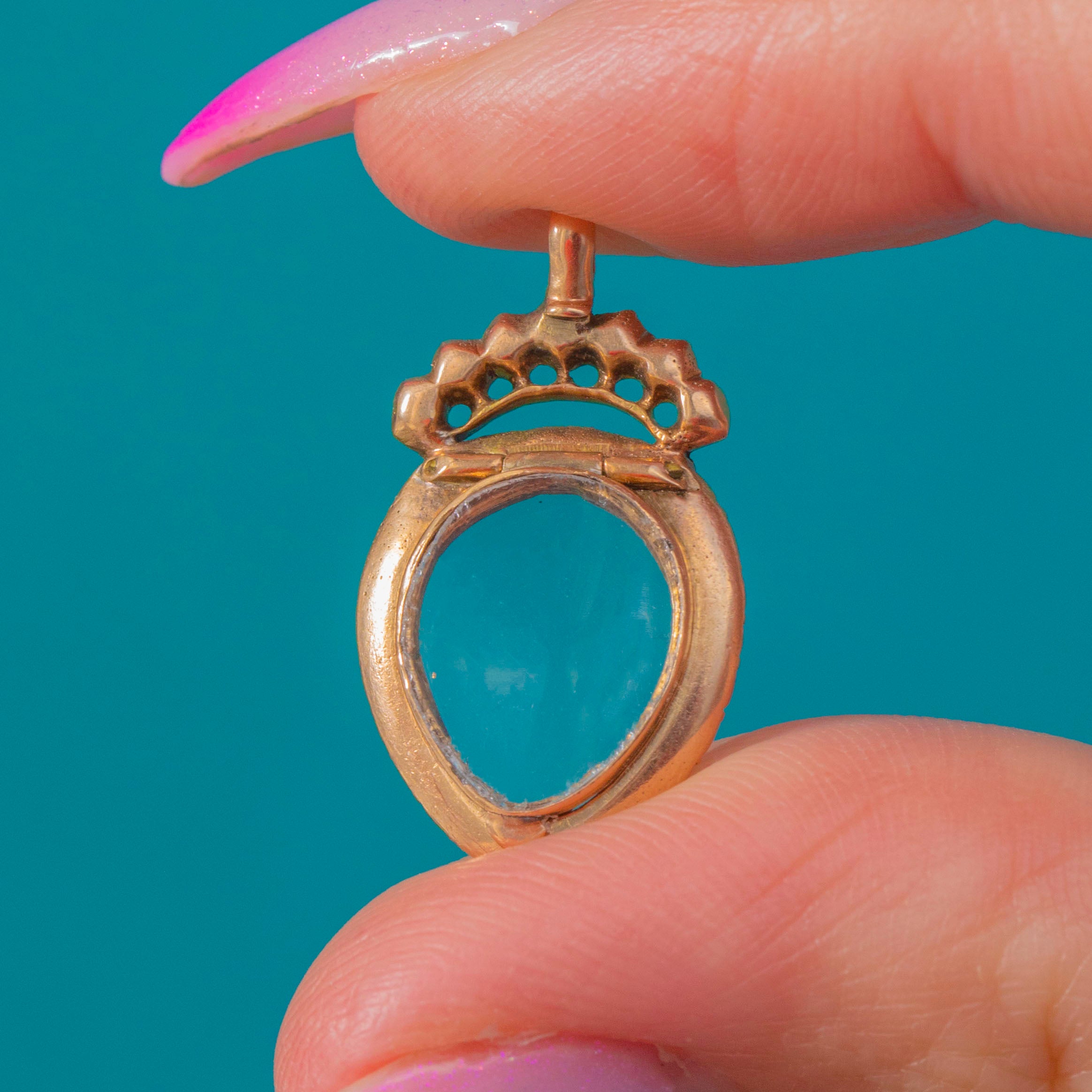 Dated to c.1780–1790, this dainty treasure captures the sentimentality of the era in miniature. A sweet original Georgian 15ct Gold Emerald Pearl locket in a stylized heart and crown design- typical of the period!