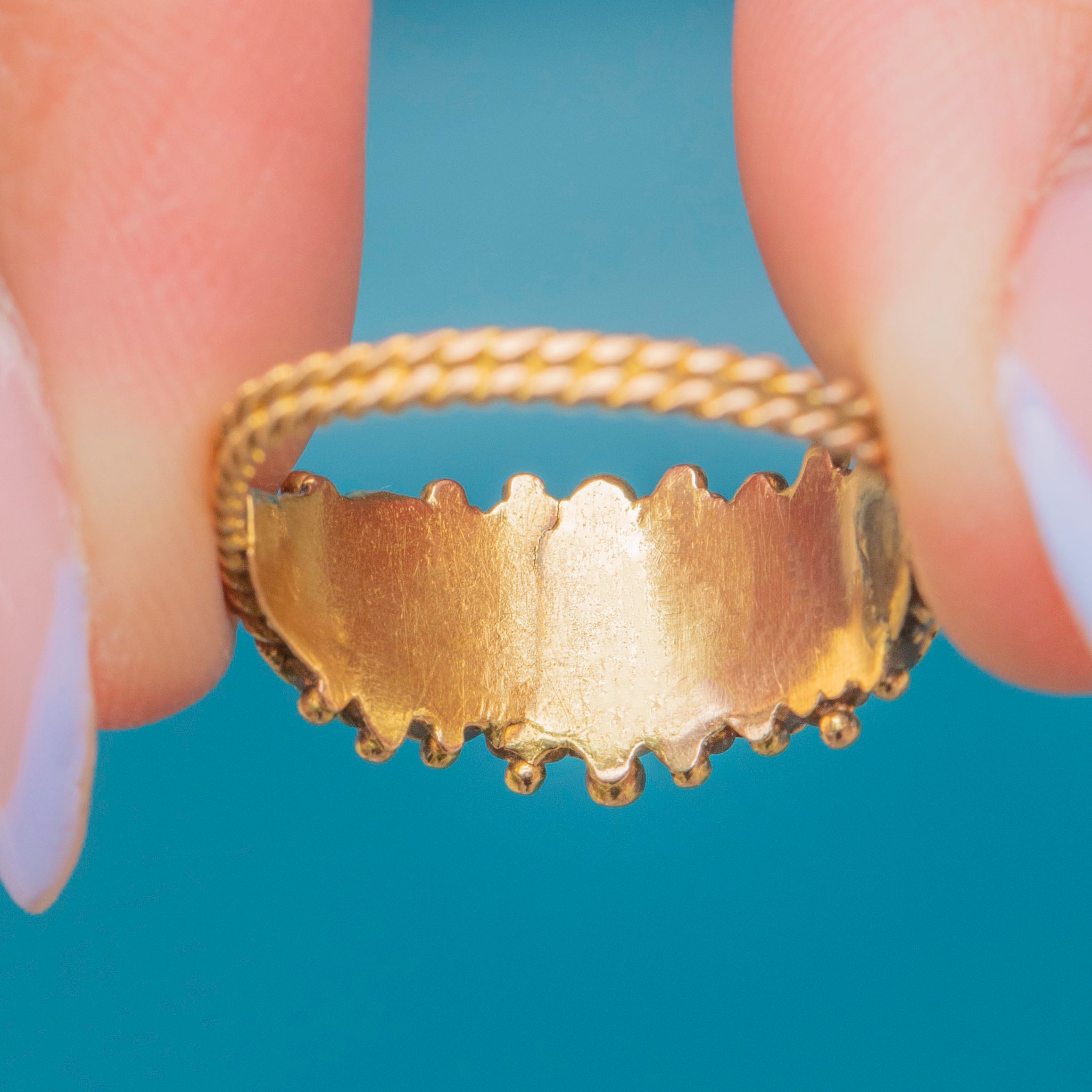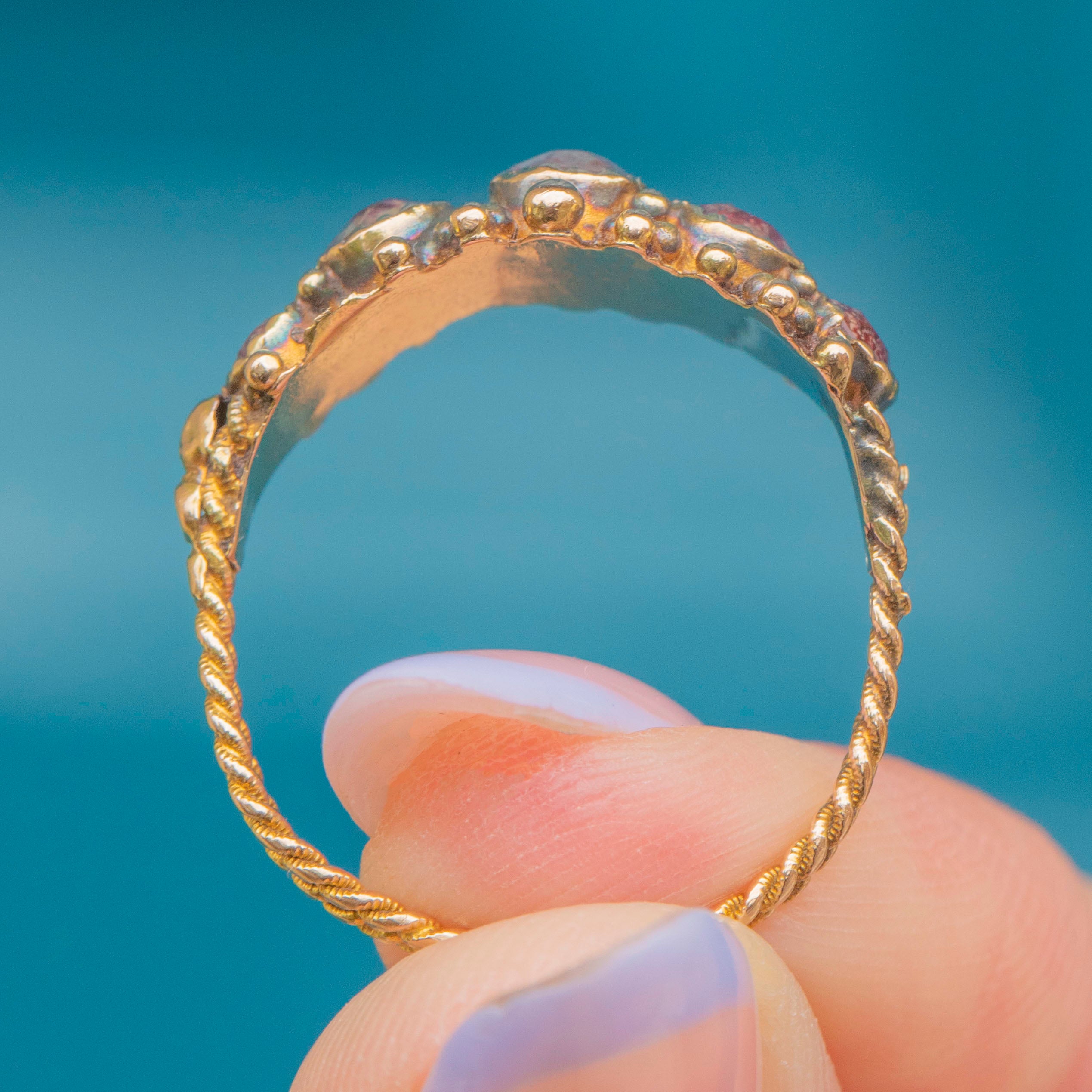 GOOD: This Georgian 15ct Gold Foiled Amethyst five stone ring is in good condition, especially considering her grand age. The Amethysts, although they have some wear to them, are set securely and foiled beautifully, a wonderful sight. The 15ct Gold is brightly saturated, and while one of the beaded details is missing, this does not affect the overall impact on the piece. Her twisted rope band has slightly warped, however, she still sits flush on the finger. At over 200 years old, this Georgian ring can be enjoyed straight from its box!