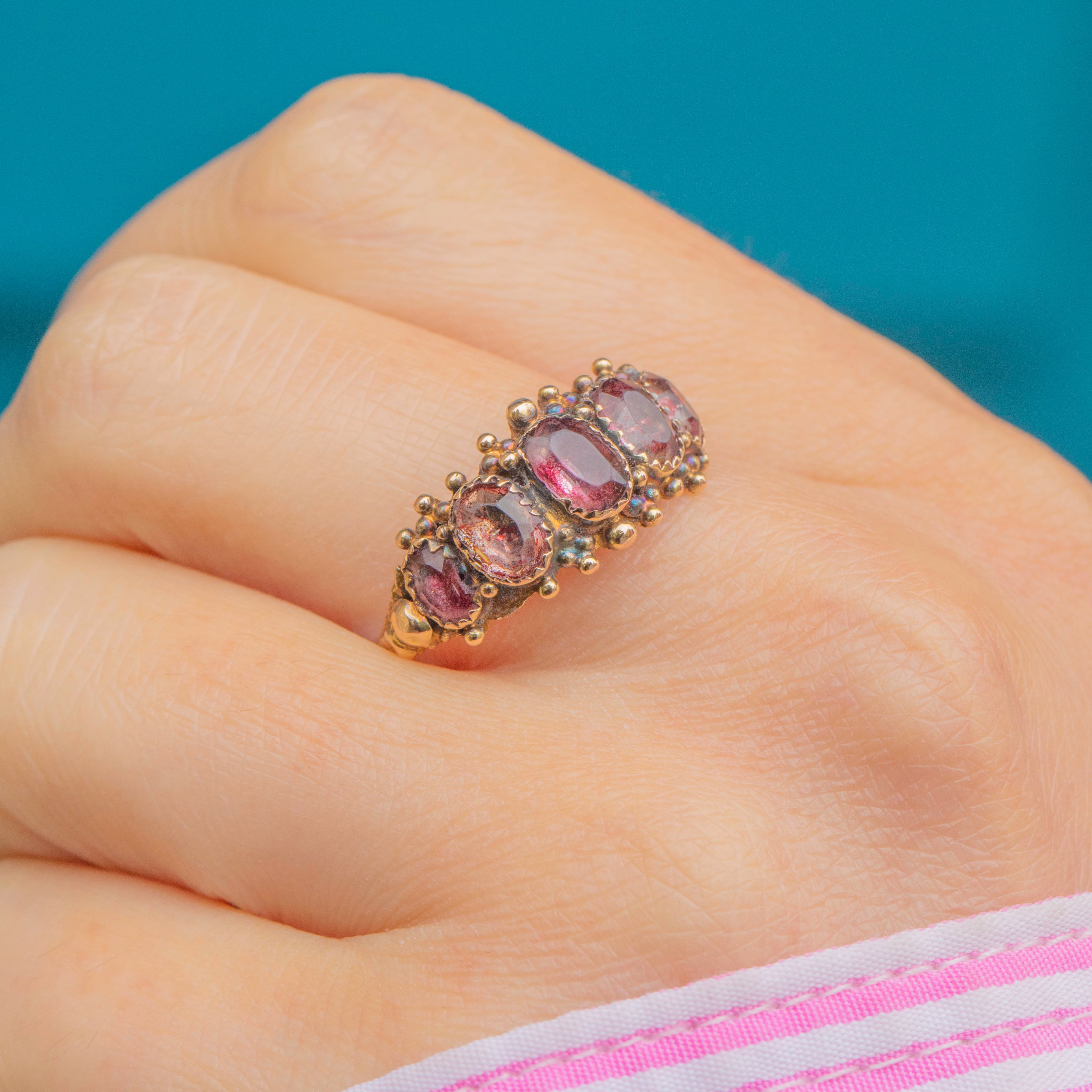 We adore the design of this Georgian 15ct Gold foiled Amethyst five stone ring- which is quintessentially Georgian in design!