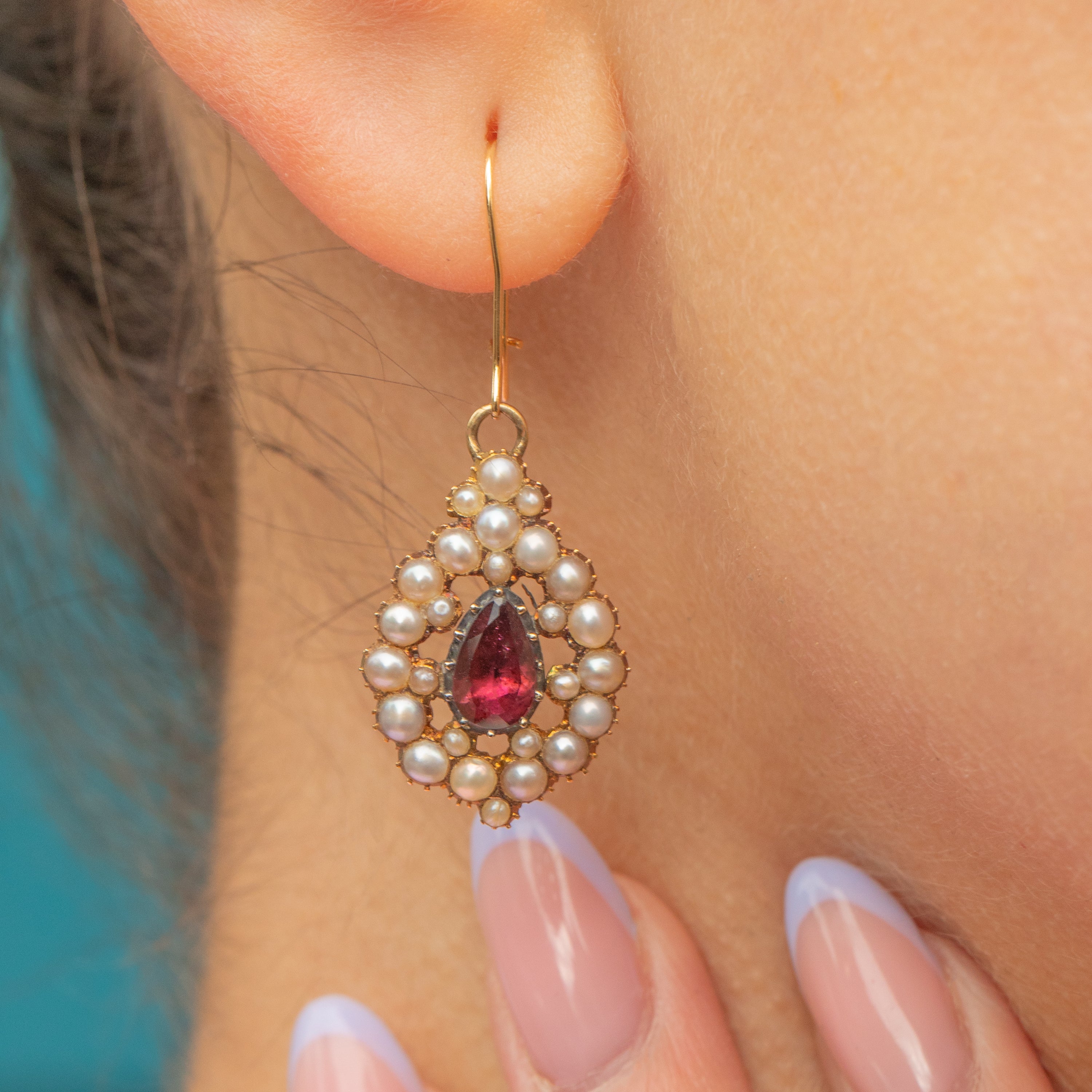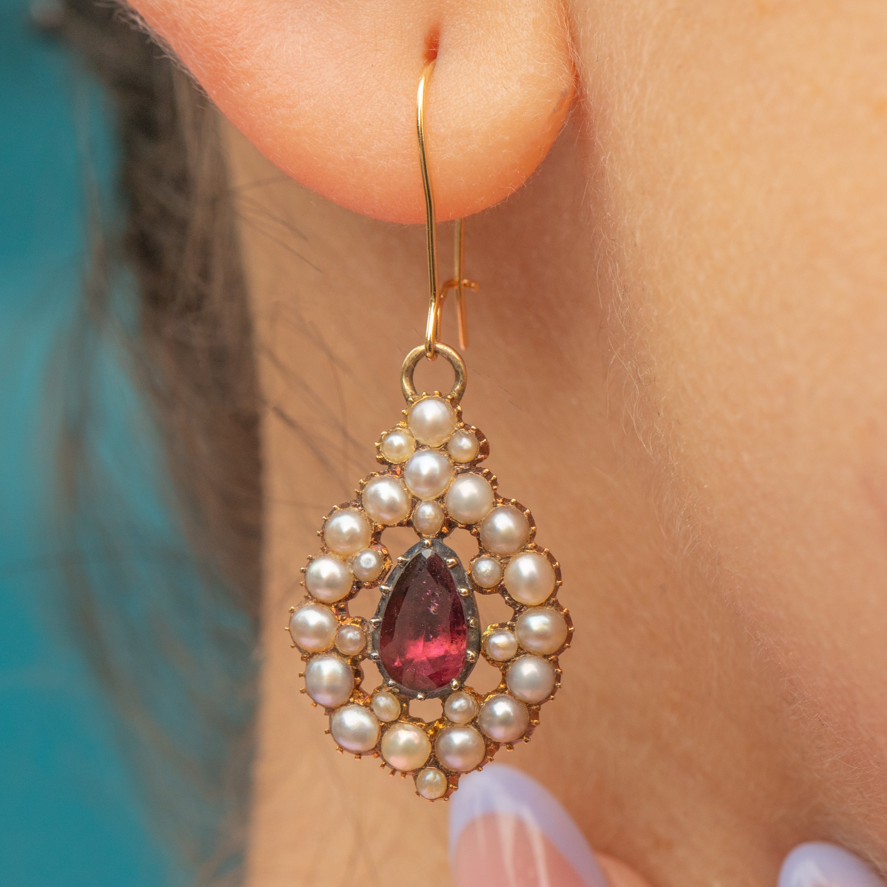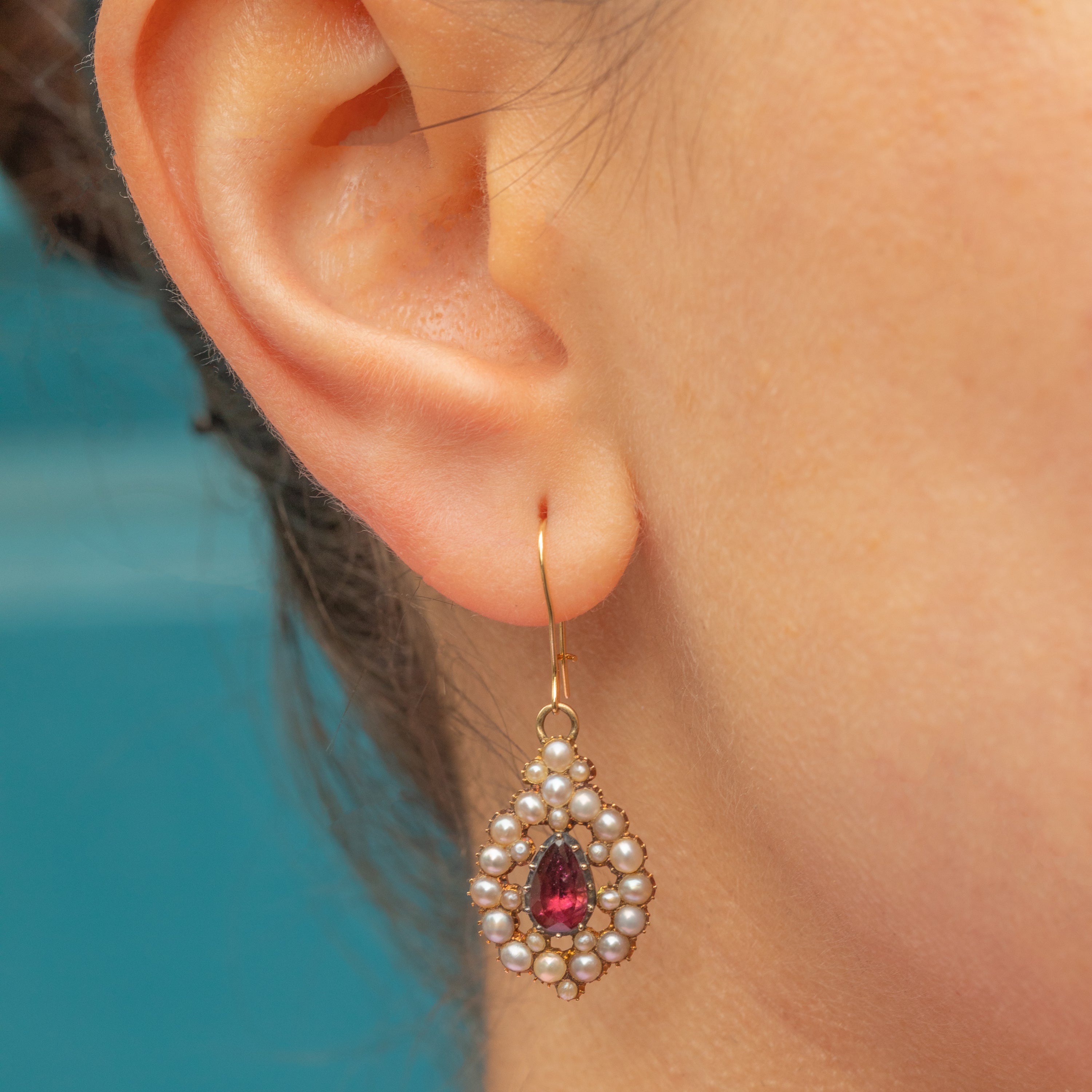 These Georgian 15ct Gold Garnet Pearl cluster drop earrings radiate antique charm!