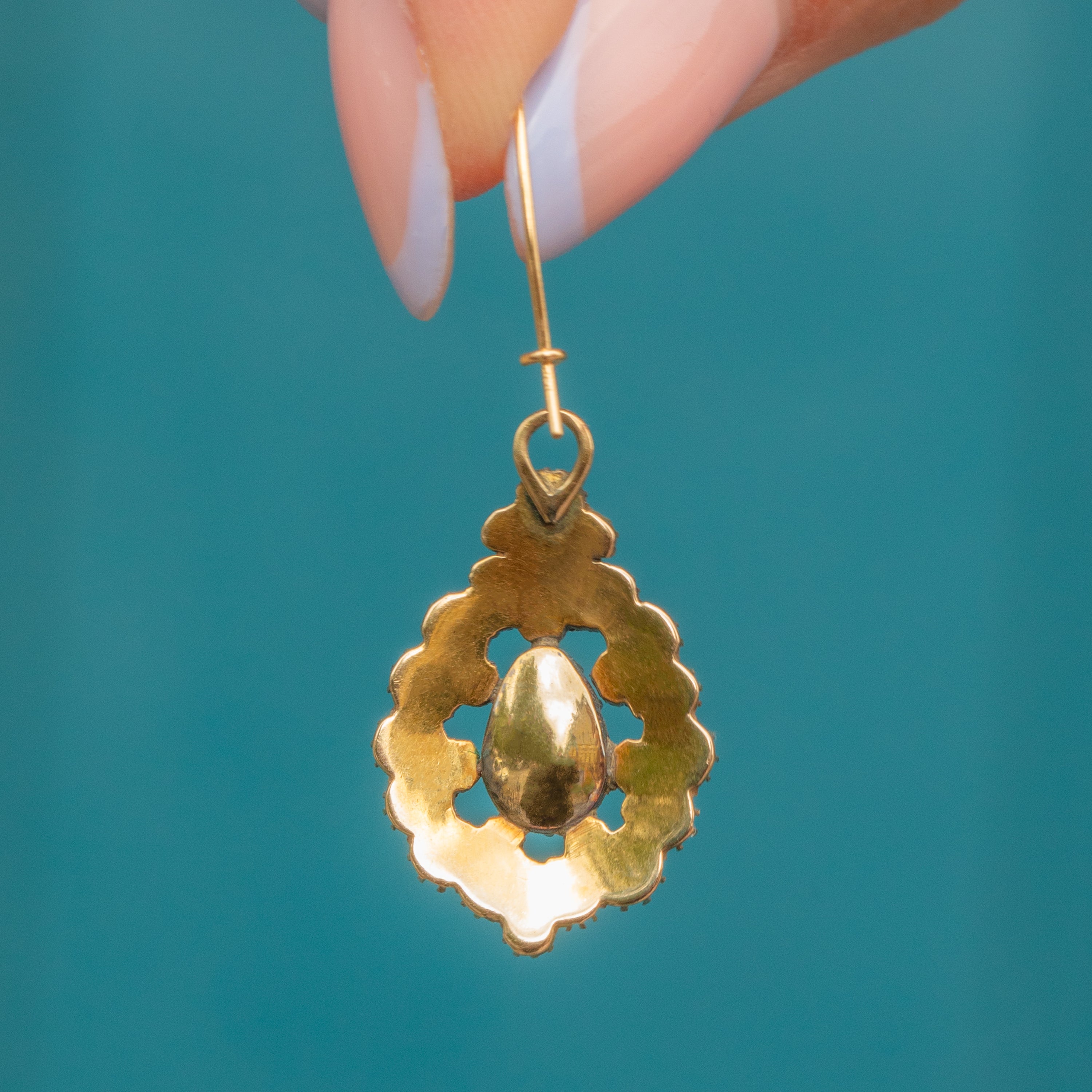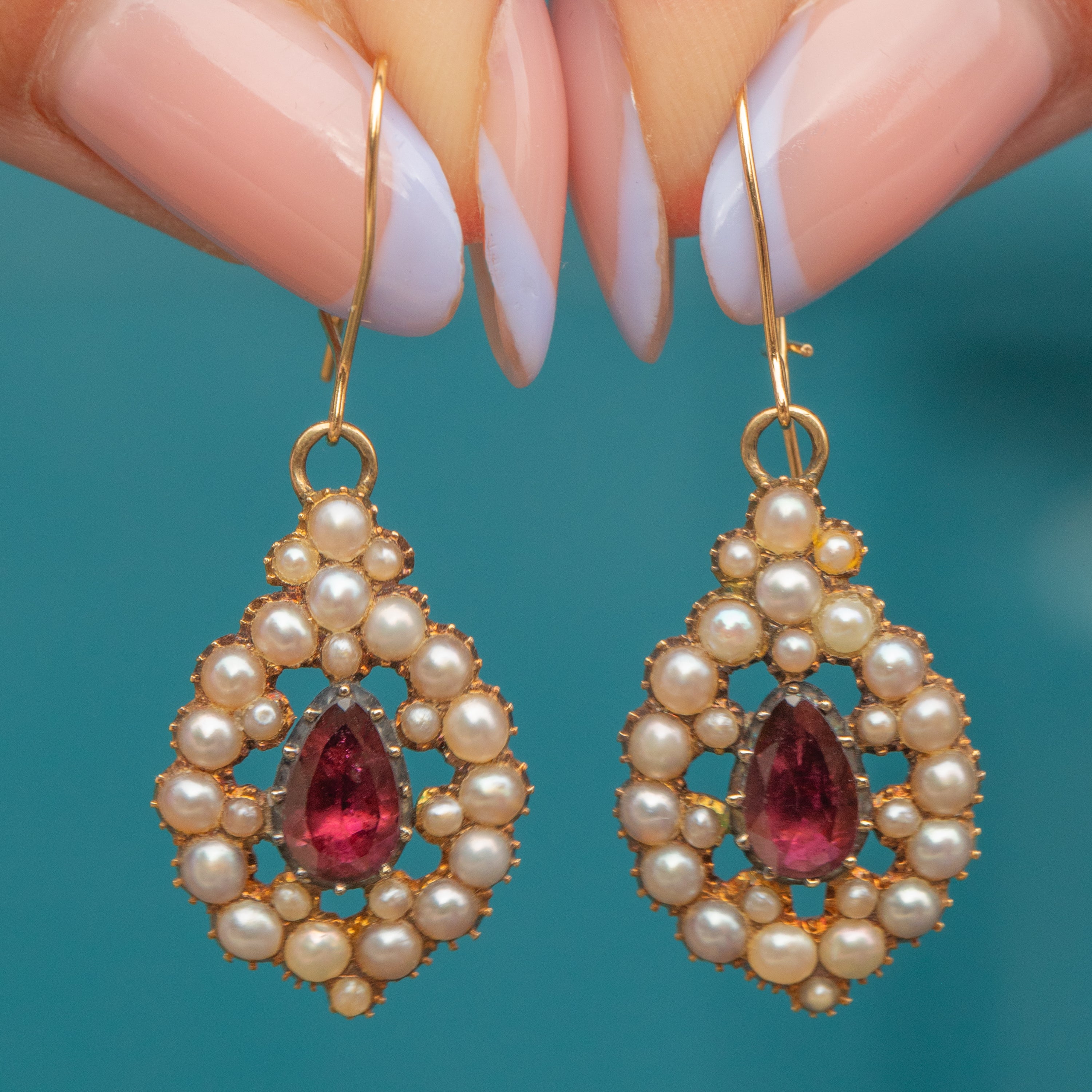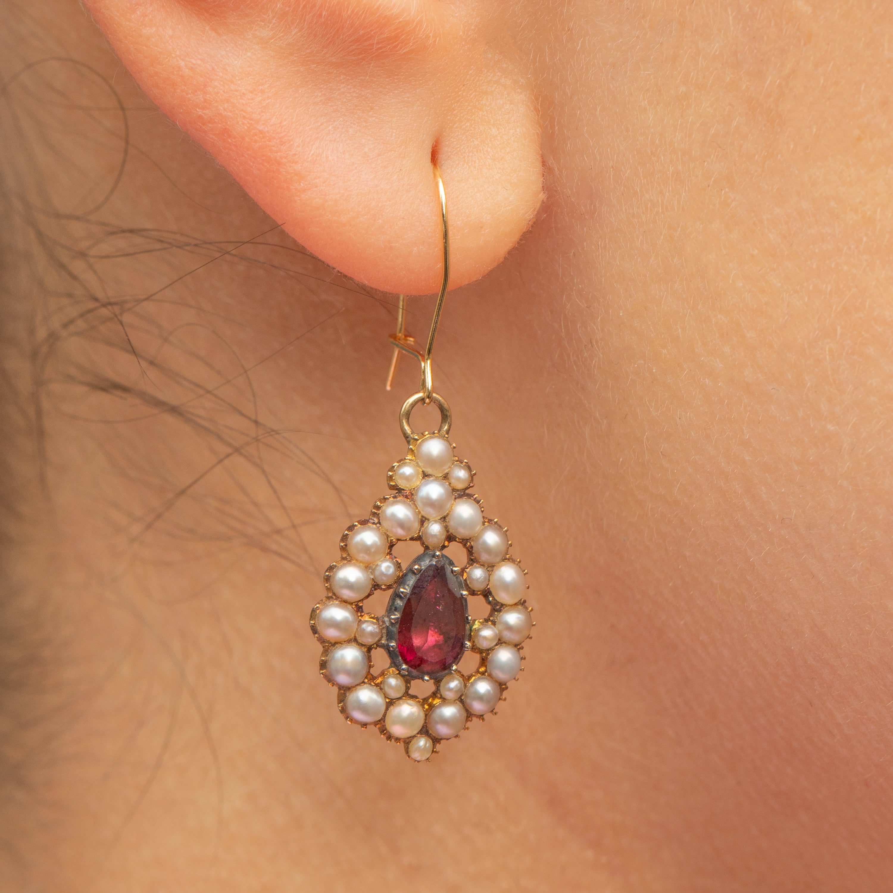These Georgian 15ct Gold Garnet Pearl cluster drop earrings radiate antique charm!
