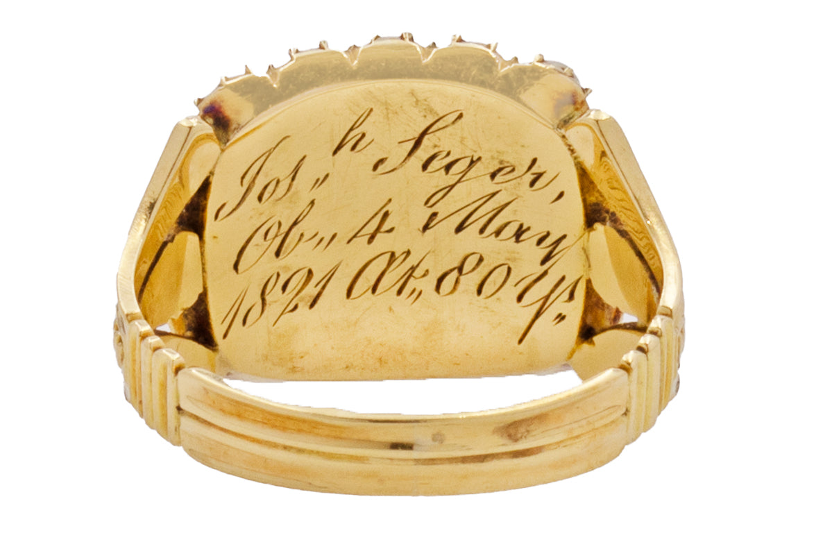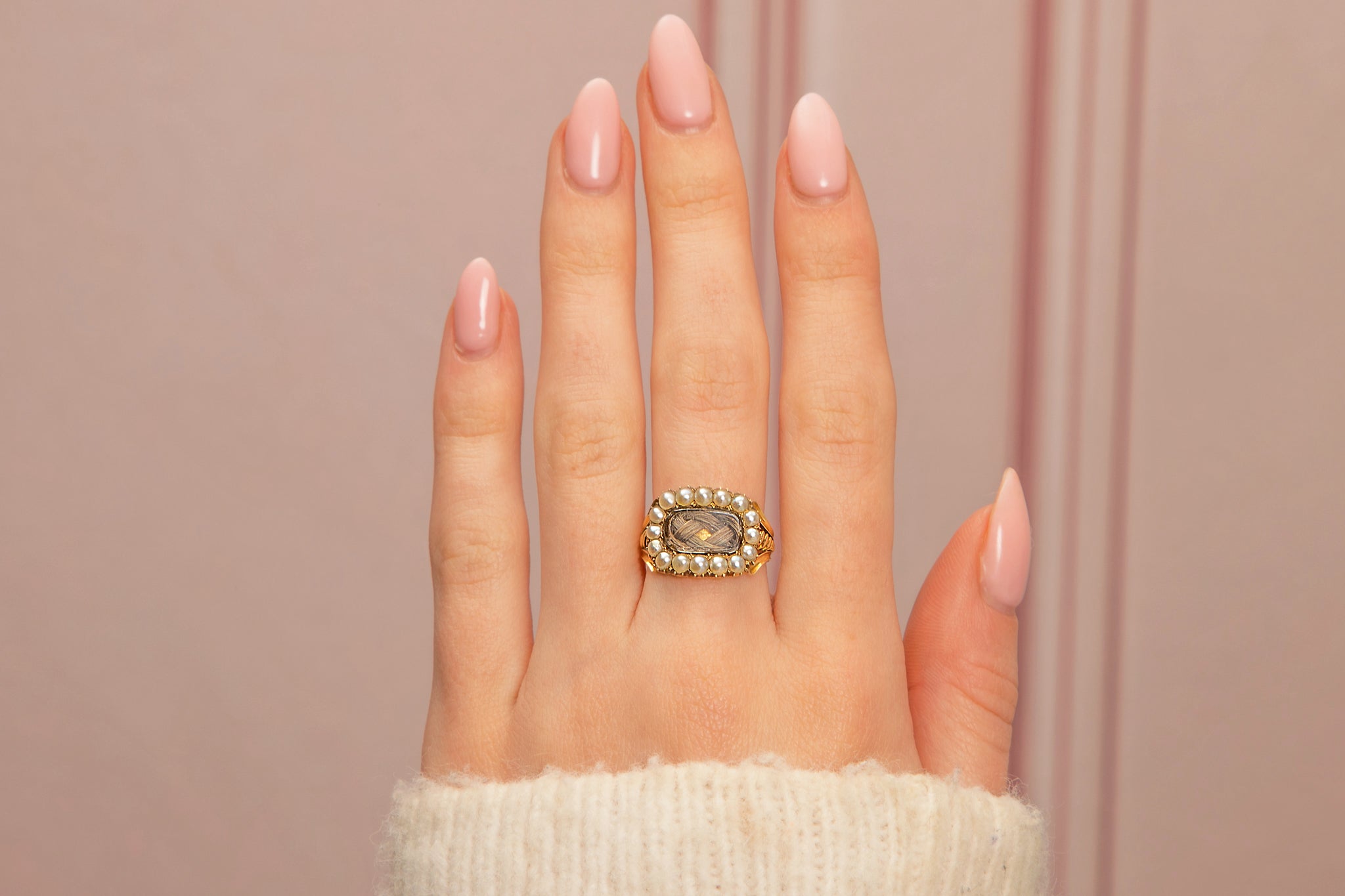 A fine collector's item, this rare Georgian 15ct Gold Mourning ring has a lovely inscription on the reverse, reading 'Josh Seger ob, 4th May 1821 at 80ys' meaning this ring was made to commemorate this gentleman's life! Perfect for any avid antique collector, this Georgian ring is inlaid with luminous Pearls haloing delicately braided blonde hair at her centre, setting behind a dainty pane of glass