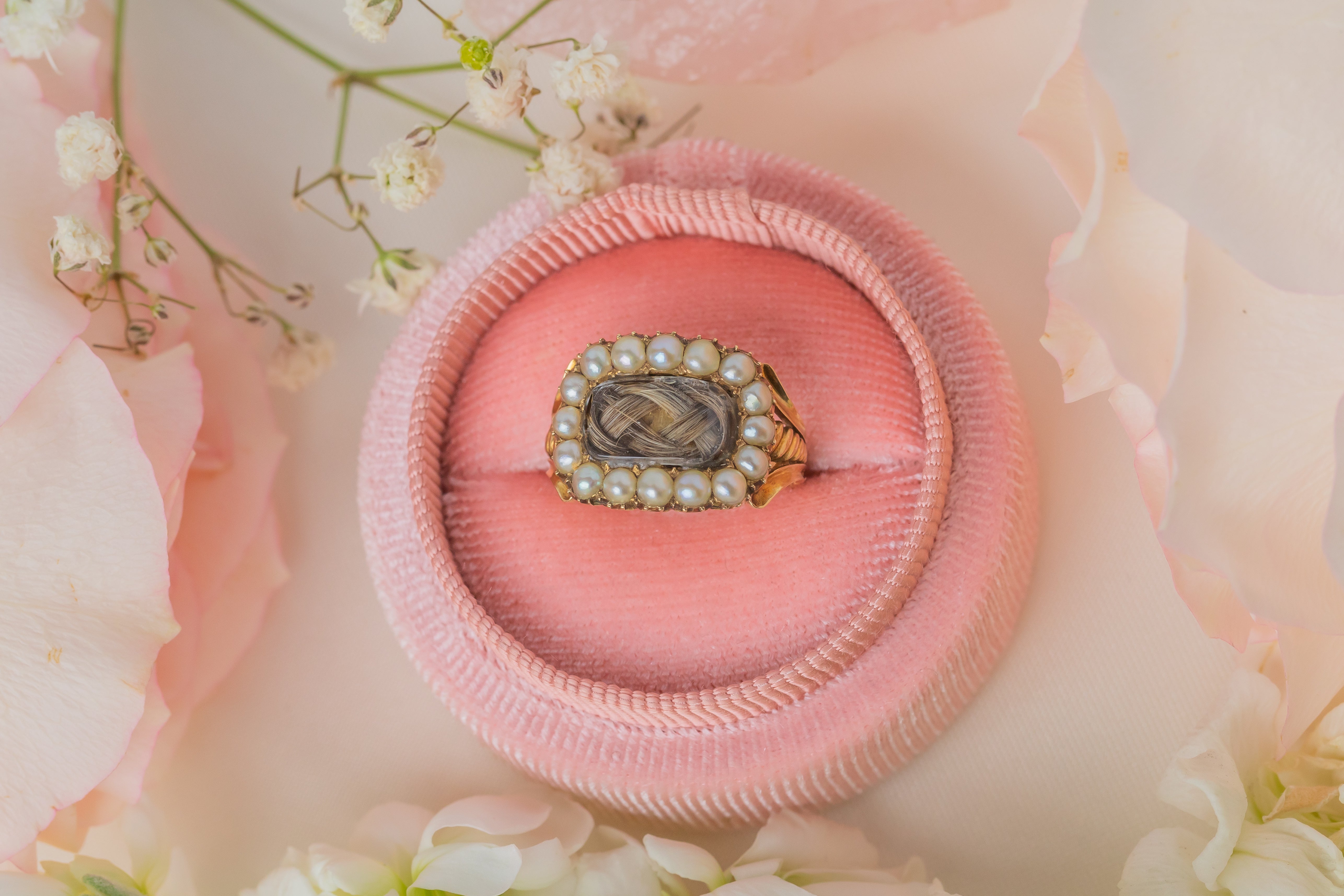 We not only love the story behind this ring, but how it epitomises Georgian sentimental jewellery, encapsulating the fine craftsmanship each piece of mourning jewellery entails. Held securely around your finger with saturated 15ct Gold, this antique ring flaunts ornate shoulder work akin to Greek pillars, she truly is a work of art!