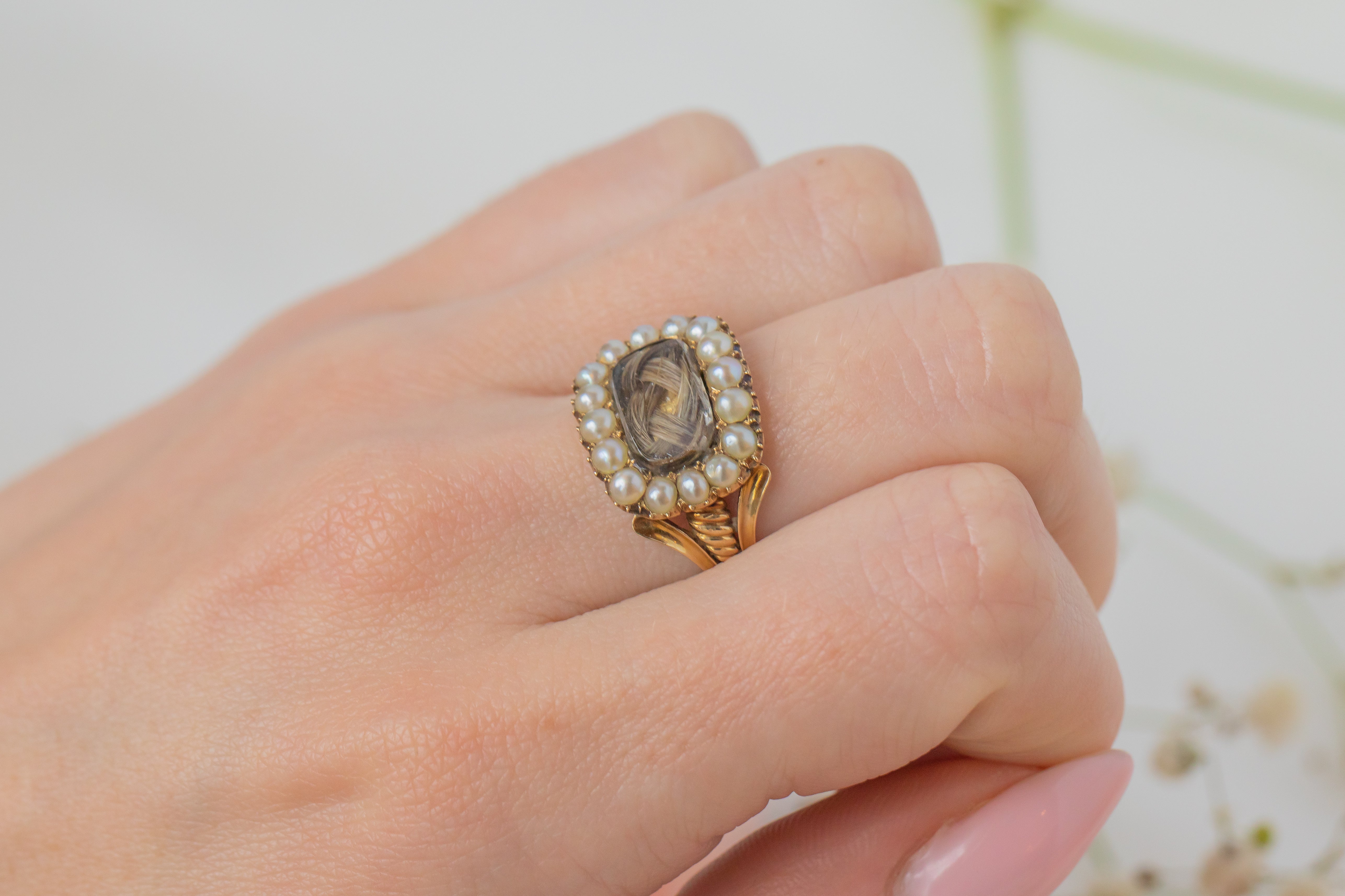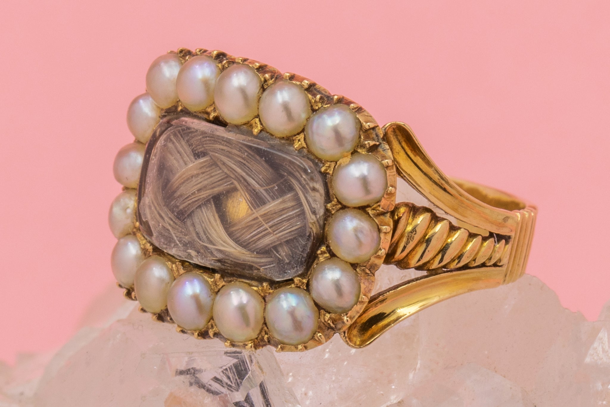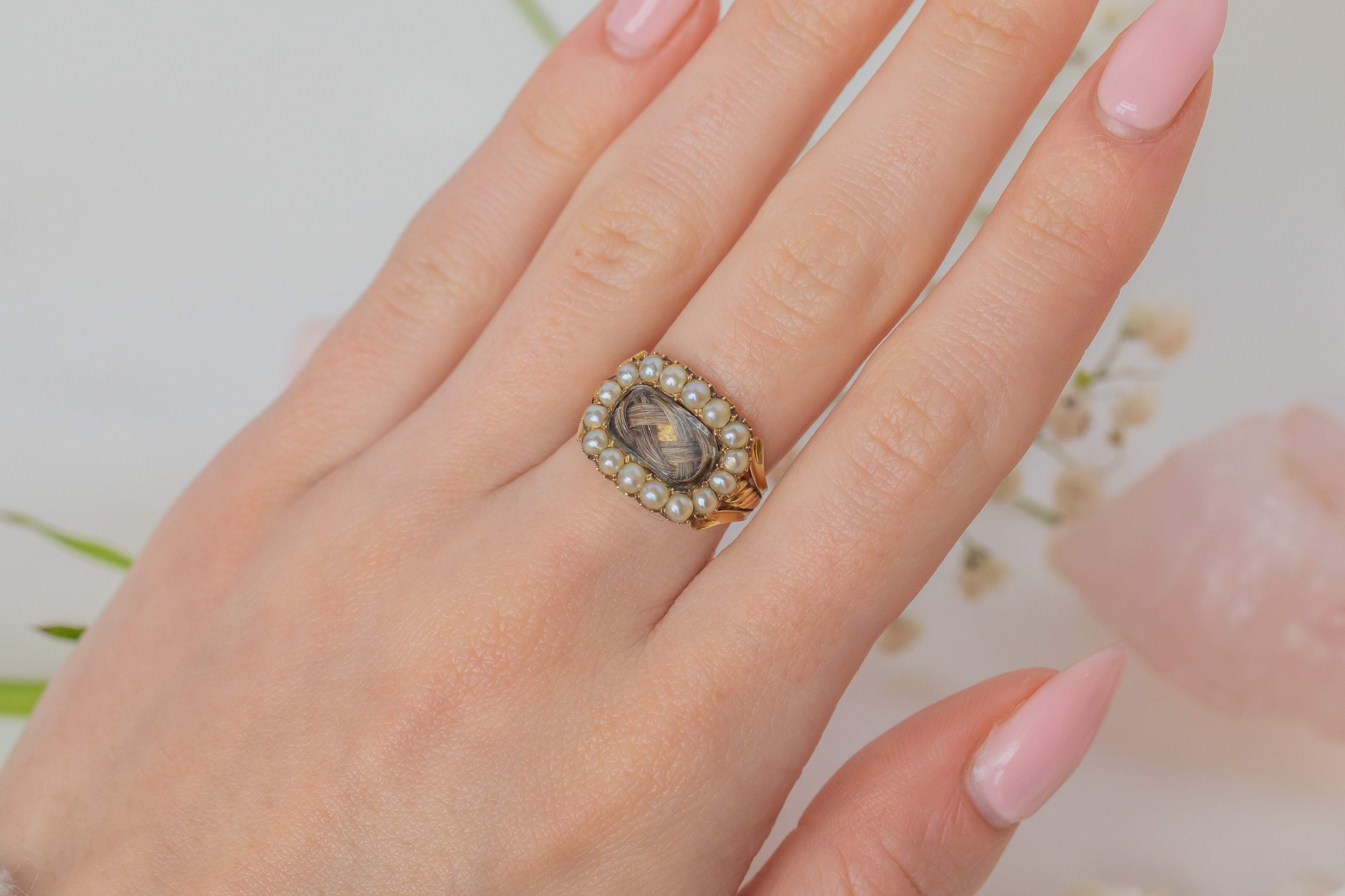 EXCELLENT: This rare Georgian 15ct Gold mourning ring is in pristine condition throughout! We surmise that all of the Gold, Pearls and hair are original to the piece, amazing considering its 200 year age! Although her ring band is not completely round, she still fits comfortable as she adorns your hand. The inscription on the reverse is clear and readable - a fabulous relic from the past.