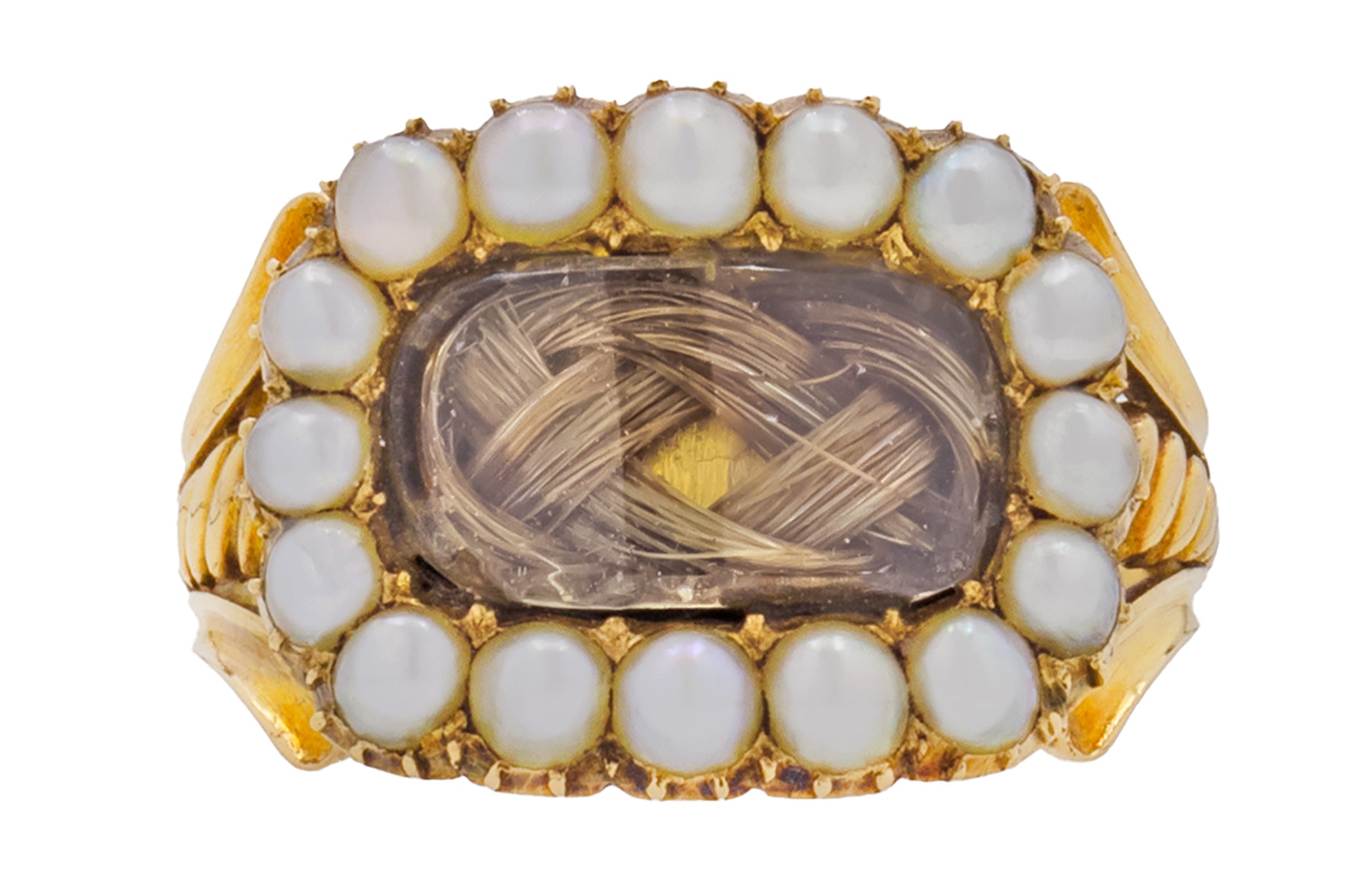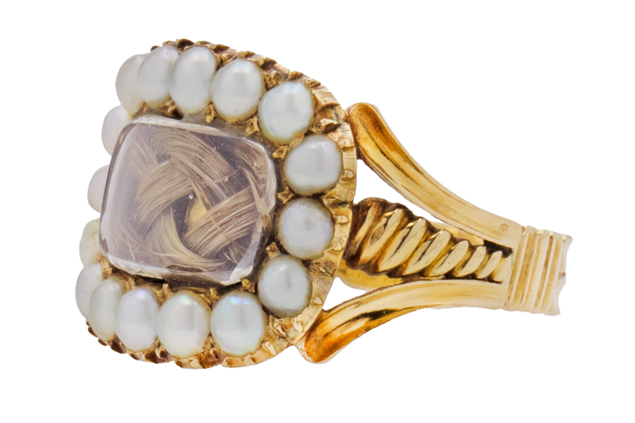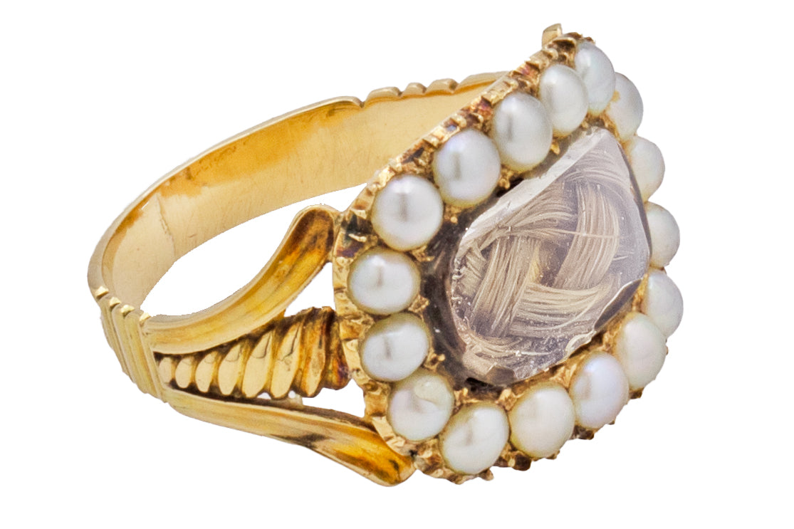 EXCELLENT: This rare Georgian 15ct Gold mourning ring is in pristine condition throughout! We surmise that all of the Gold, Pearls and hair are original to the piece, amazing considering its 200 year age! Although her ring band is not completely round, she still fits comfortable as she adorns your hand. The inscription on the reverse is clear and readable - a fabulous relic from the past.