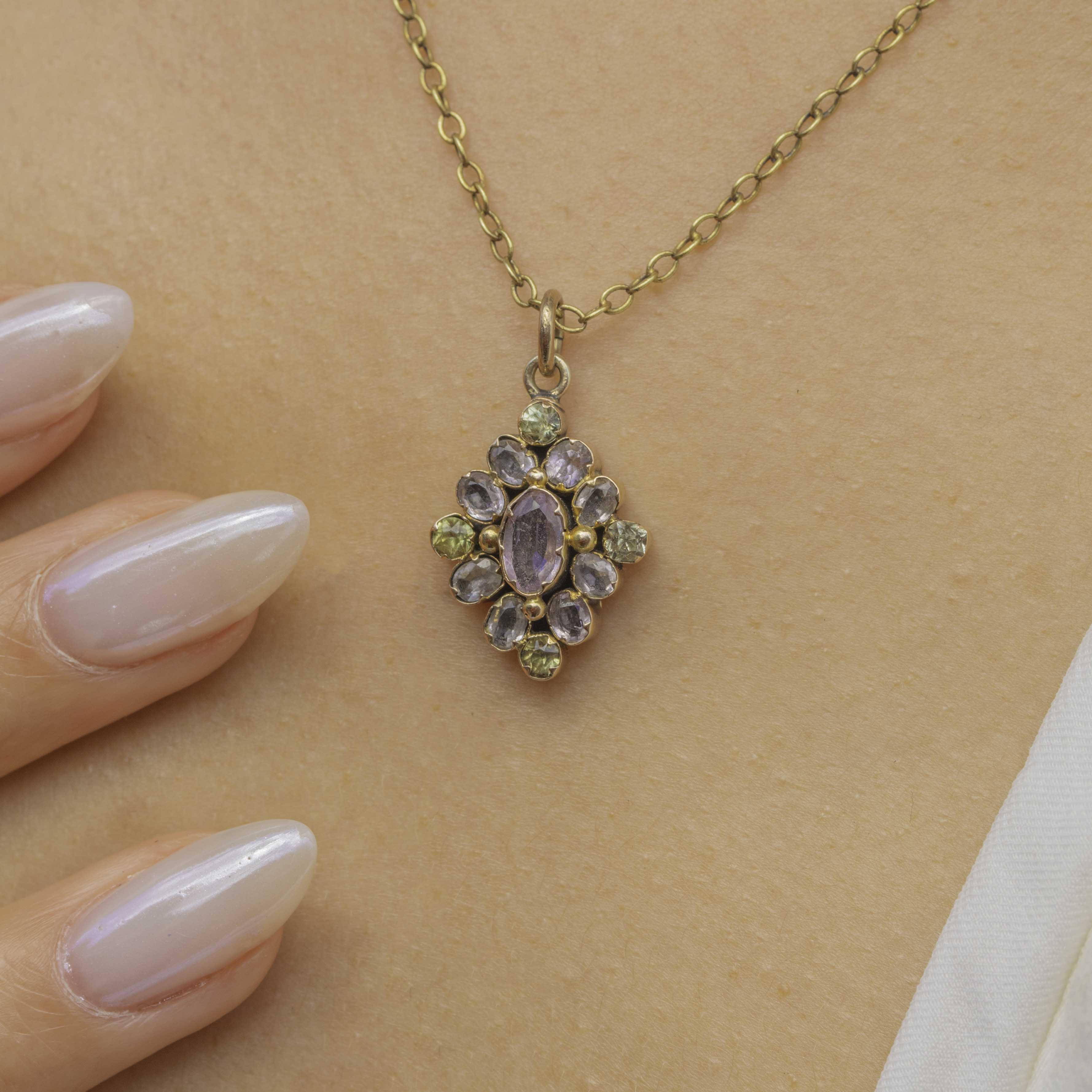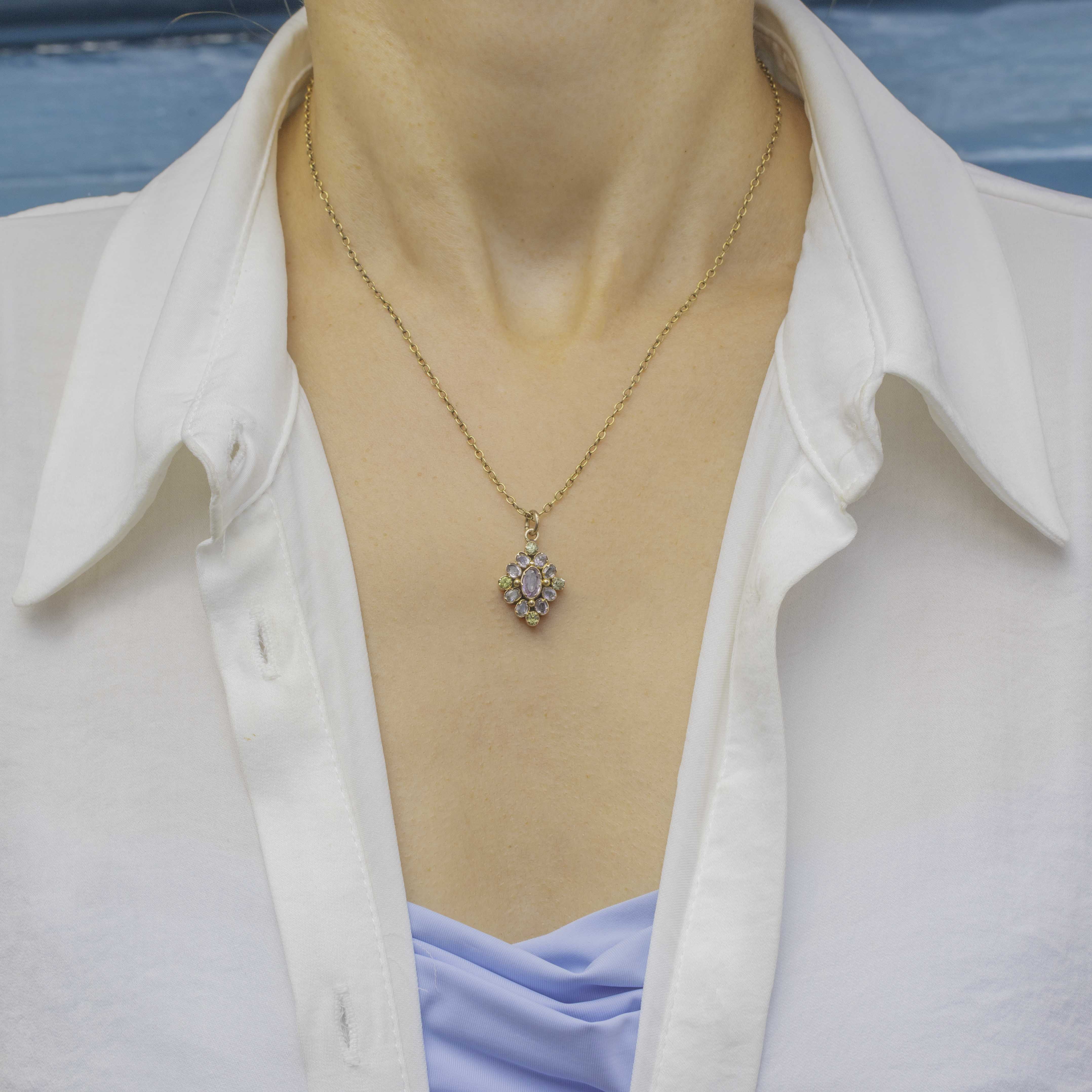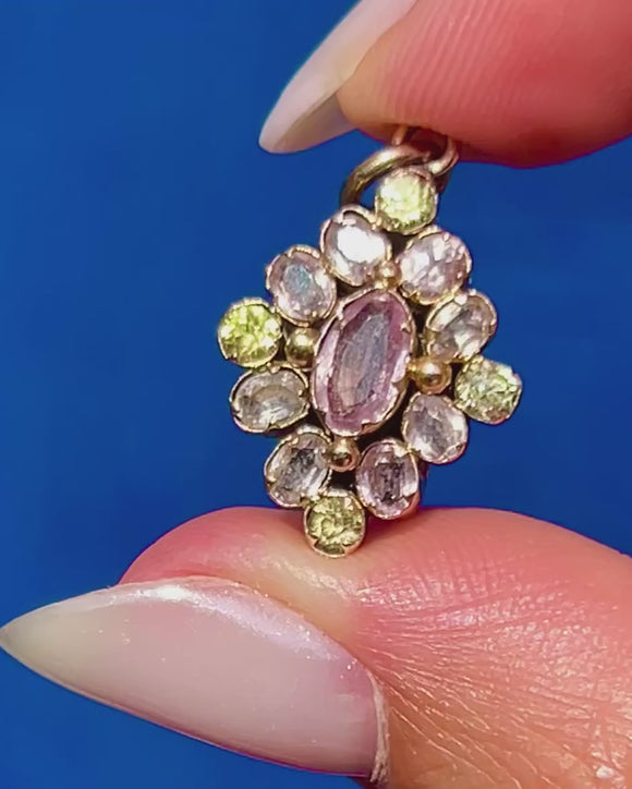 This Georgian charm features a myriad of soft Pink Topaz and pear green Chrysoprase, crafted into a gorgeous cluster formation which twinkles from all angles as it catches the light.