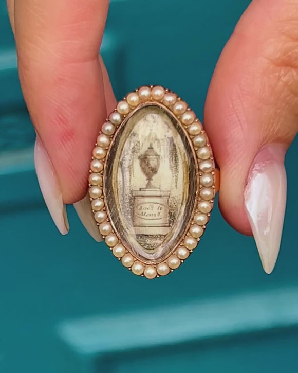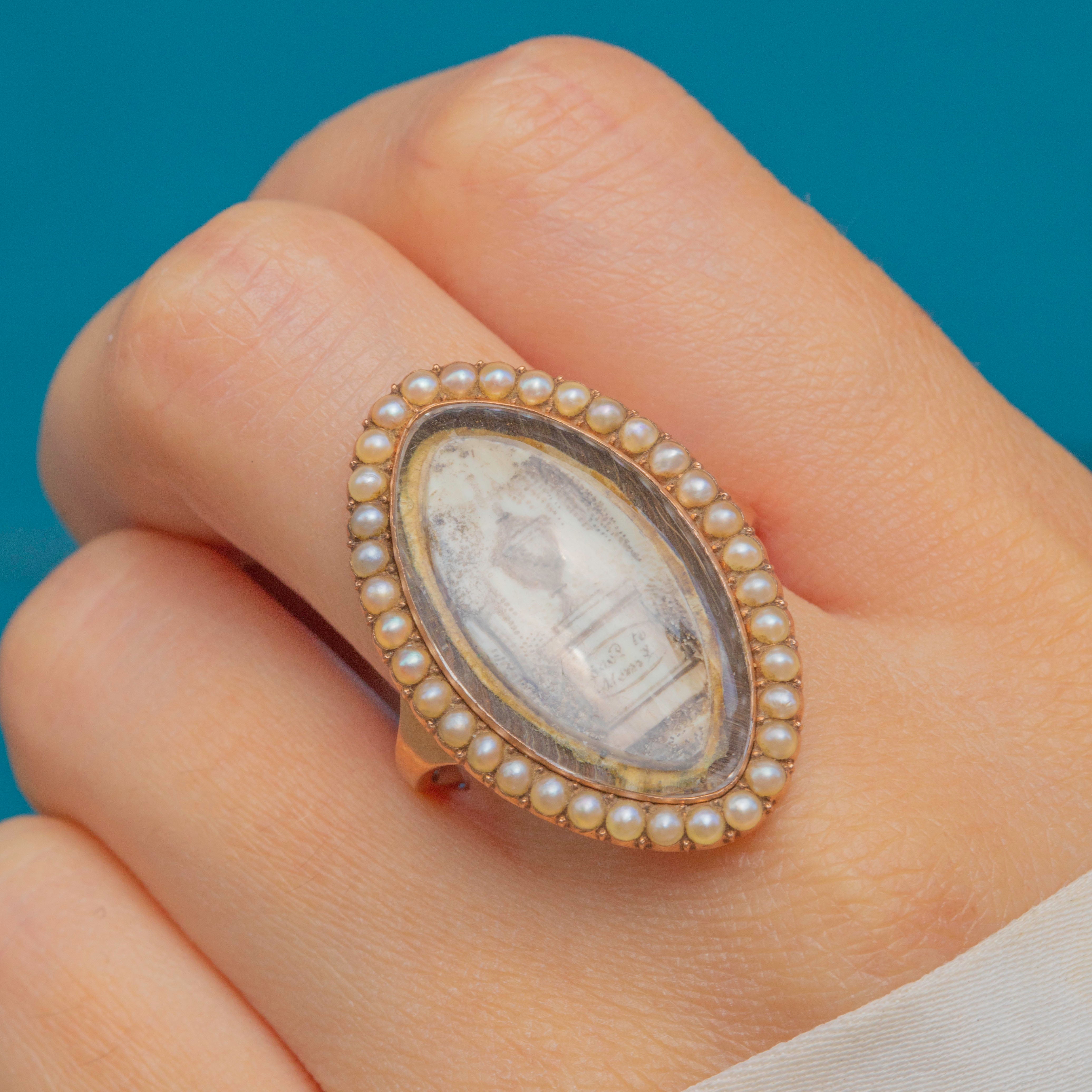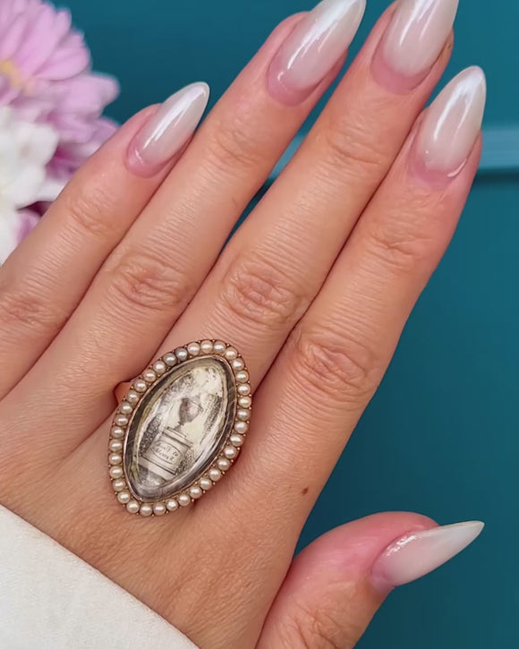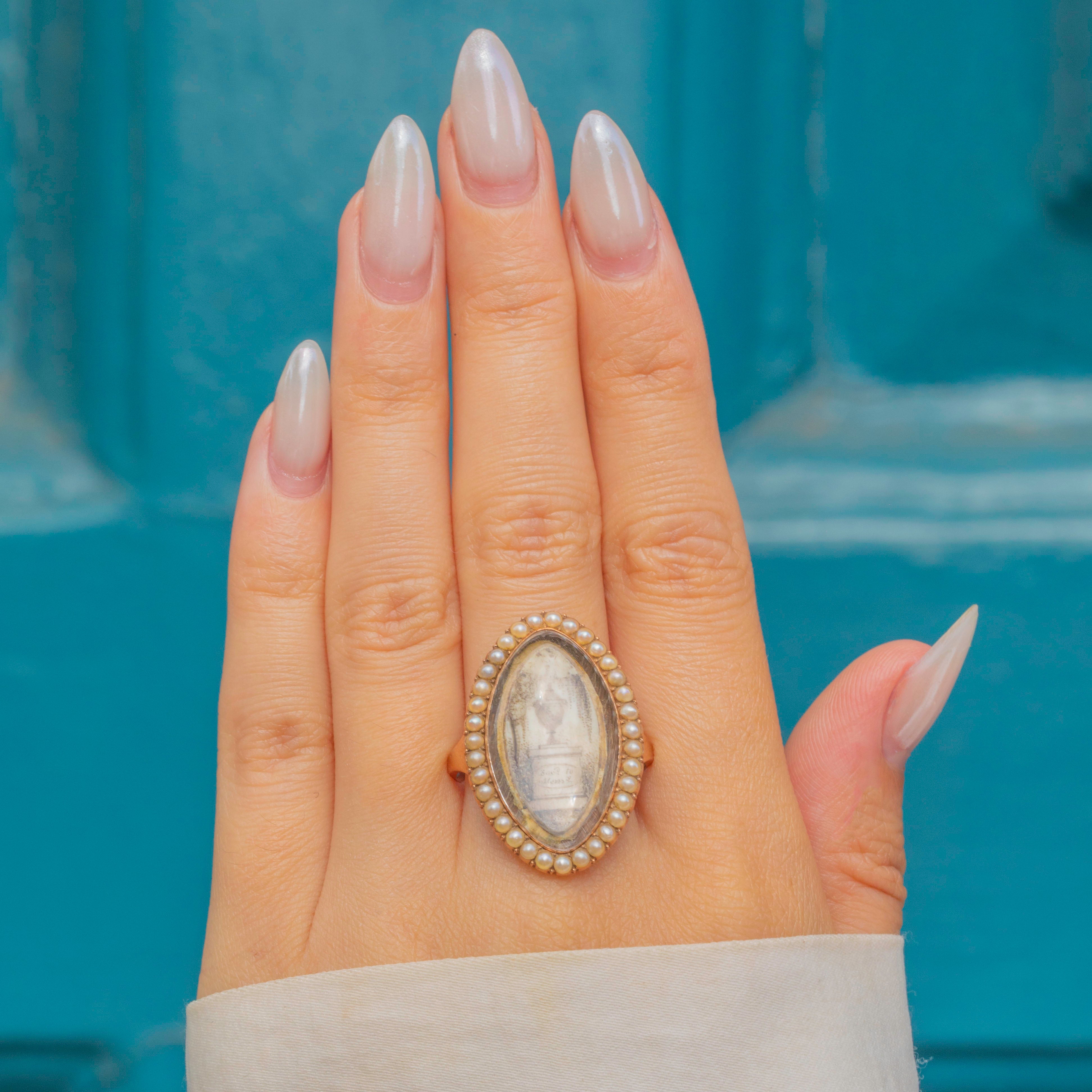 This 15ct Gold ring is an exquisite example of mourning jewellery from circa 1787. Greeting the eye is a sepia mourning scene, surrounded by a halo of natural split Pearls, symbolising tears and sorrow.