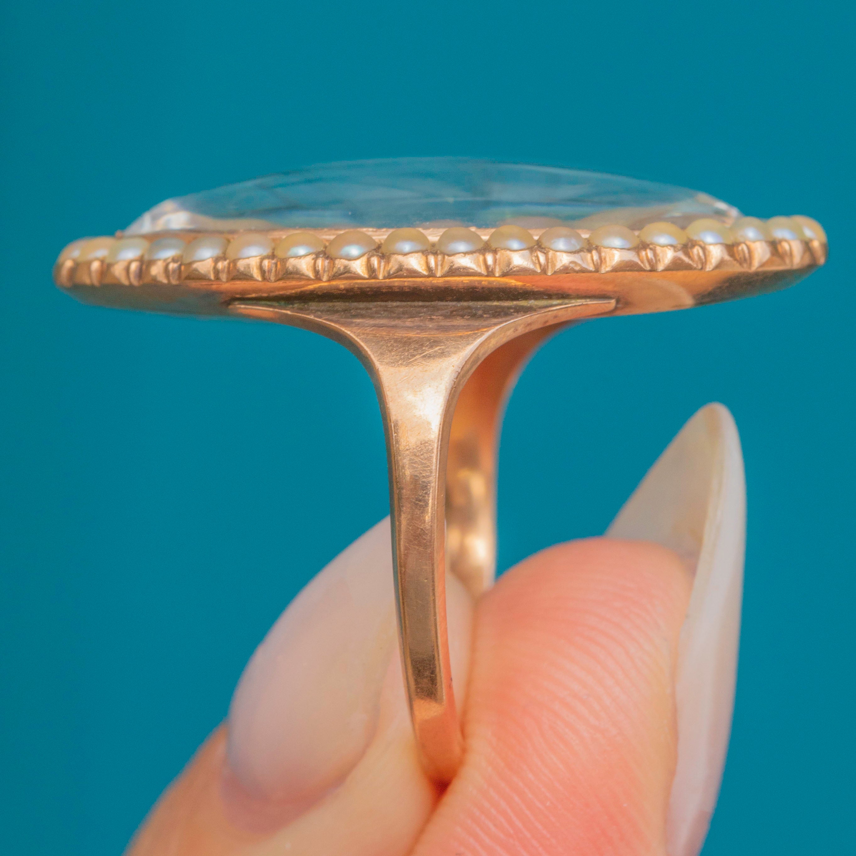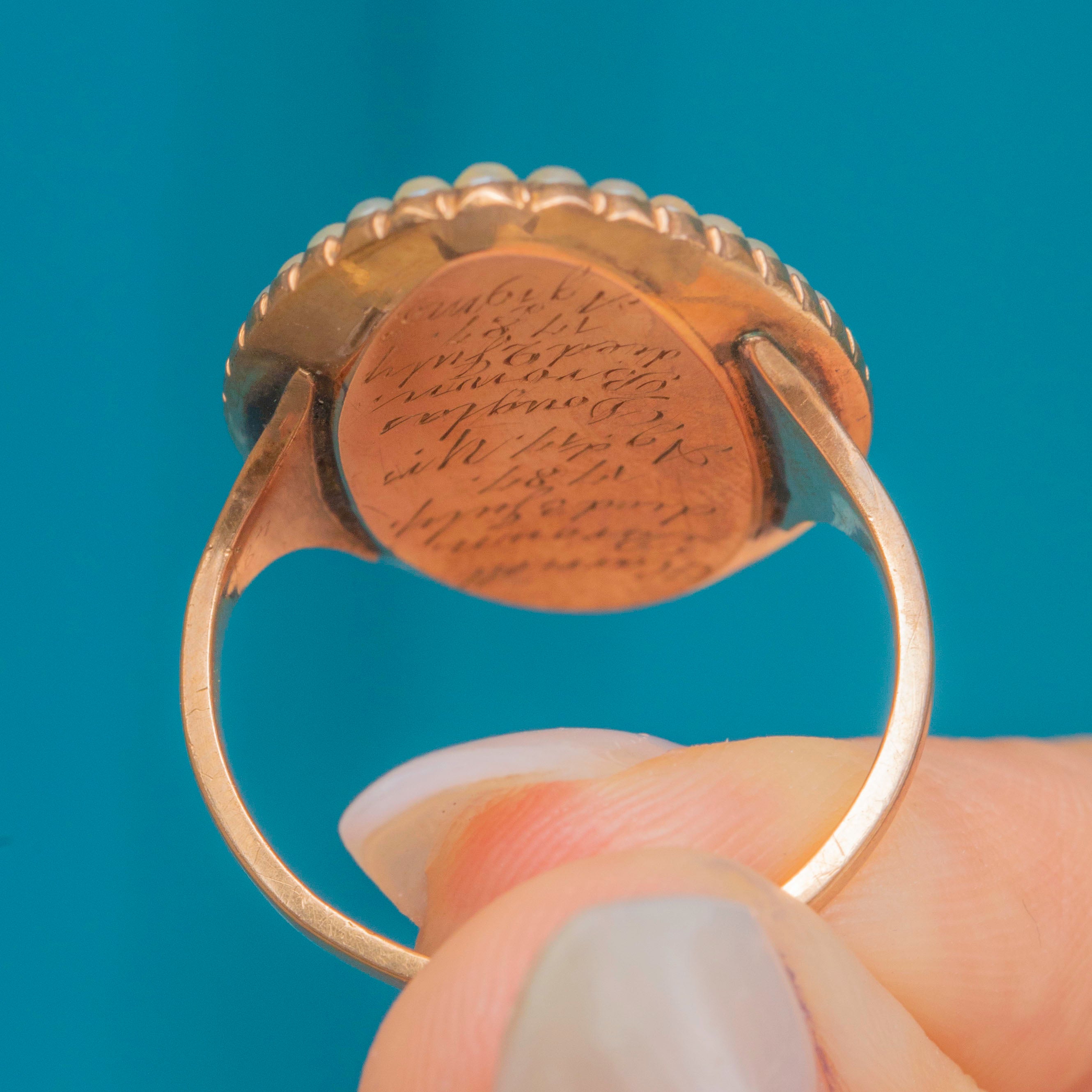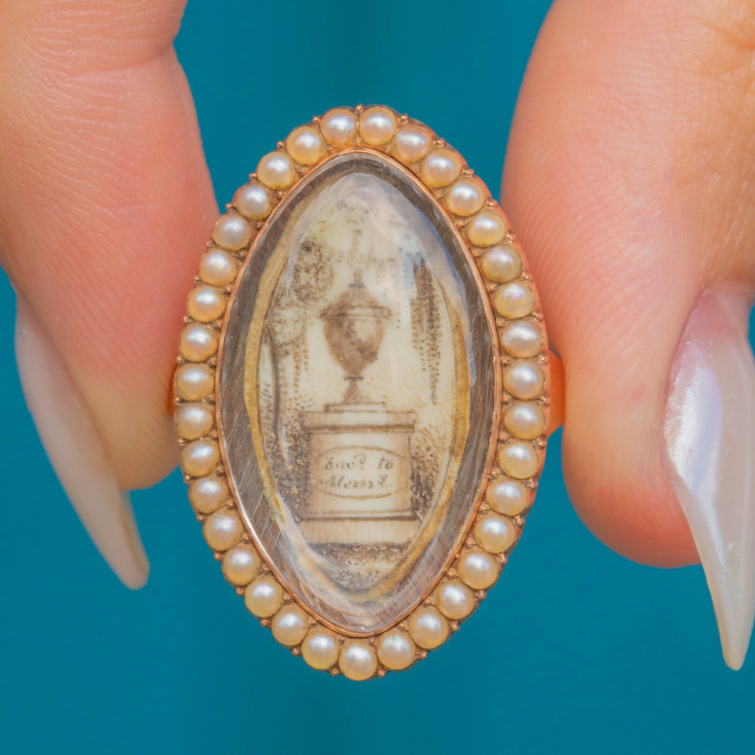 This 15ct Gold ring is an exquisite example of mourning jewellery from circa 1787. Greeting the eye is a sepia mourning scene, surrounded by a halo of natural split Pearls, symbolising tears and sorrow.