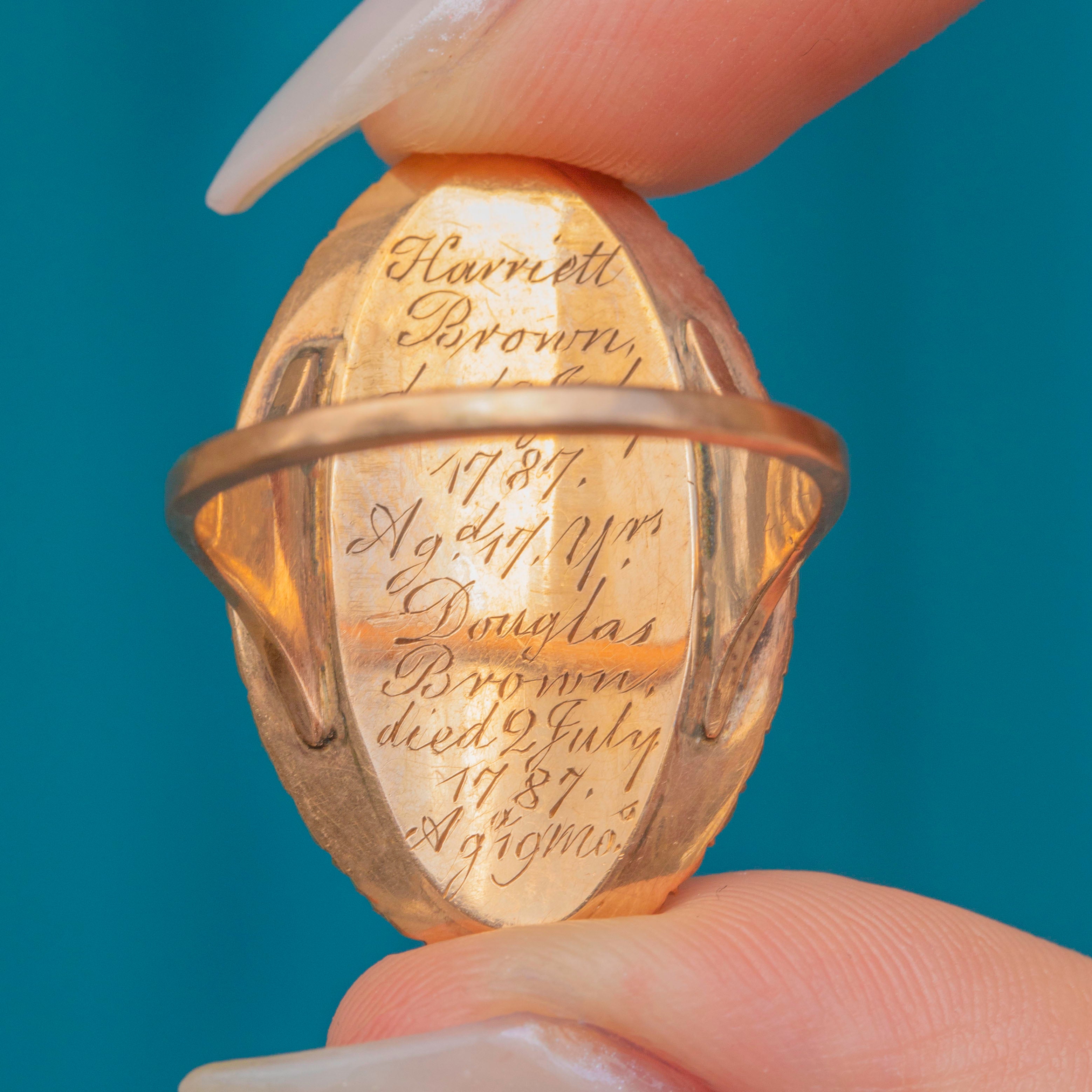 The Mourning plinth reads 'Sacred to memory', and the reverse of the ring is inscribed 'Harriet Brown died 3rd July 1787 Agd 17 yrs. Douglas Brown died 2nd July 1787 Agd 19 Mos', a heartbreaking homage to two family members who died so close together.