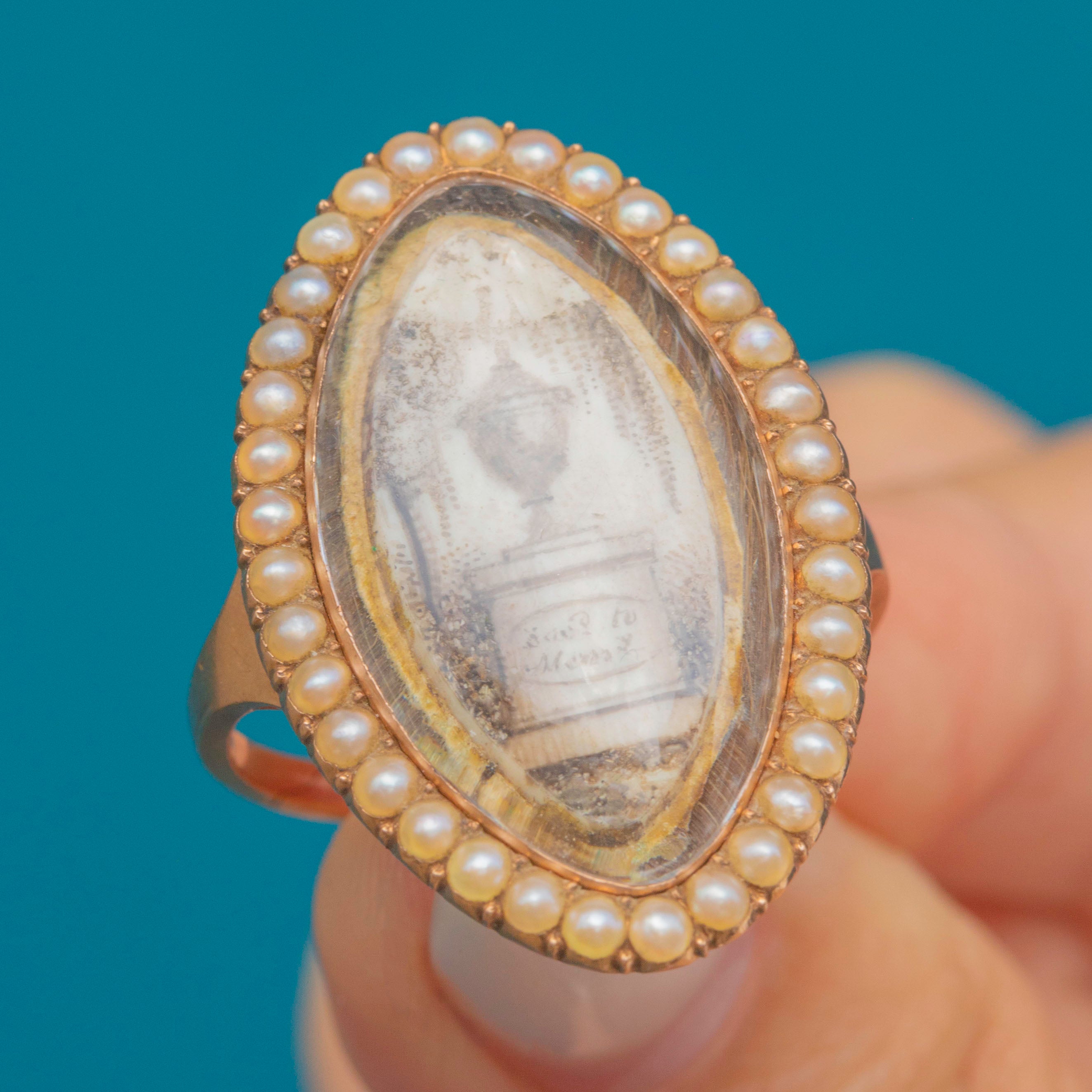 Georgian 15ct Gold Sepia Pearl Mourning Ring with Urn, c.1787
