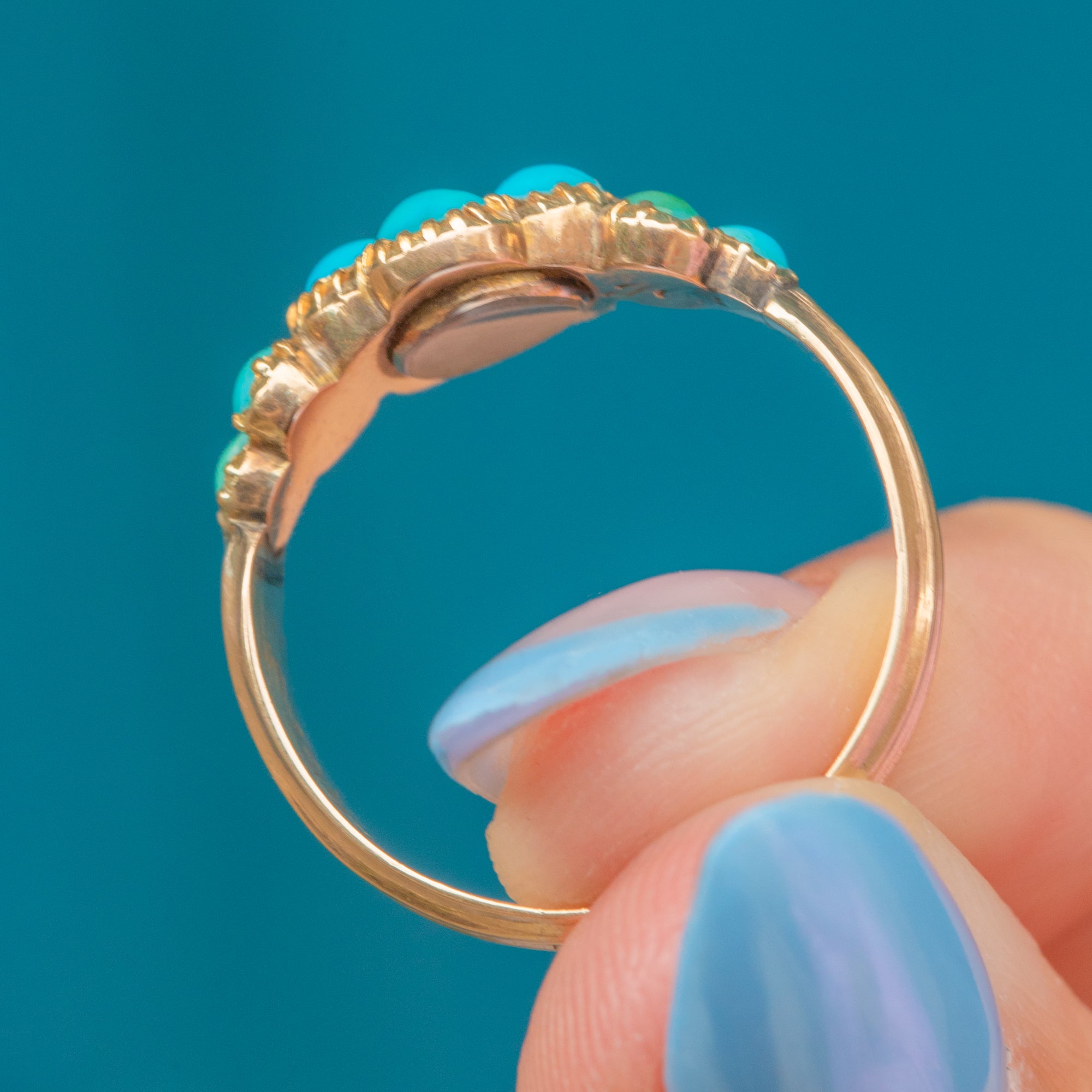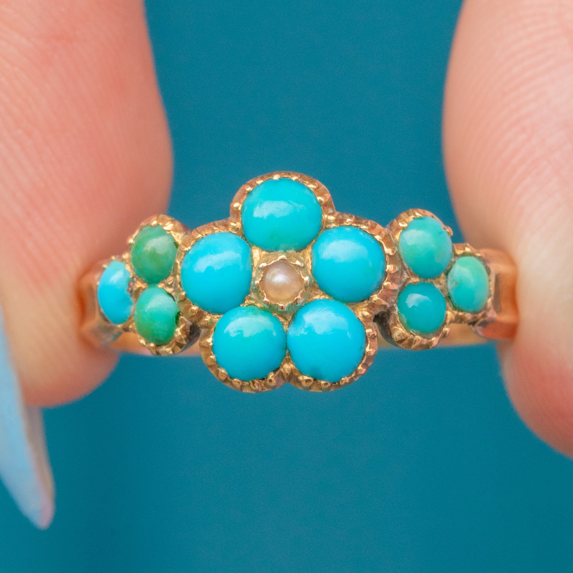 Each Turquoise stone has its own distinct blue-green hue, and is complemented beautifully by the warmth of its 15ct Gold settings. Centred by an iridescent Pearl and complete with a dated inscription inside the band, this Georgian ring simply radiates antique charm.