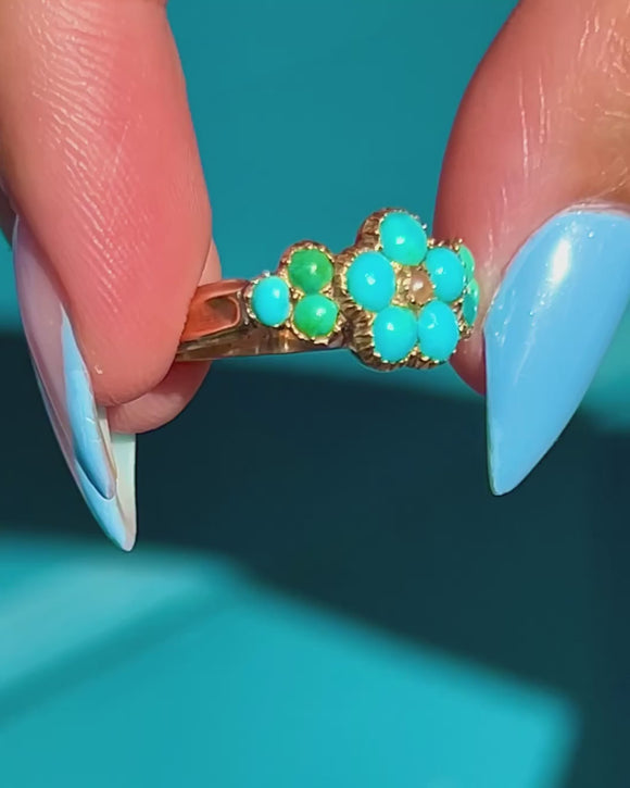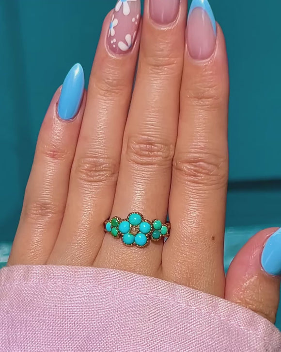 This antique cluster ring is crafted into an adorable forget-me-not cluster formation, with each Turquoise displayed within classically Georgian piecrust settings!