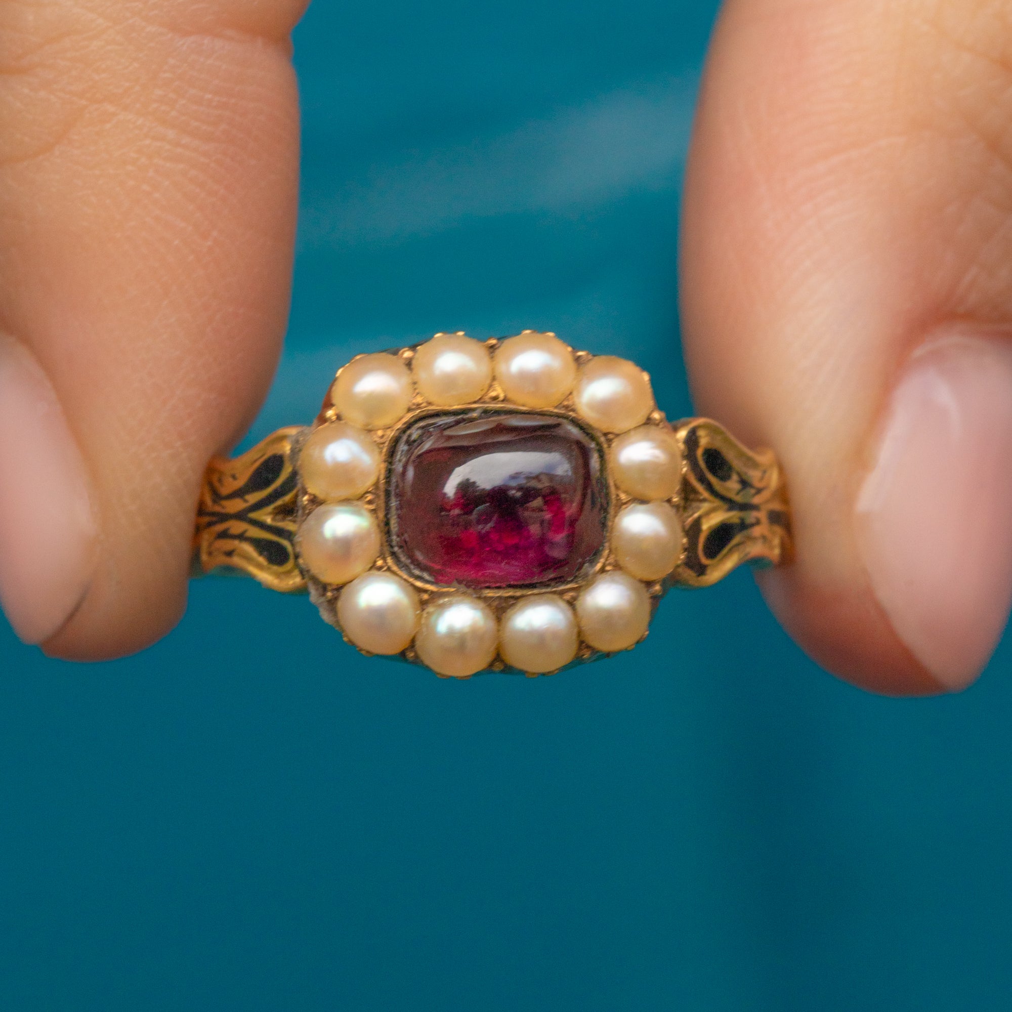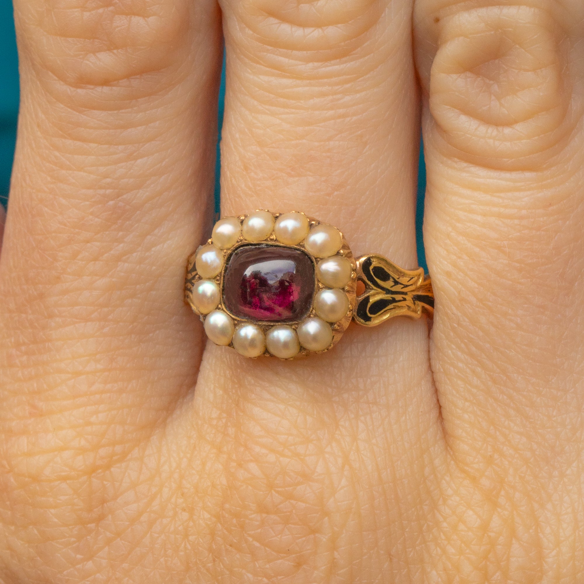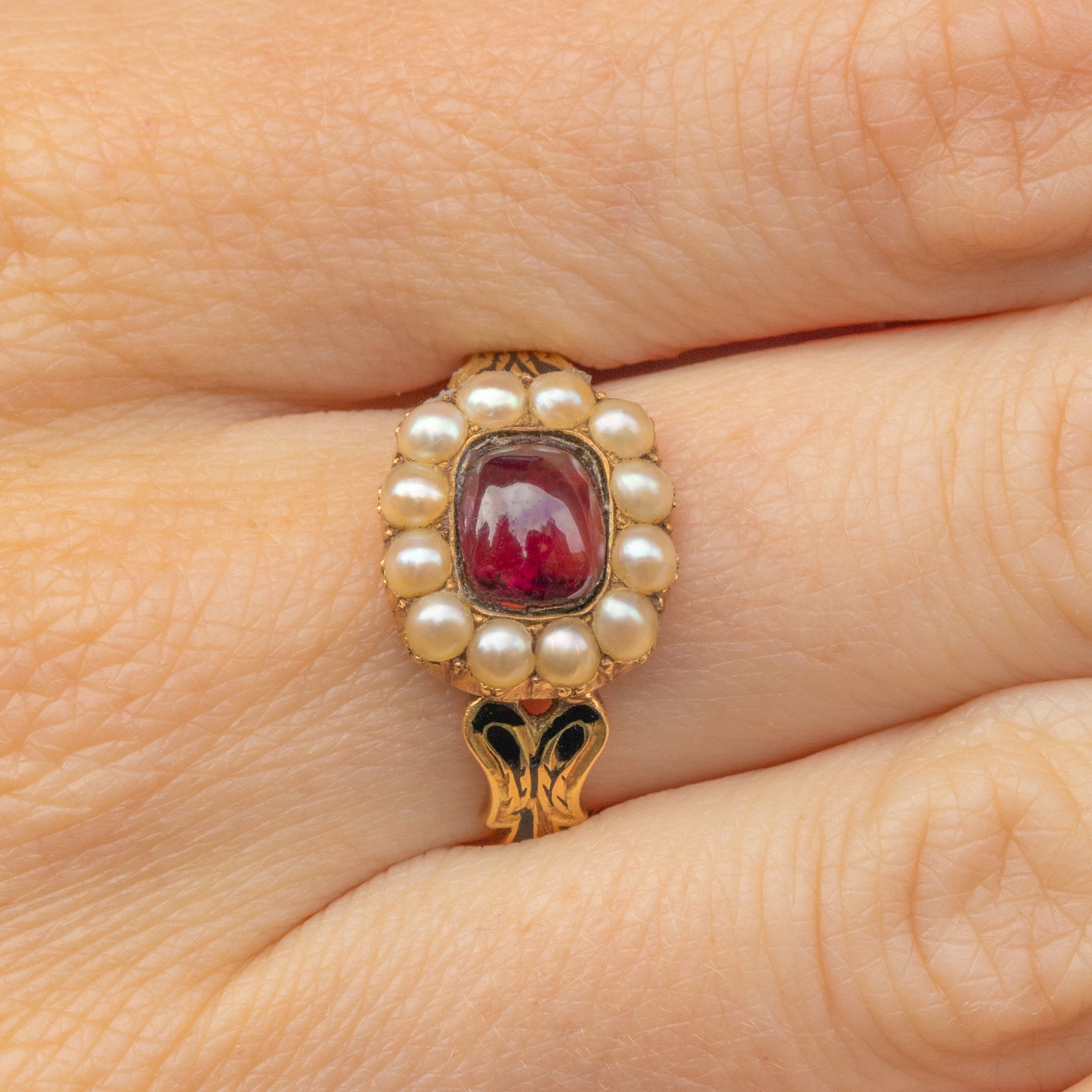 Georgian 18ct Garnet Cabochon Pearl Ring, Black Enamel Shoulders