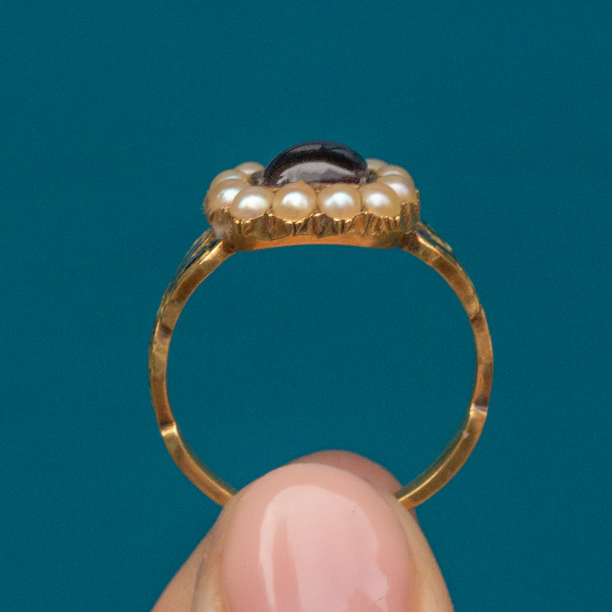 VERY GOOD. This Georgian 18ct Gold sugarloaf Garnet Pearl ring is in very good condition. The Garnet is secure within its setting, smooth to the touch, and free from any damage to note. Each Pearl is present and secure, providing a striking contrast against the deep hue of the Garnet. Although some of the black Enamel has worn along the shoulders, it still brings a lovely charismatic charm to the ring. The ring band is robust, with no visible resize marks and a smooth feel. Given her age, this piece is quite remarkable!