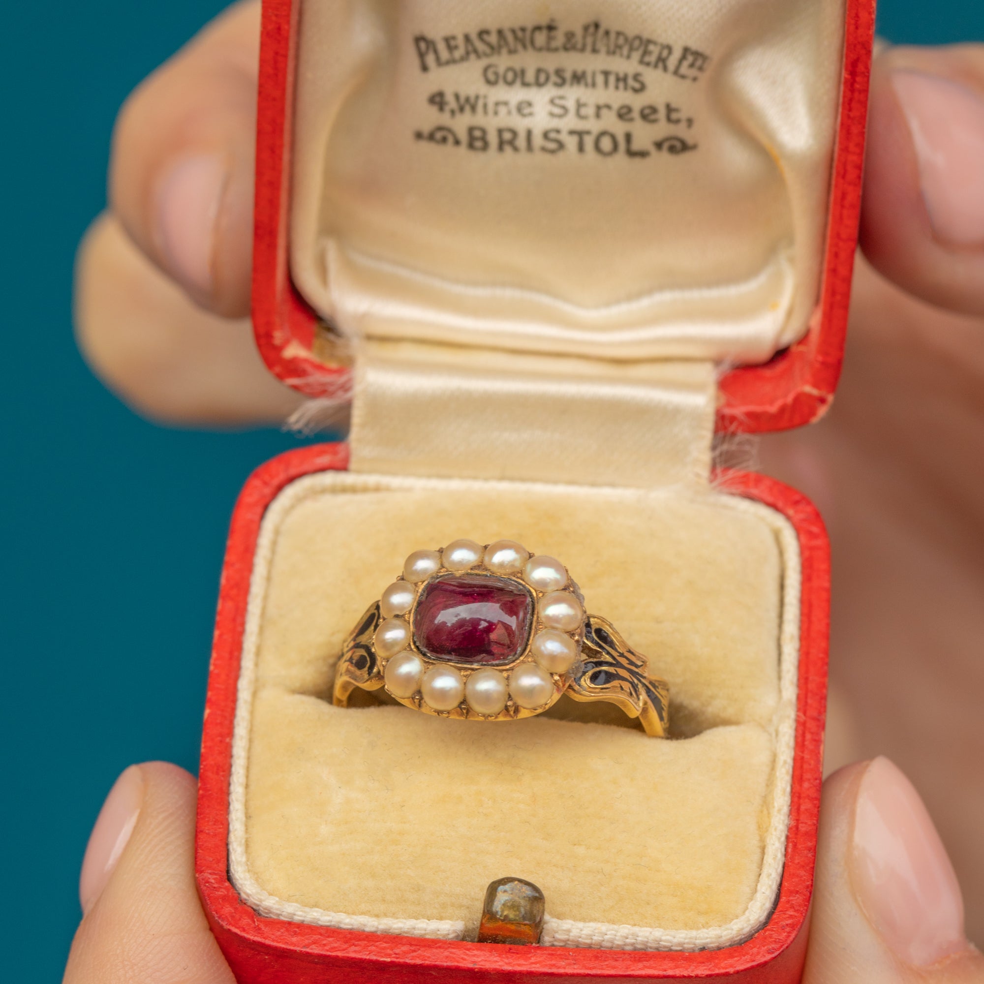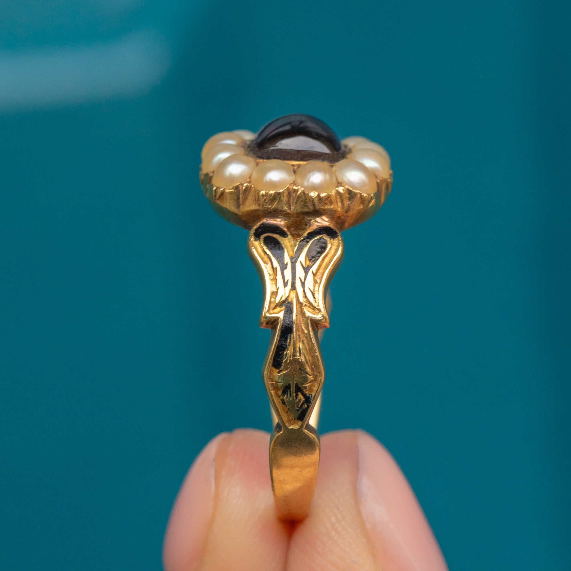 Her smooth Garnet cabochon is a beautiful deep wine-red hue, adorned by a halo of bright and luminous Pearls. Running along her shoulders is deep black Enamelling adding to her gothic allure, infilling the shape of her buttery 18ct Gold shank. It's safe to say that no one else will have a piece quite like this in their collection.
