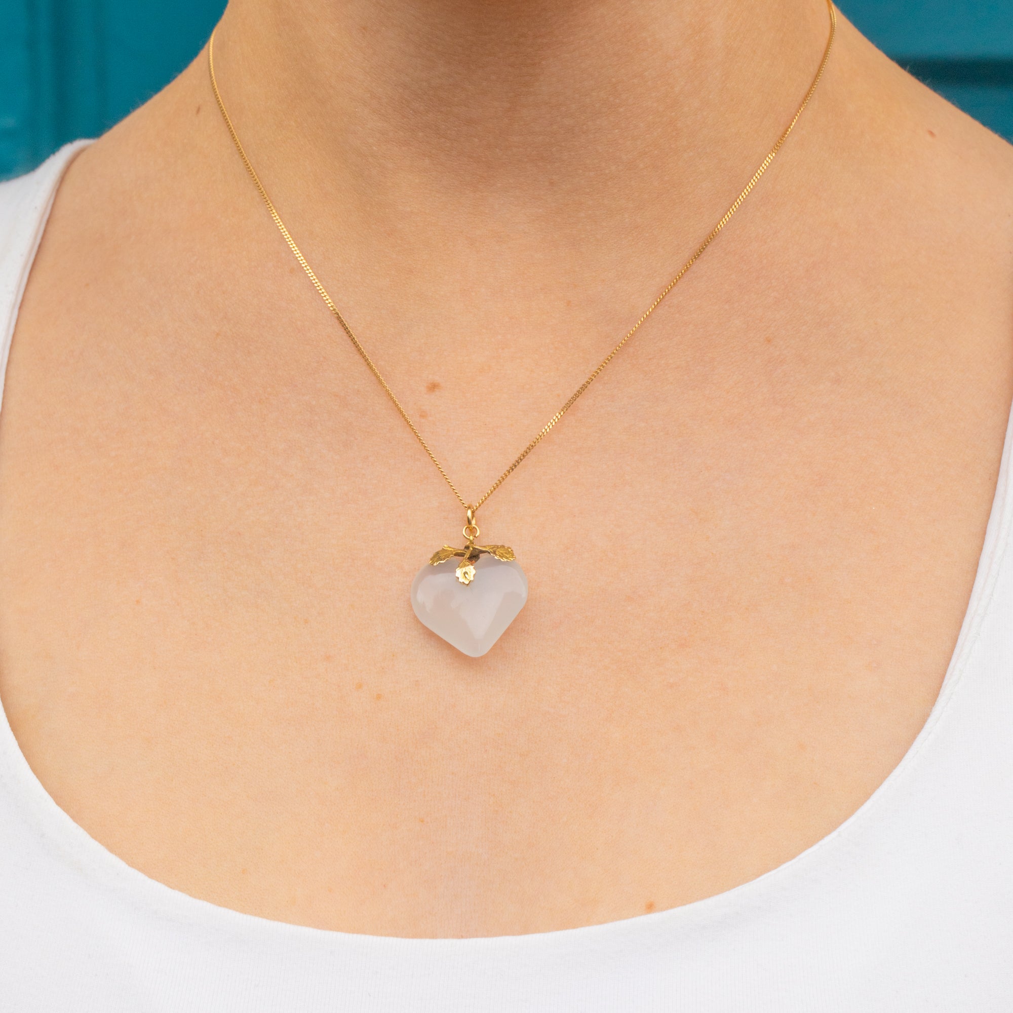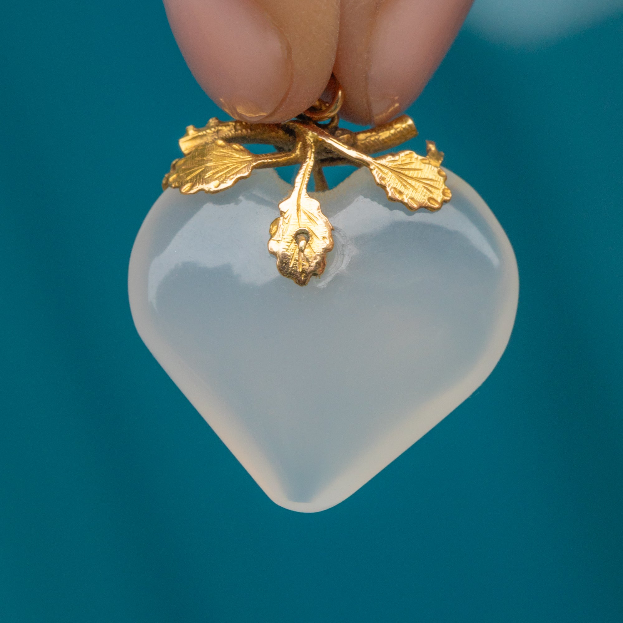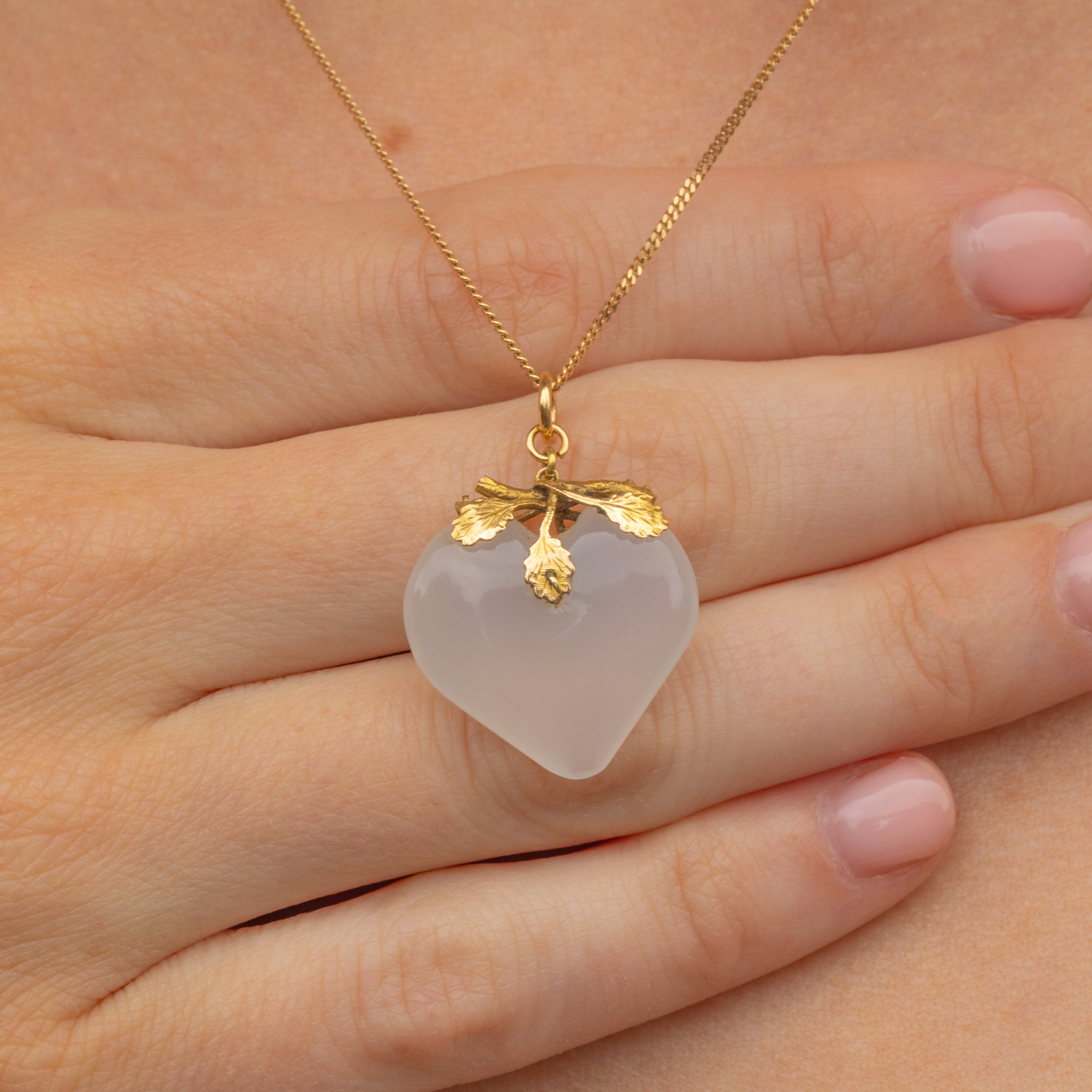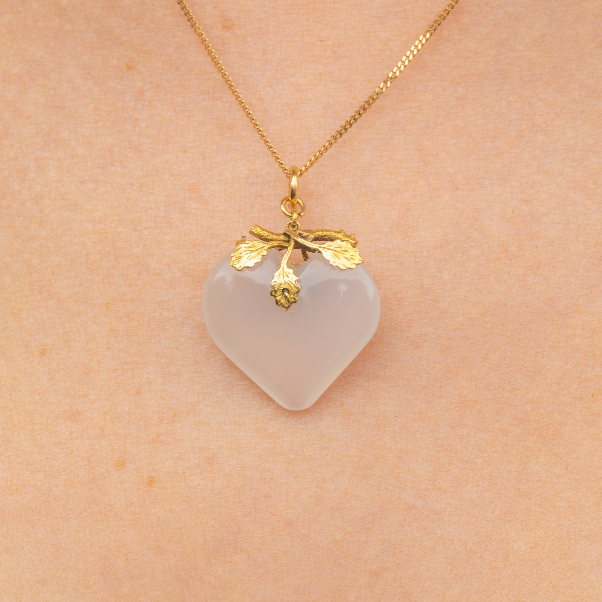 The hand-cut Chalcedony heart suspends delicately, its milky hue perfectly complemented by the brightly saturated 18ct Gold creating a whimsical piece. Whether you're looking for a treat for yourself or a gift for a loved one, this antique heart pendant will delight for years to come!
