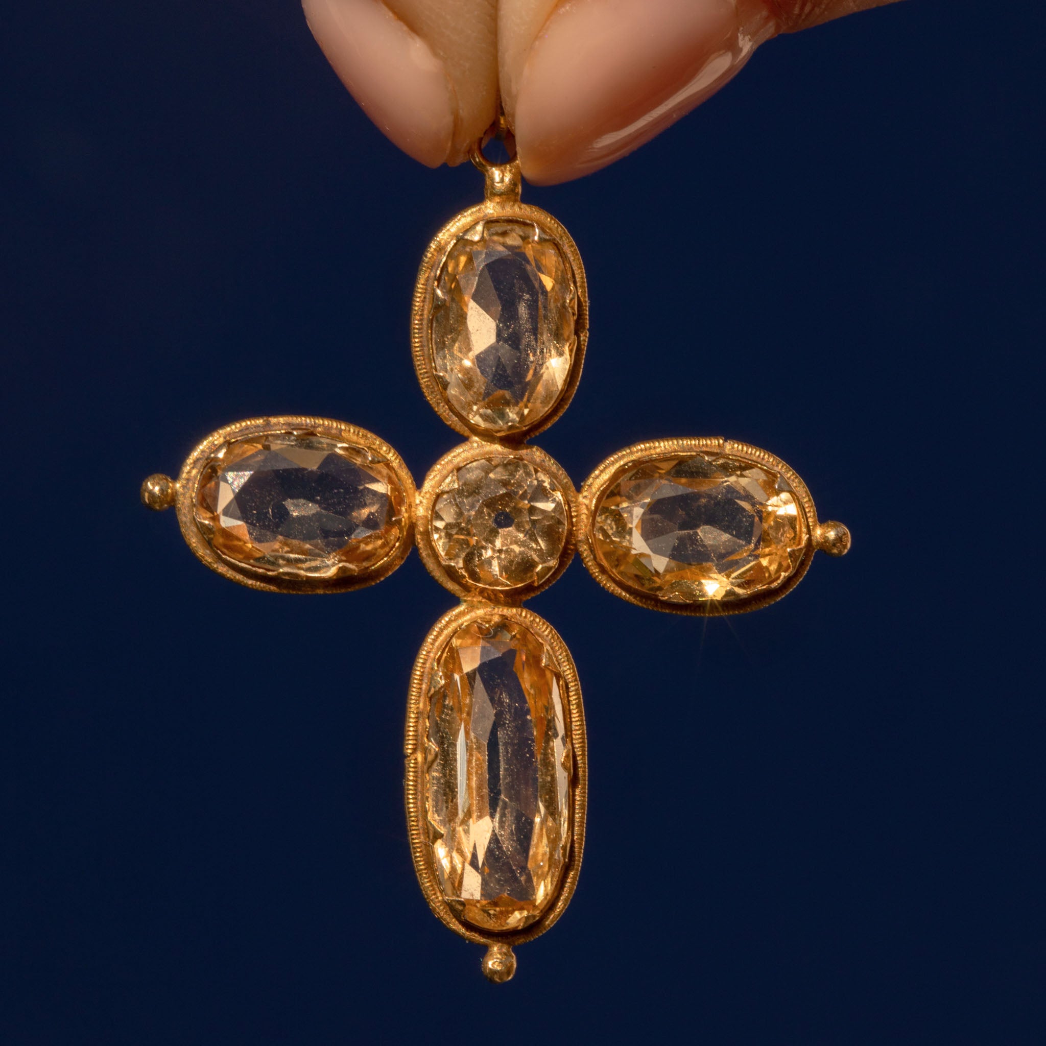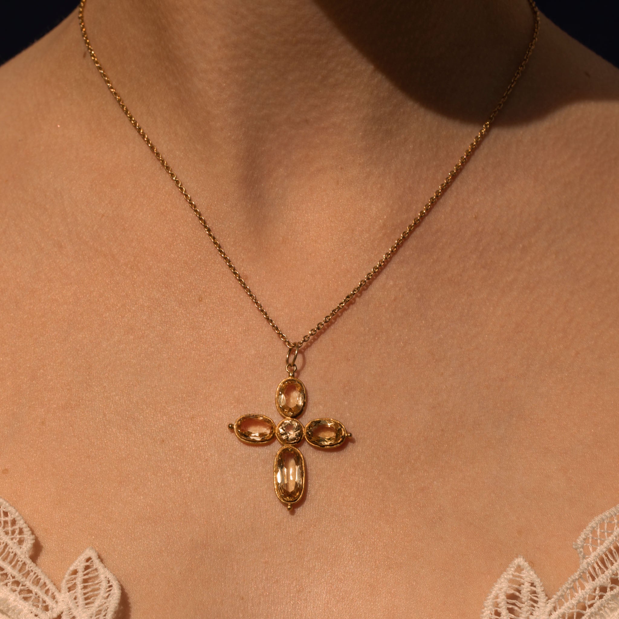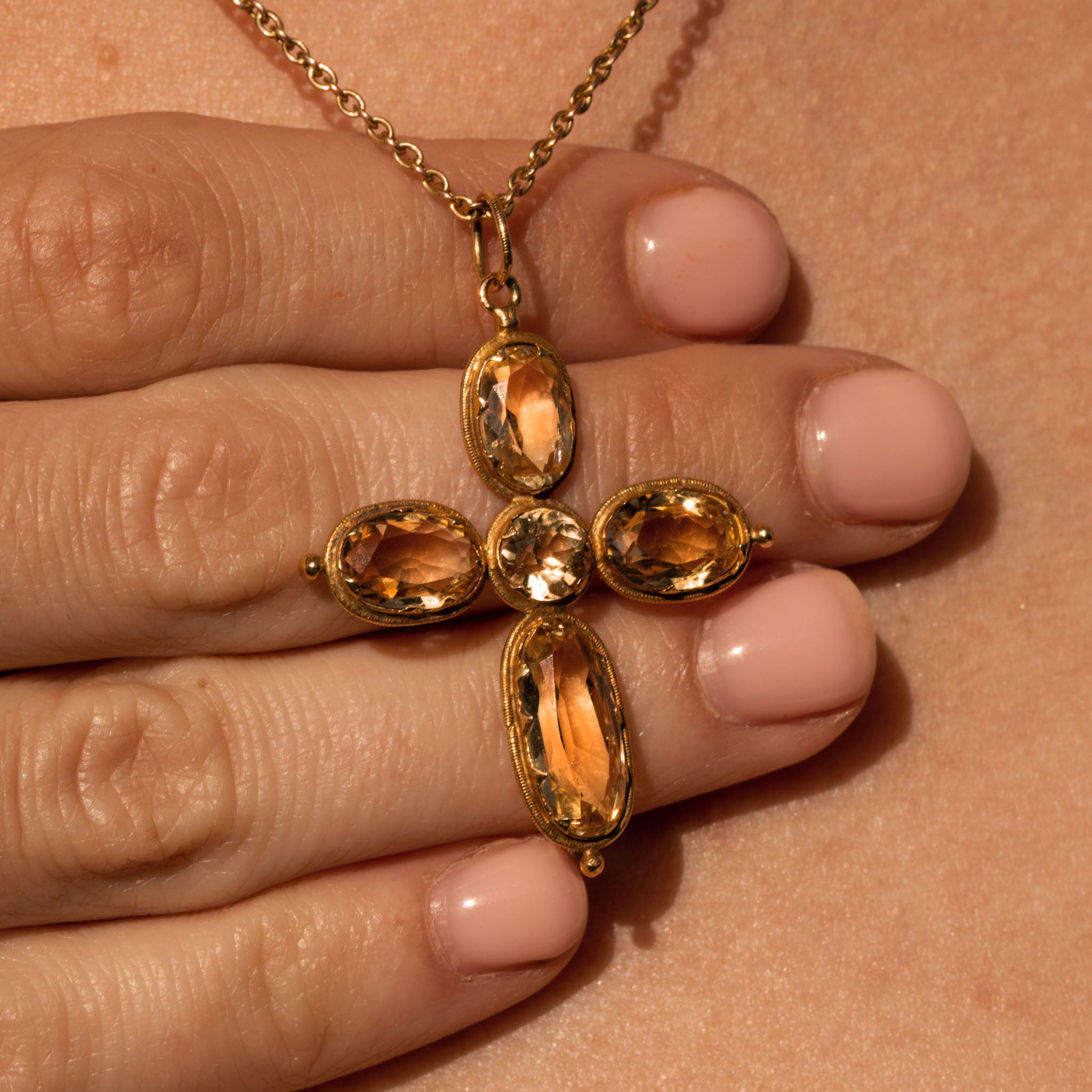 A radiant Georgian 18ct Gold Citrine cross pendant! Five Citrines from the cross, flaunting heartwarming honey hues that thrive beneath the light, sure to bring warmth to any neck stack.