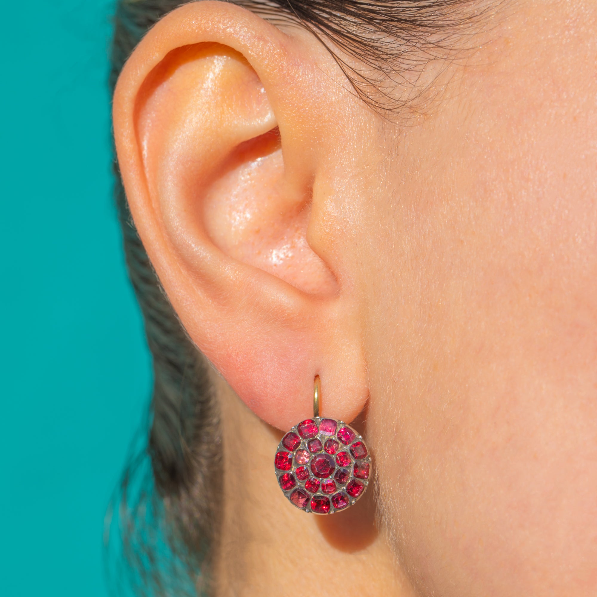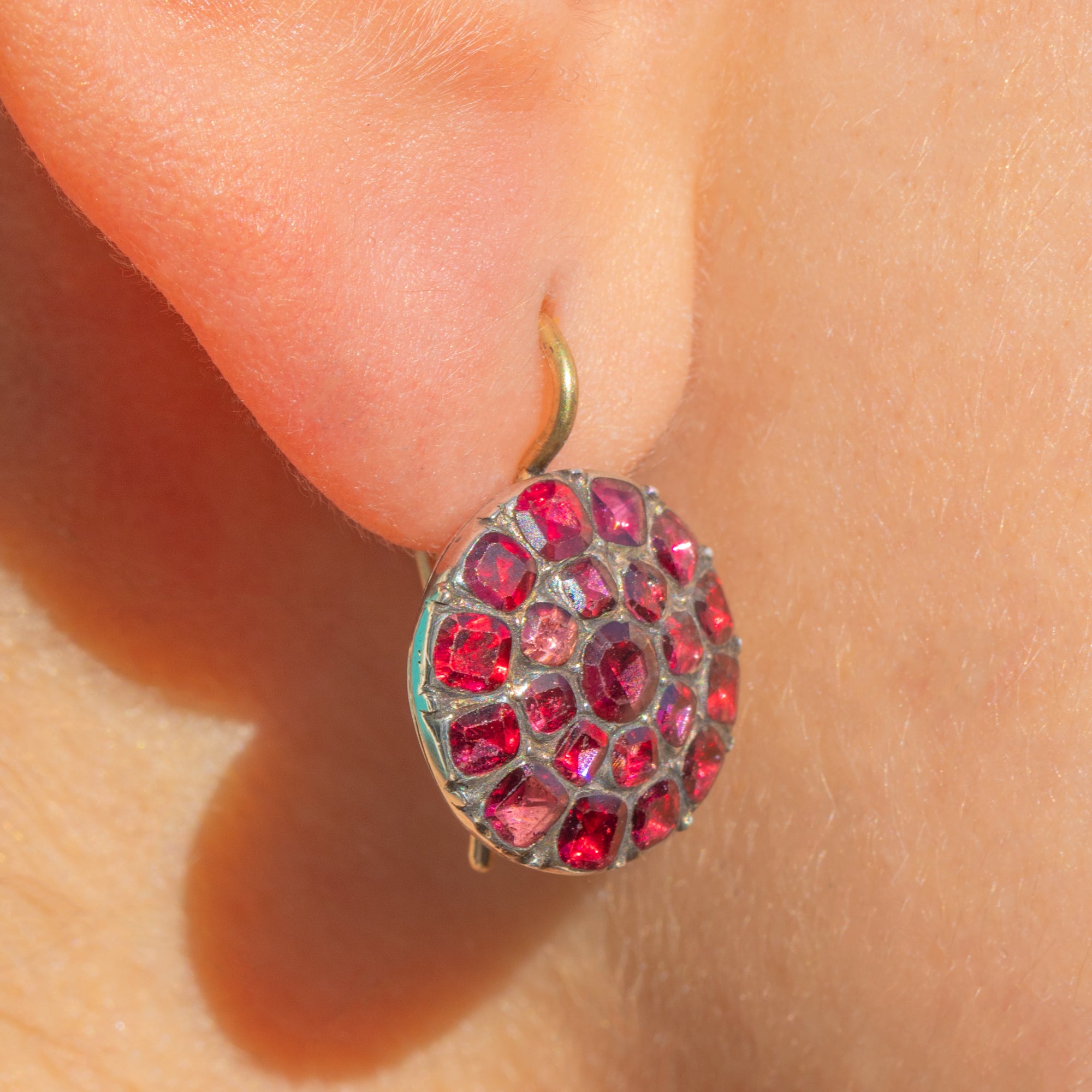 A delectable pair of Georgian flat cut Garnet cluster earrings, c.1800, glowing with rich claret-red allure. Each petite rosette is set in Silver, the flat cut Garnets arranged in a domed cluster for a sumptuous bloom of colour with every turn. The contrast of deep red stones against cool Silver is timeless, while the 18ct Gold hooks add a refined touch of warmth.