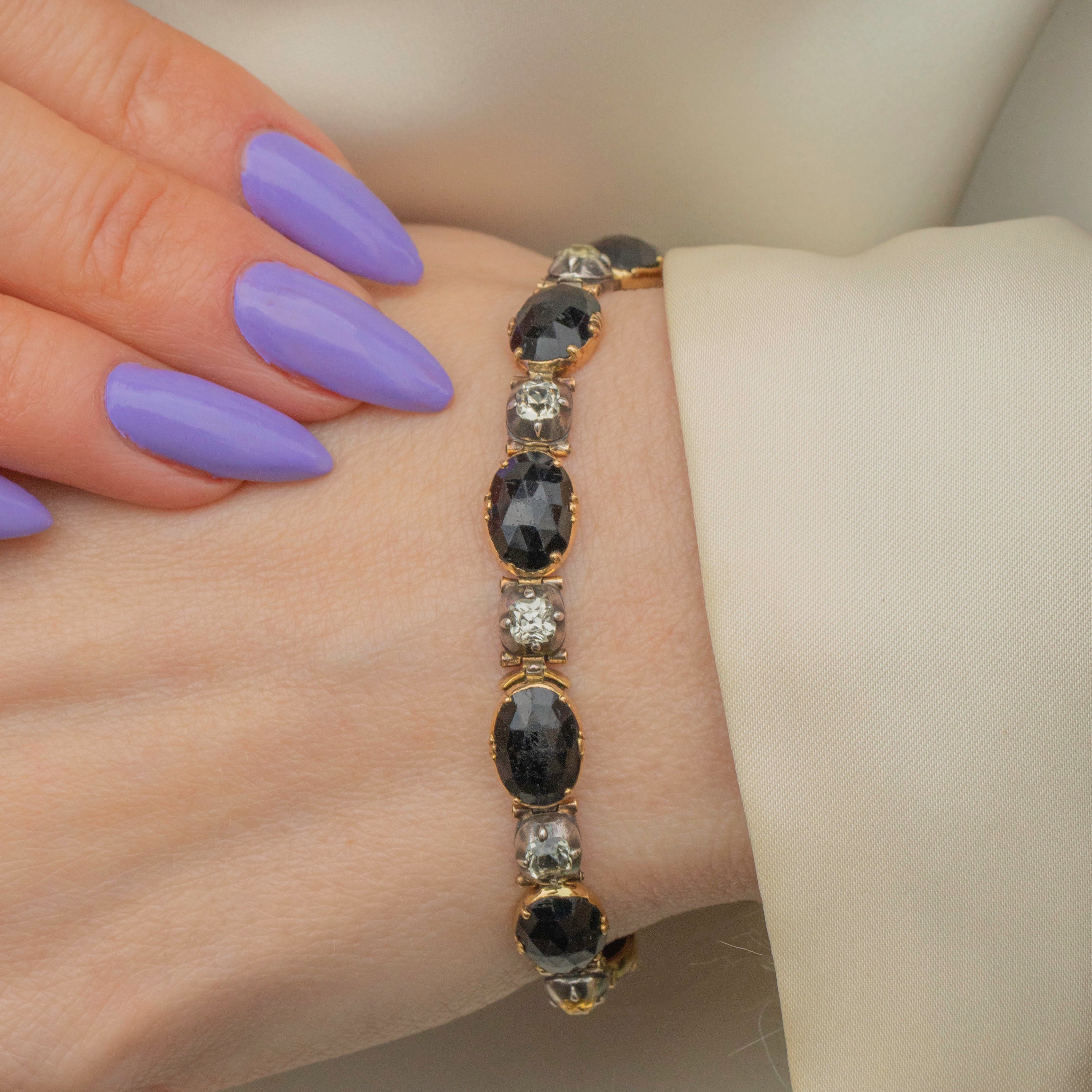 VERY GOOD: This stunning Georgian 18ct Gold French Jet bracelet is in very good condition. The gemstones are all present and securely set, with only some minor fleabites commensurate with age. The Gold is bright and buttery, and the Silver is lustrous with a light patina accrued over the years, adding to its antique charm. With each link securely connected and the clasp in fine working condition, you can wear this Georgian bracelet with absolute confidence!
