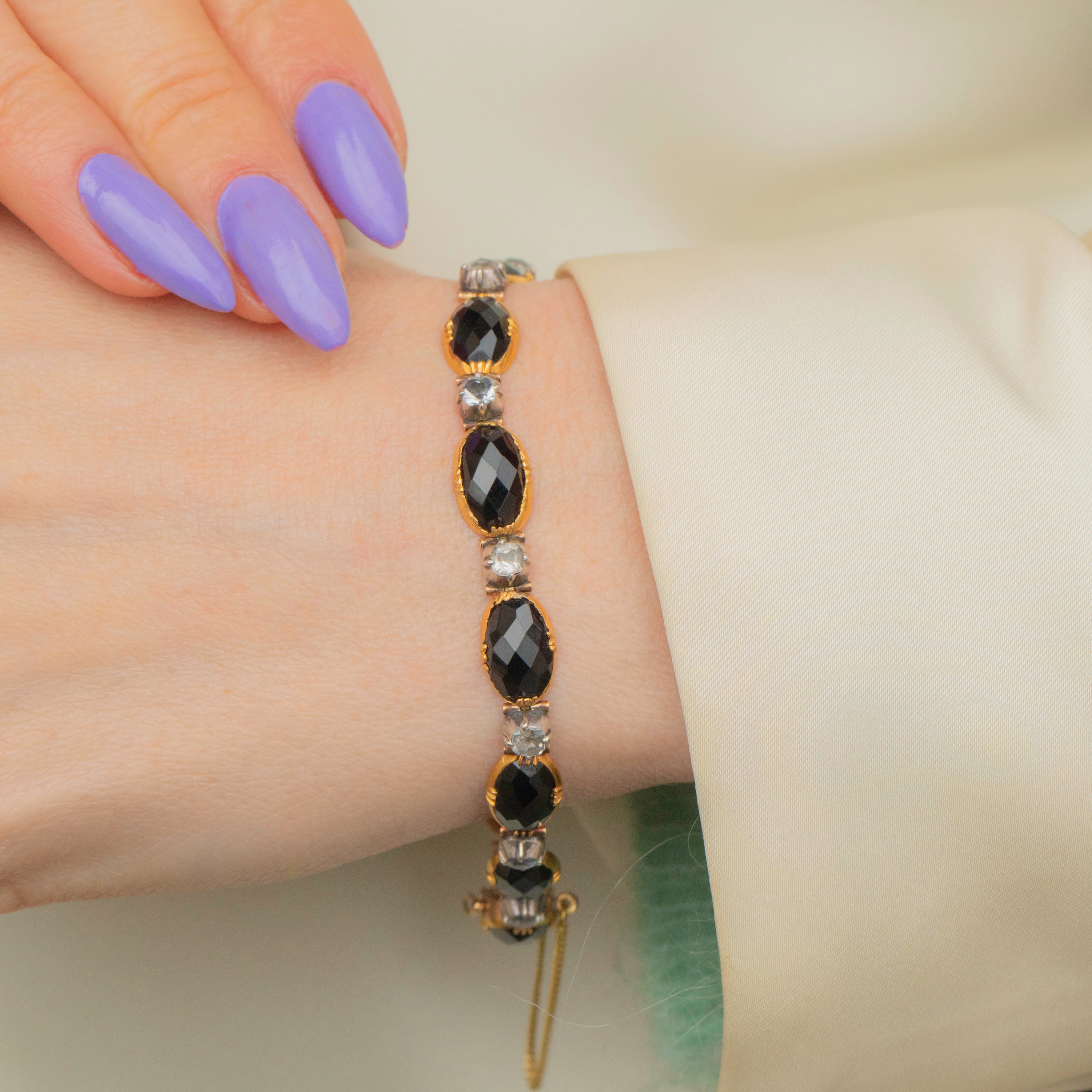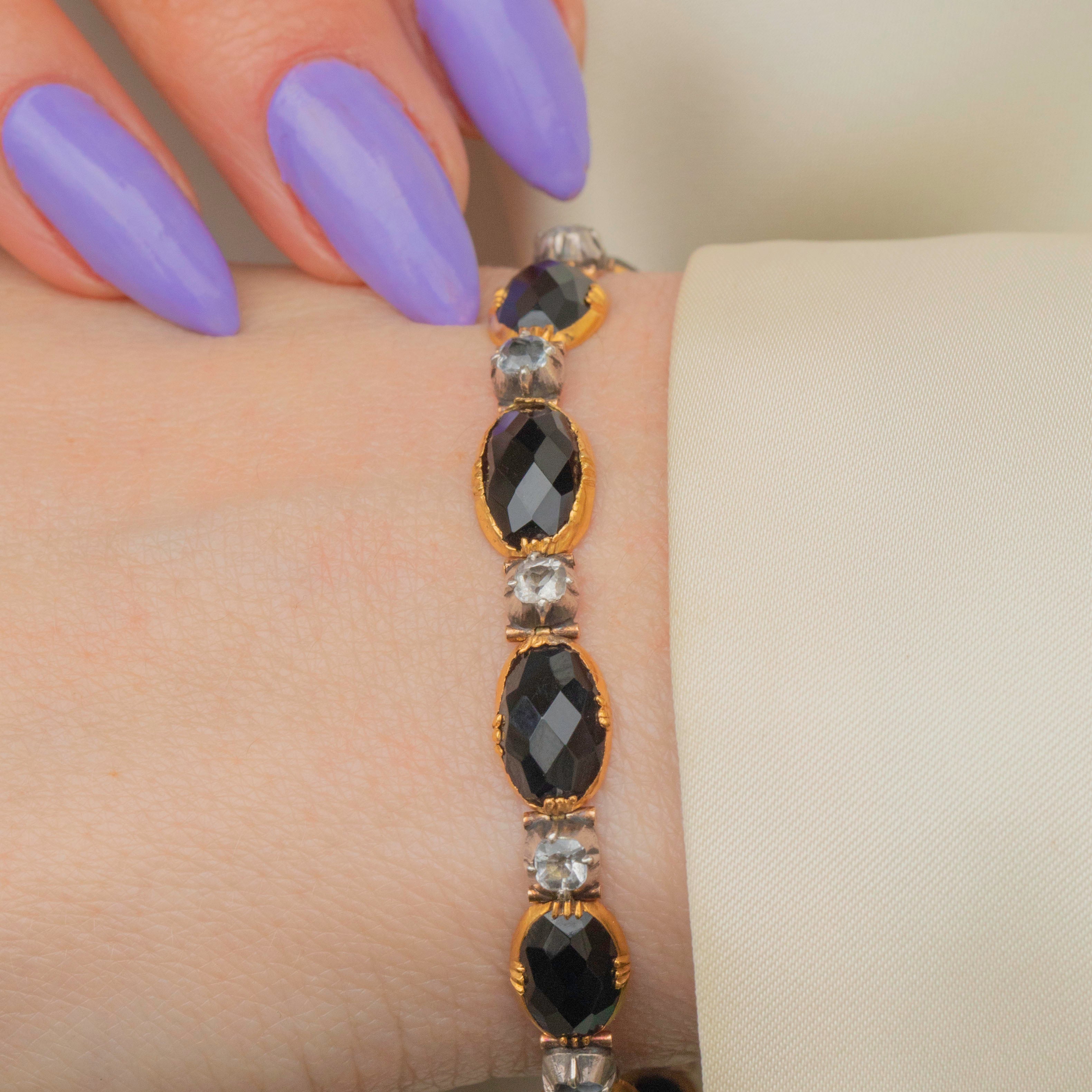 This Georgian 18ct Gold French Jet bracelet will look resplendent adorning your wrist! The combination of alternating ink-black Jet and bright white Paste makes for an elegant pairing, their crisp-cut facets catching the light magnificently.