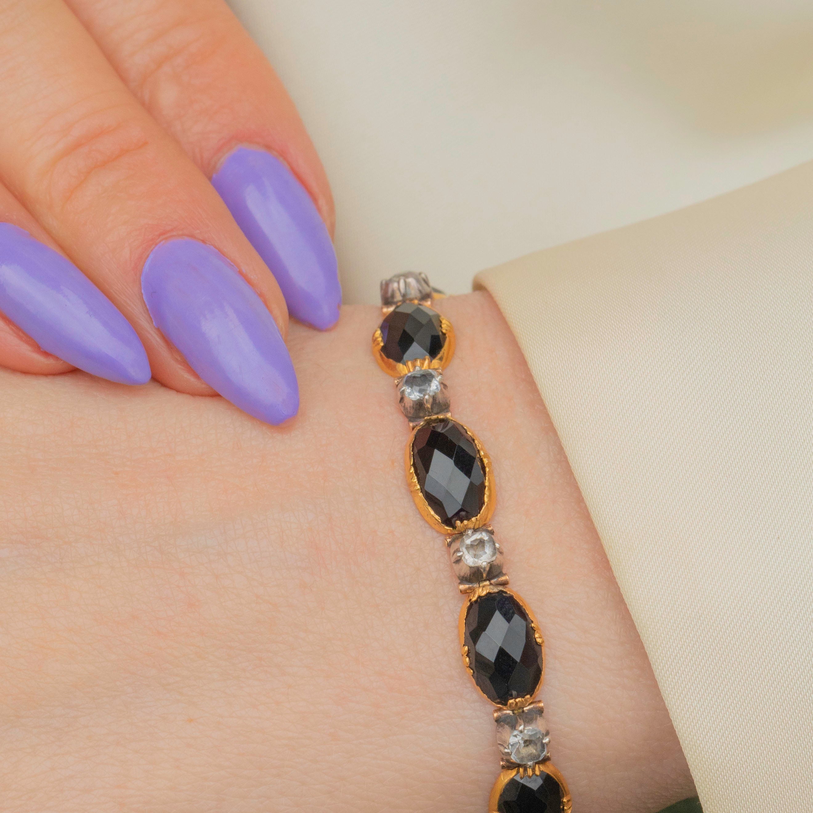 The craftsmanship is truly exquisite, with each Paste set in classically Georgian Silver piecrust settings and the Jet displayed within decorative 18ct Gold bezels. Each link is connected with a hinge that promises secure wear and many more years of enjoyment!