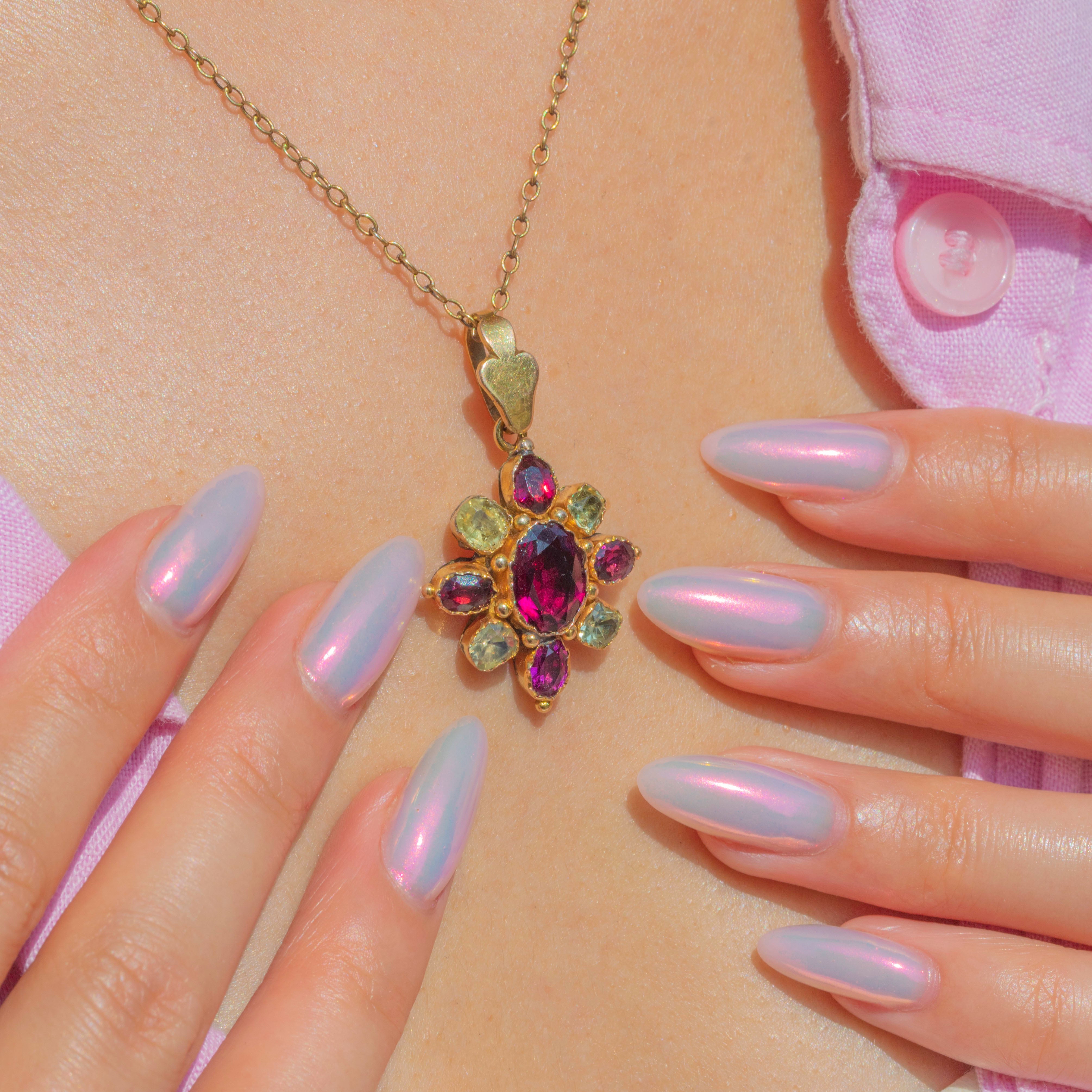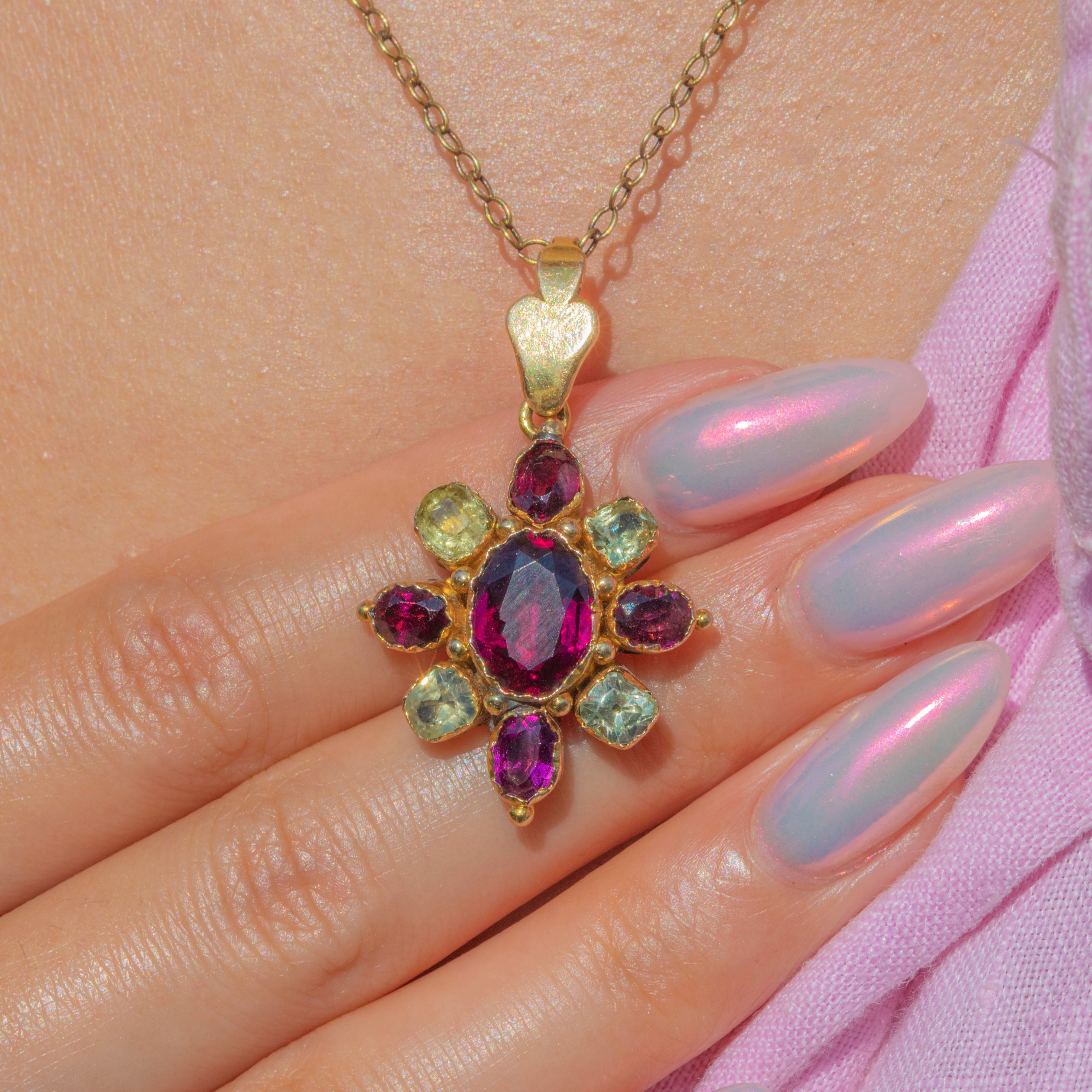 This glamorous antique cluster pendant dazzles from all angles, with each radiant gemstone faceted wonderfully, with a contrasting mixture of warm and cool tones. The Garnets and Chrysoberyl are set in buttery 18ct Gold bezels, with smooth backs and an elongated, elegant bale that allows for comfortable and refined wear.